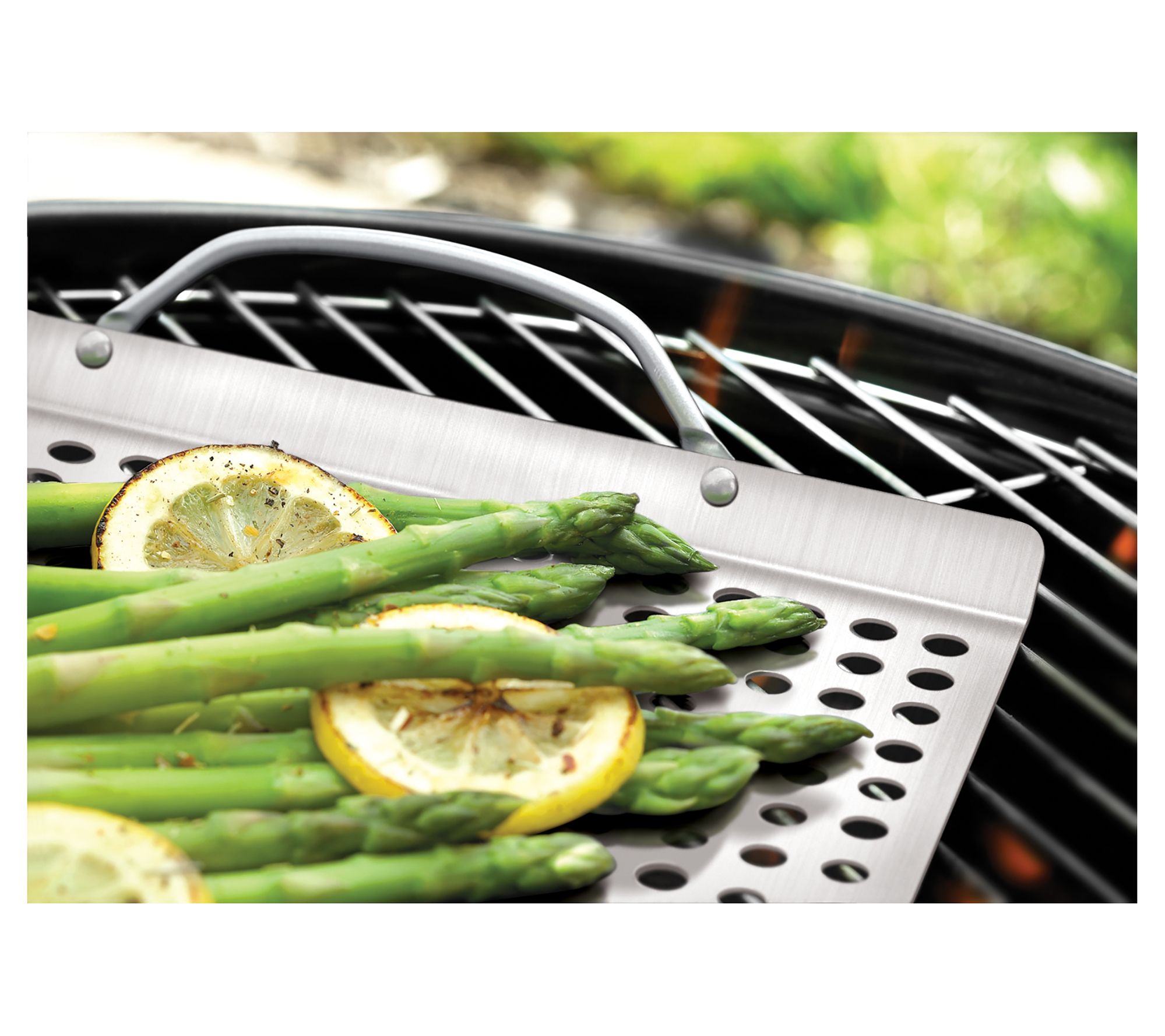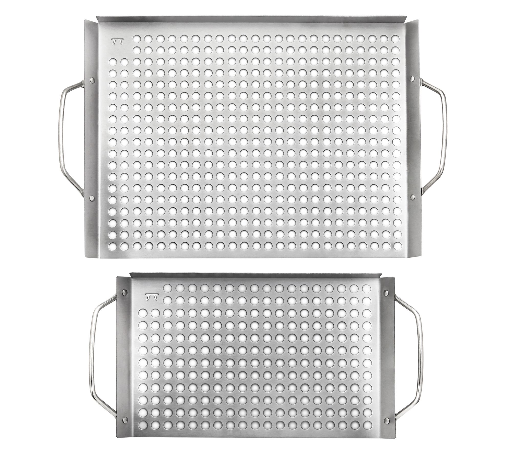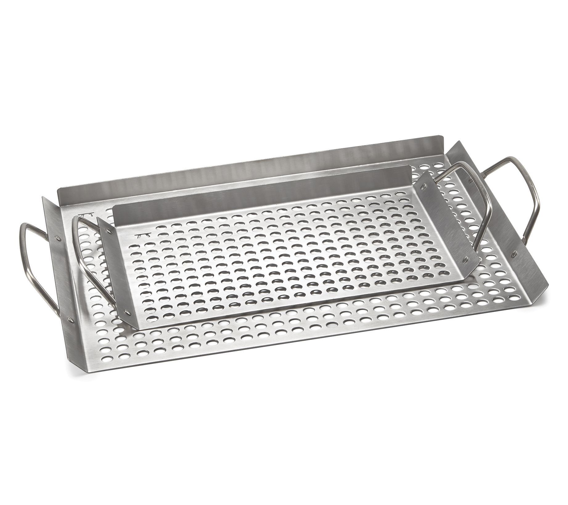 Transform your grilling experience with the Outset stainless steel grill grid set. Perfect for cooking delicate cuts of fish, meats, and veggies without the stress of ingredients falling through the grill, it offers unmatched ease and flavor enhancement. Enjoy the convenience of built-in handles that make transport a breeze. Crafted to endure high heat, this grill grid set promises durability and easy cleanup, whether by hand or in the dishwasher. From Outset.