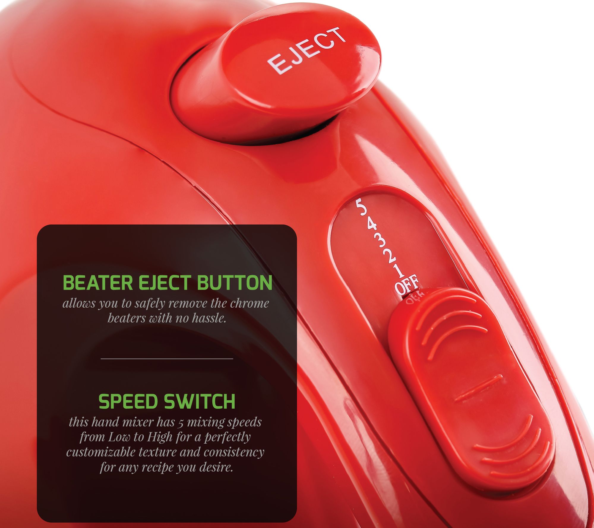 Just beat it! Or mix it. Or whip it. However you do it, this electric hand mixer makes it easy. It's equipped with five speeds to accommodate any kitchen task and includes a snap-on storage container for convenient storage. From Ovente.