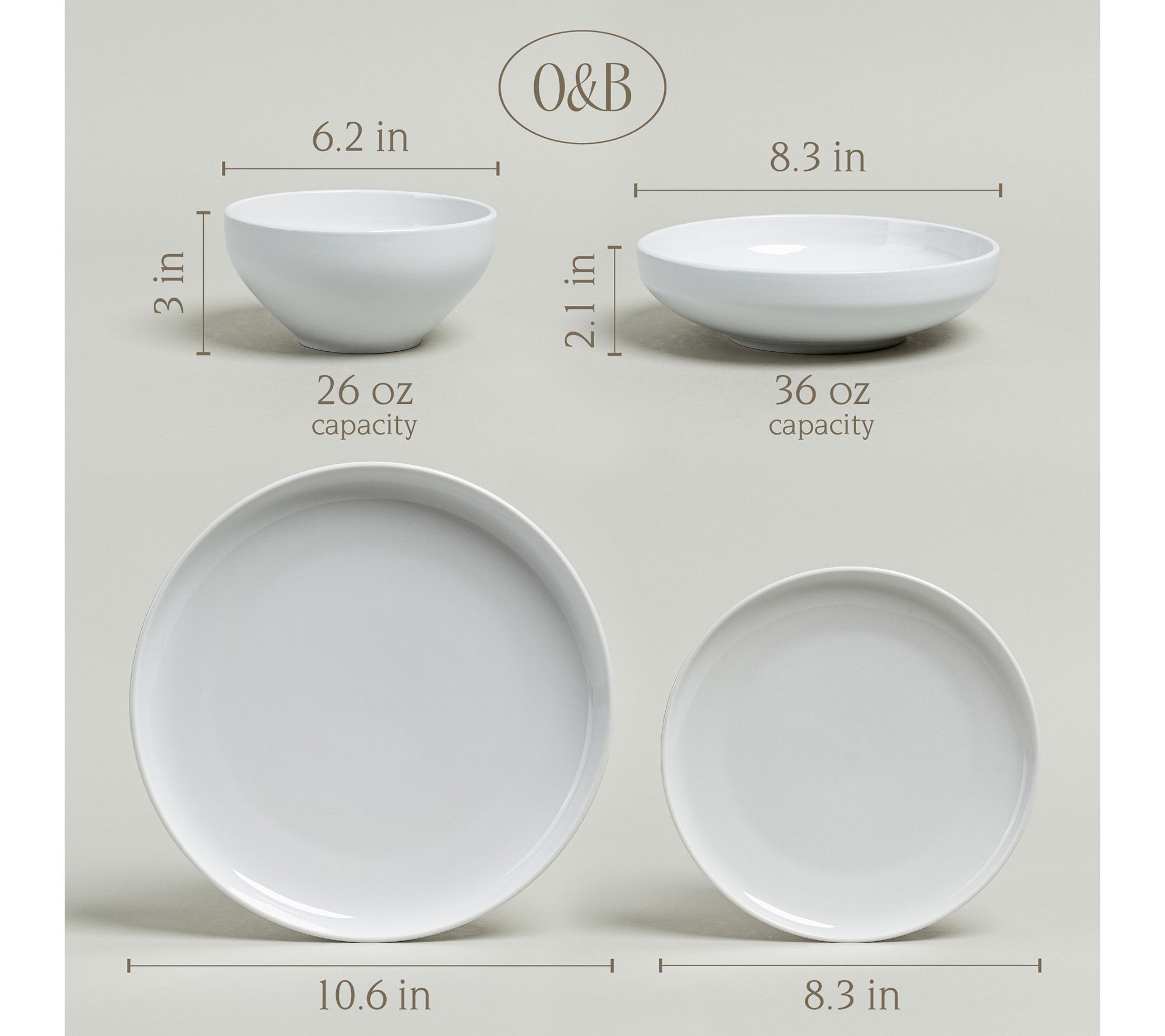 • Includes four 10.6" dinner plates, four 8.3" salad plates, four 36 oz dinner bowls, and four 26 oz cereal bowls