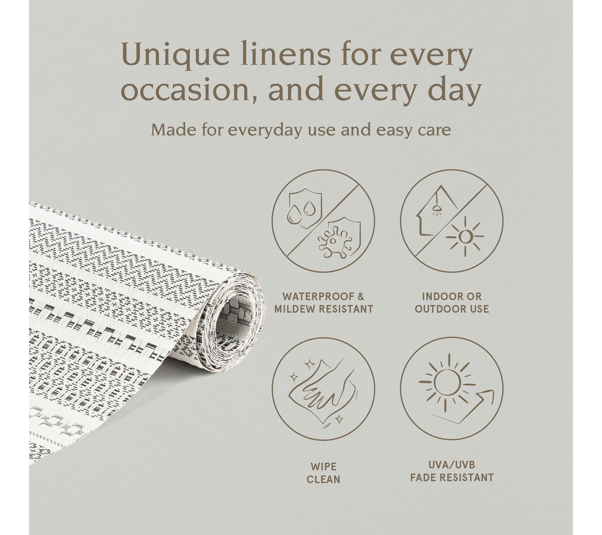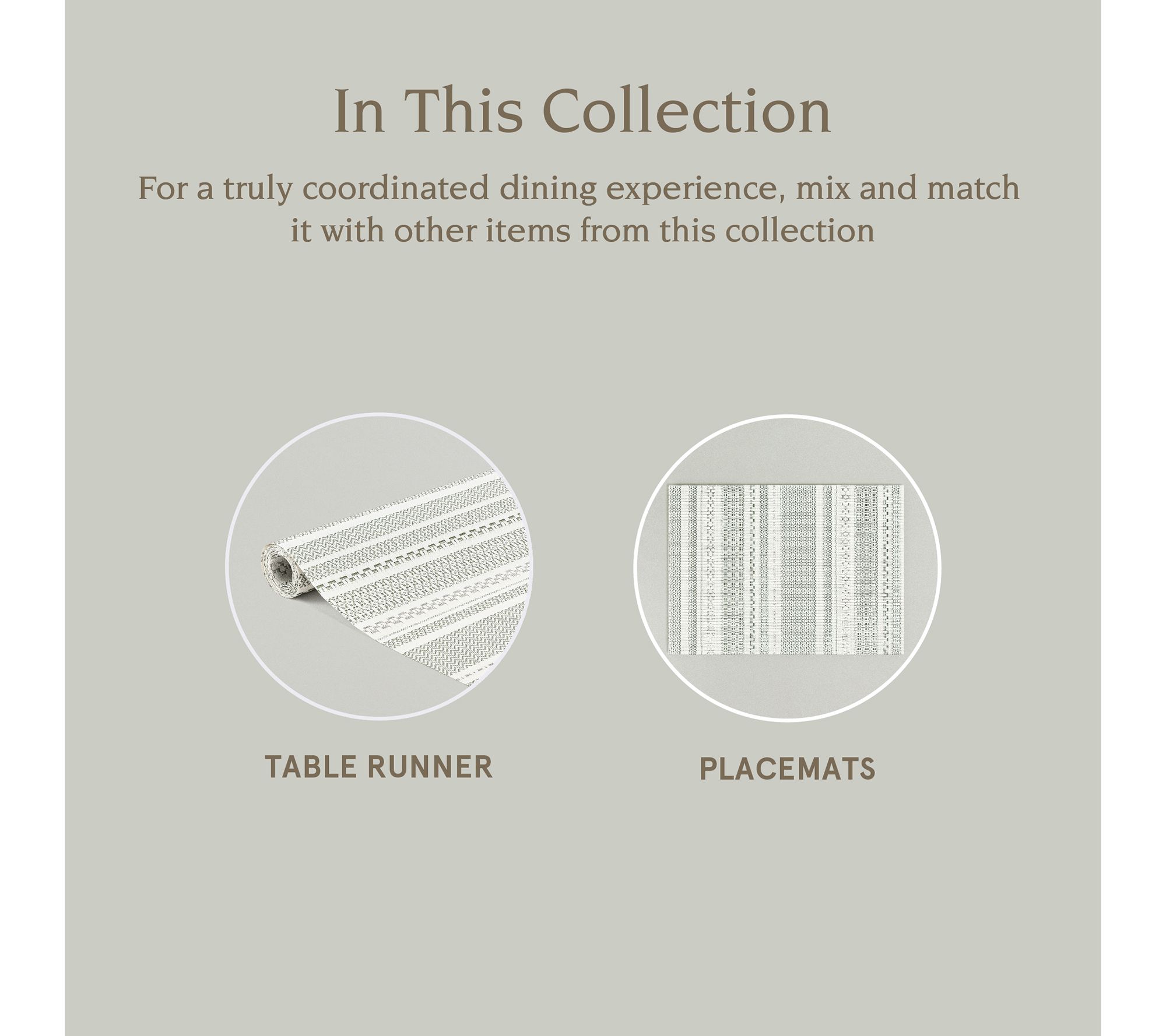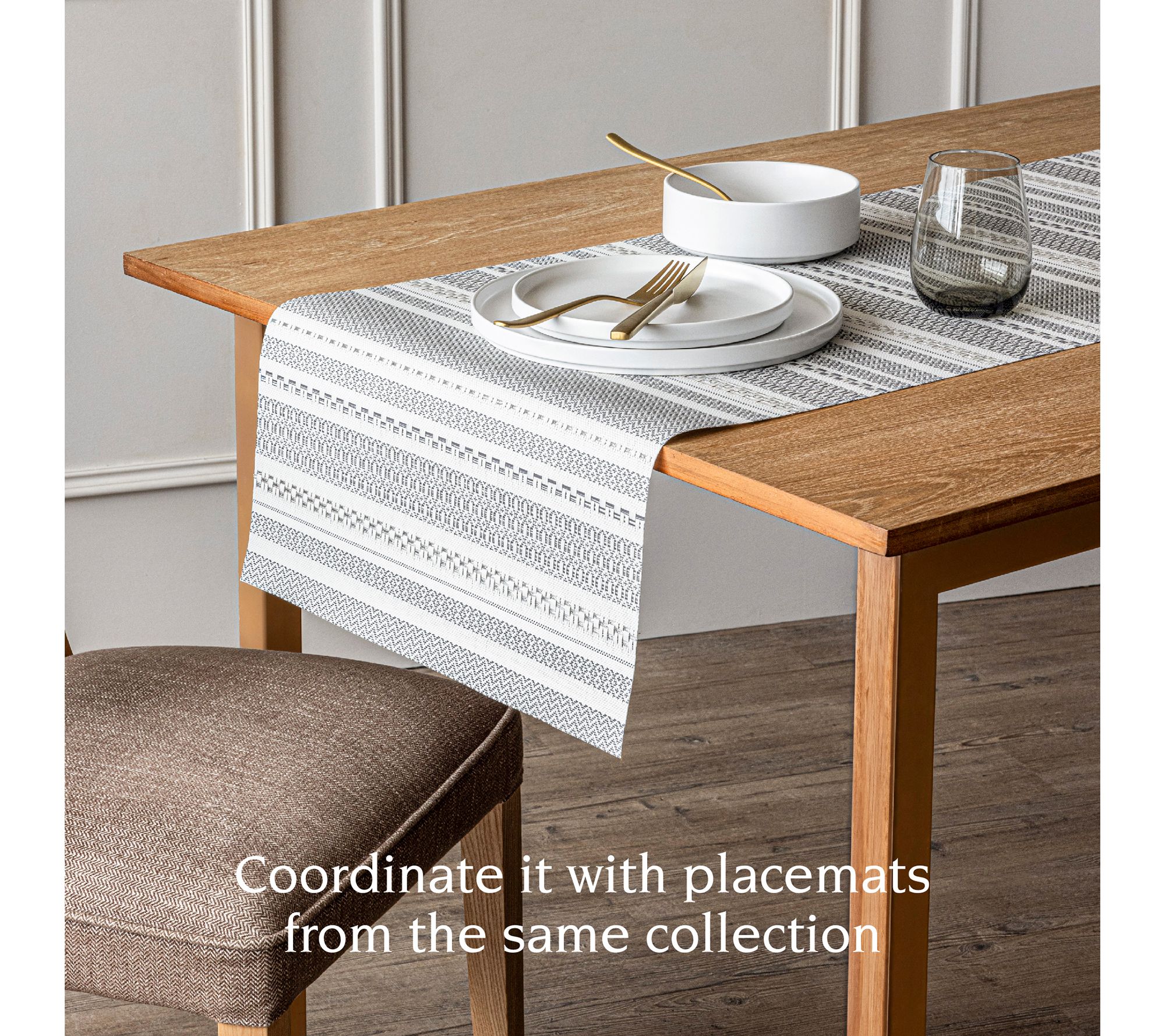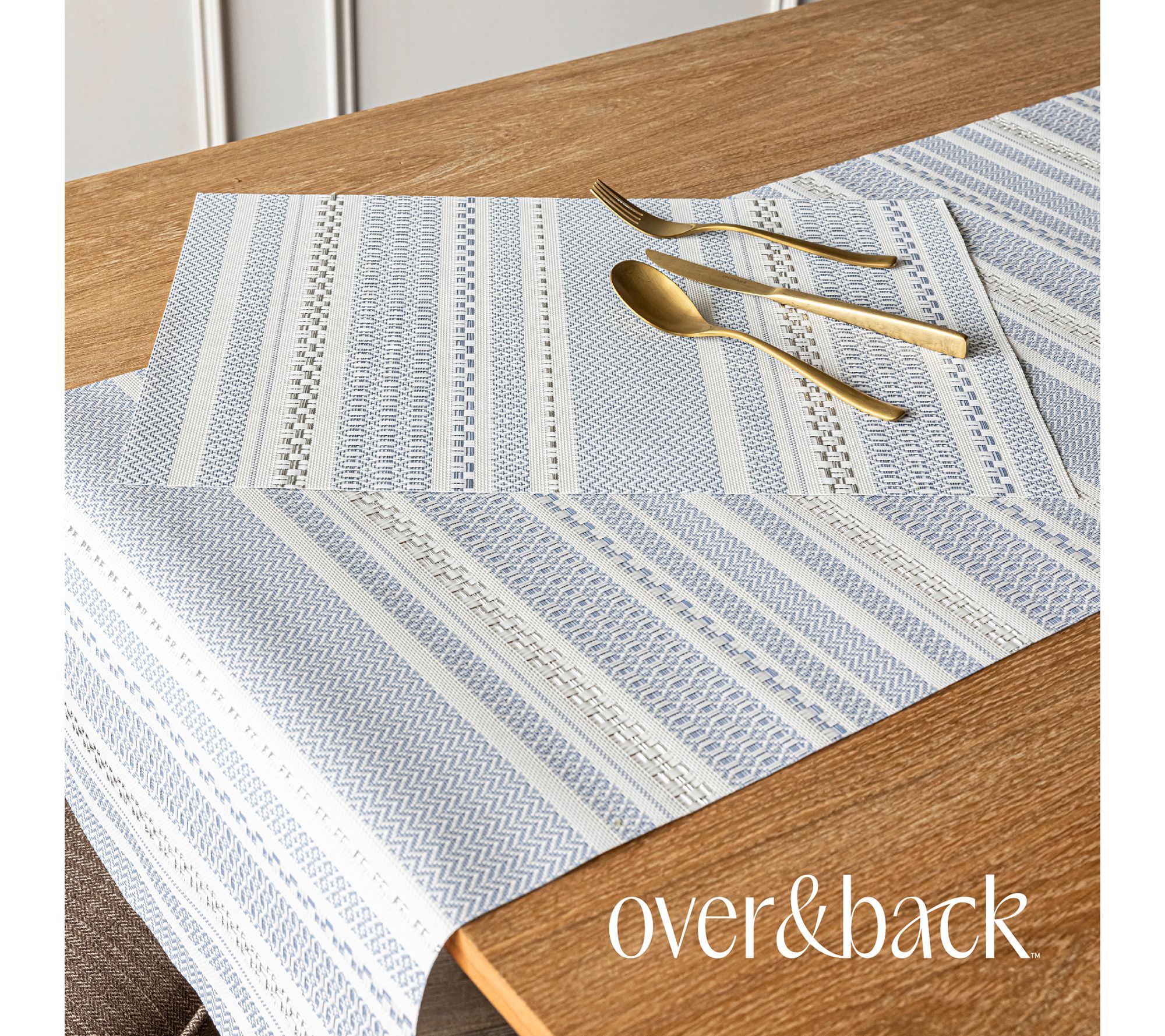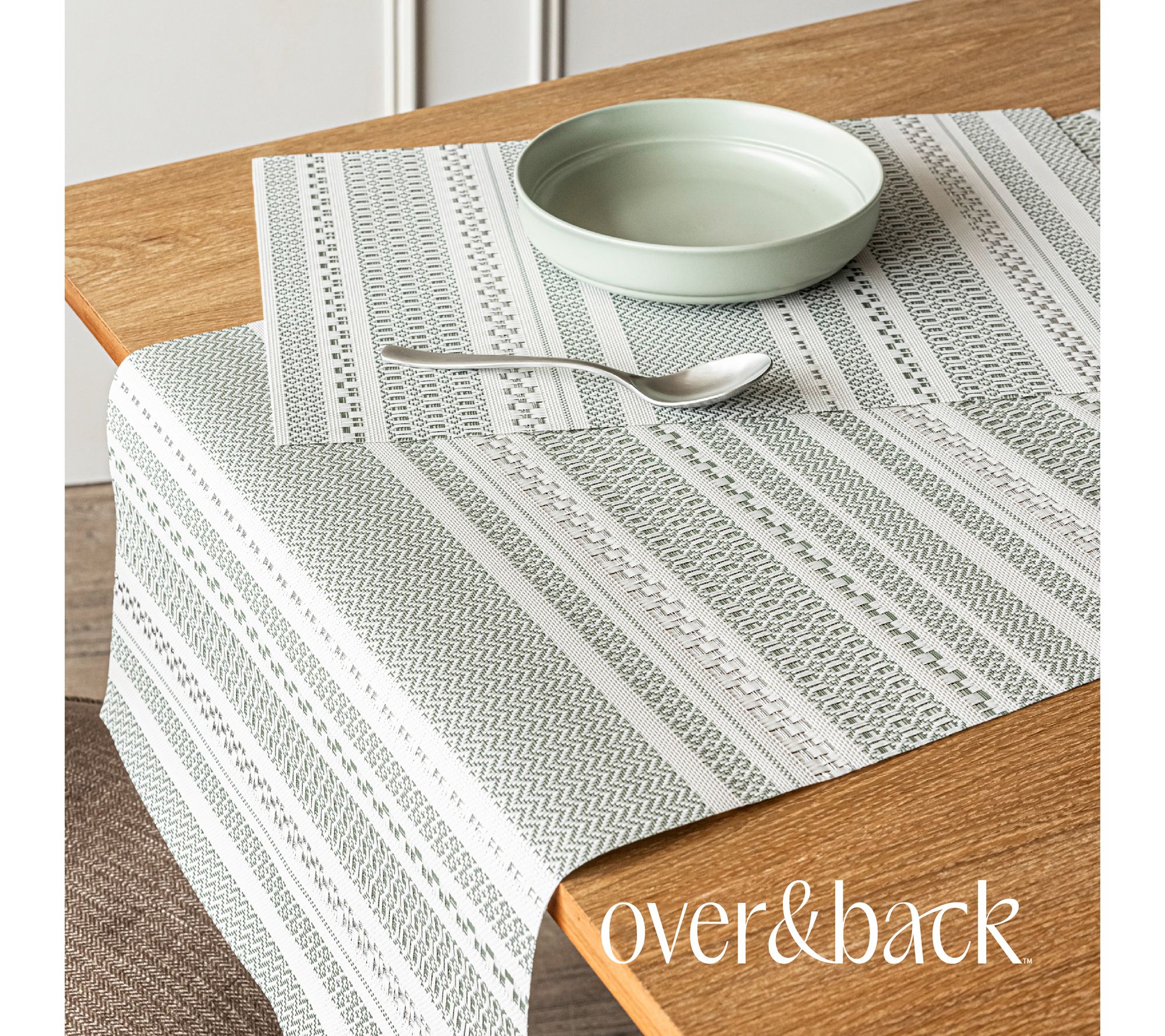 Add charm to your dining setup with the Over & Back 18" x 90" striped table runner. Ideal for both indoor and outdoor use, this table runner won't fade, even under the harshest sunlight. Effortlessly blend it with any of your favorite tabletop pieces. From Over & Back.