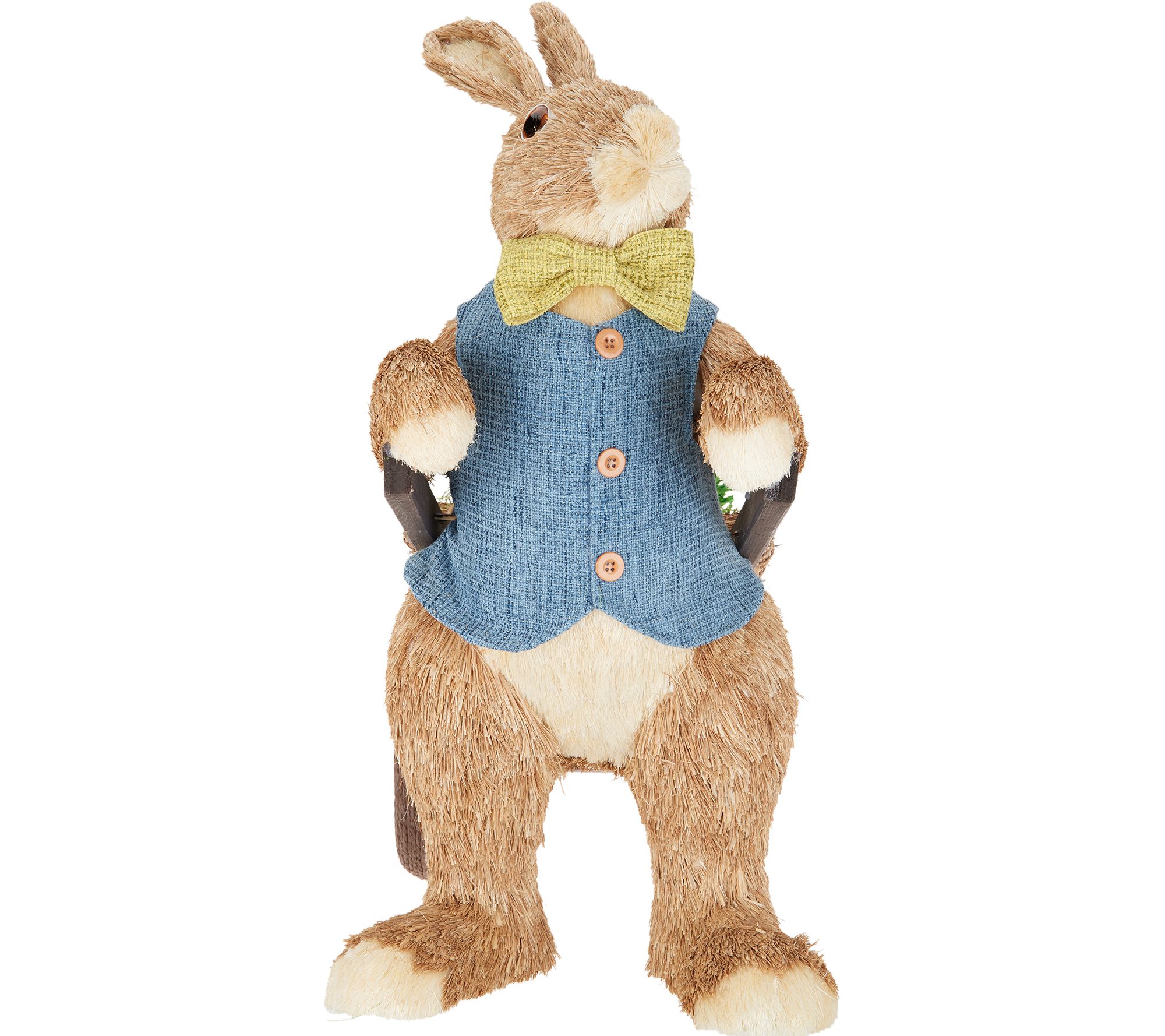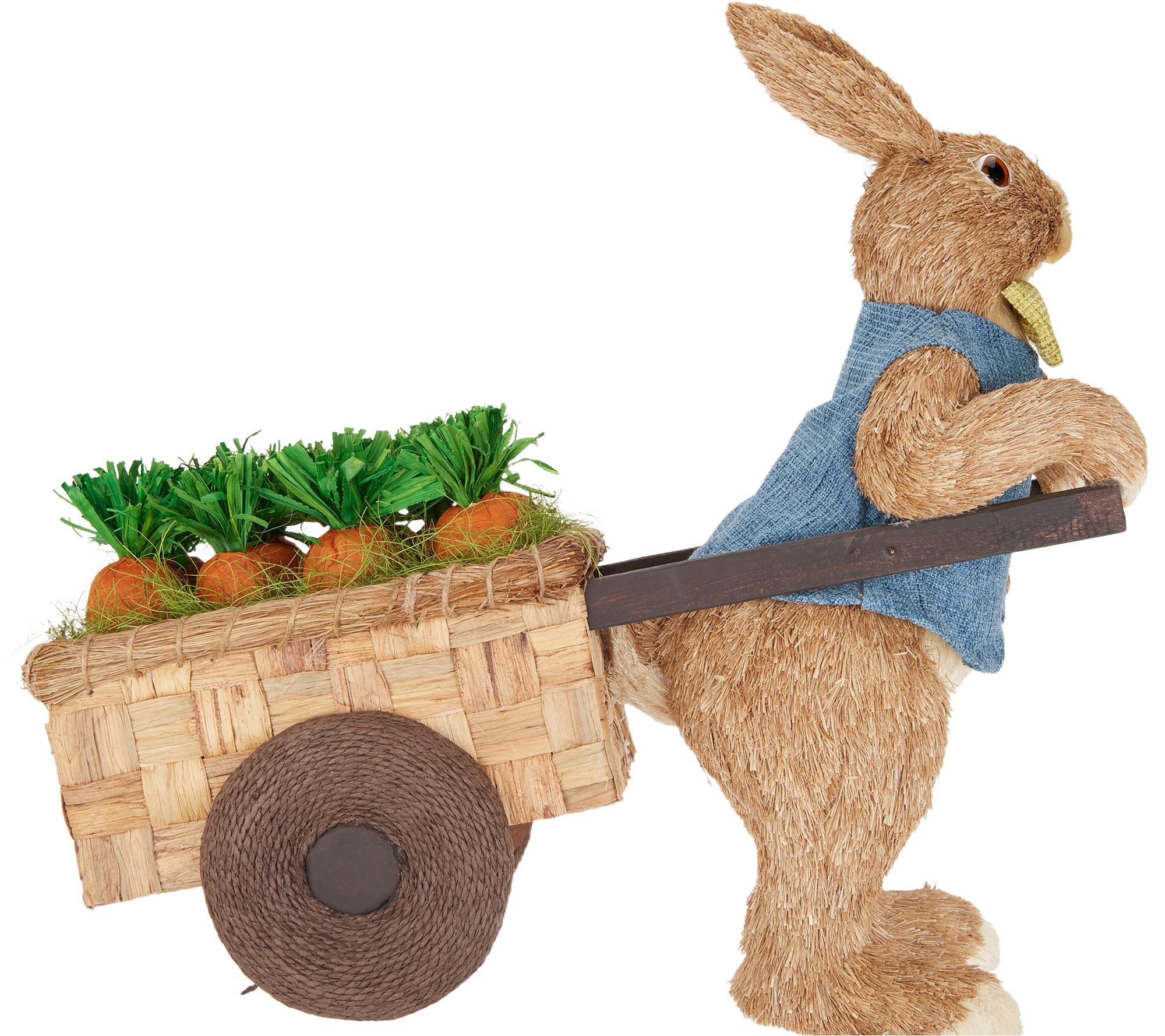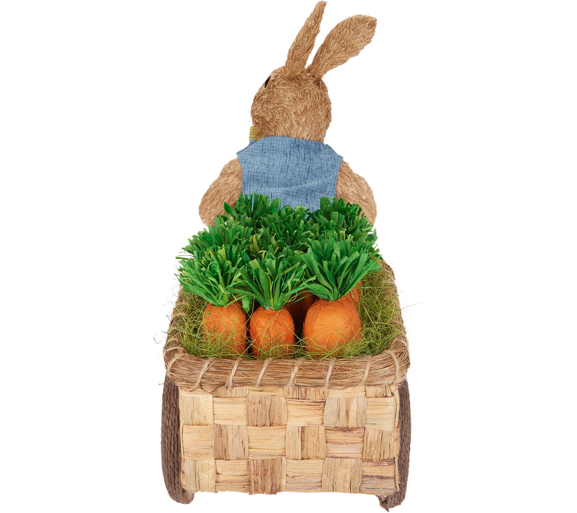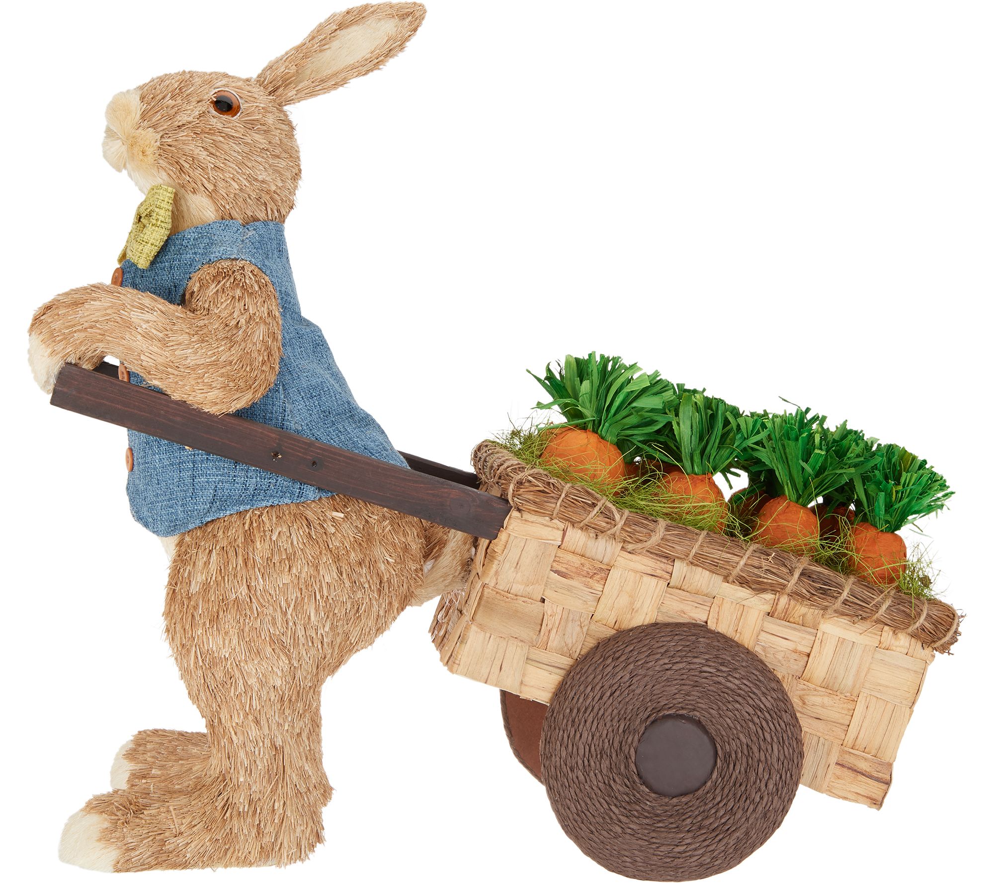 • Wears blue vest and green bow tie, pulls woven basket cart with wooden accents and a dozen decorative carrots, wheels accented with twine