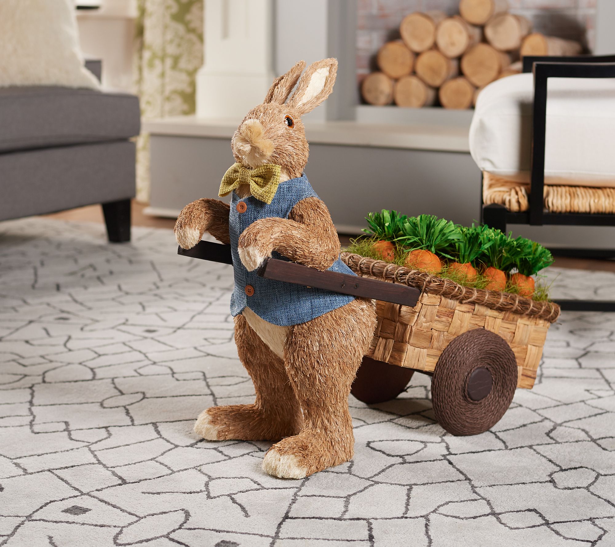 Oversized for pure fun, this sisal bunny bounces his way into your heart and home this spring--pulling a cart of carrots! From the Valerie Parr Hill Collection.