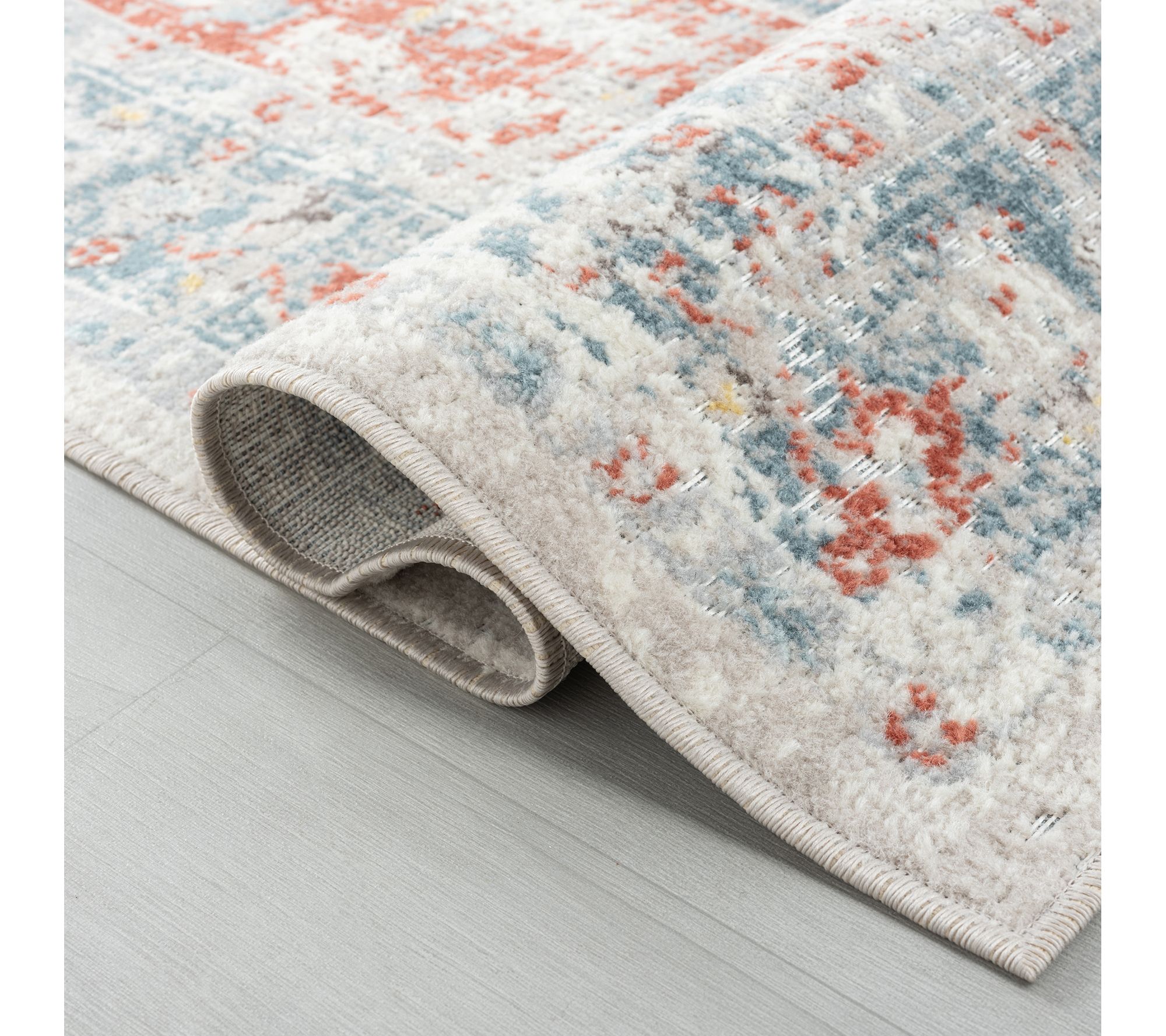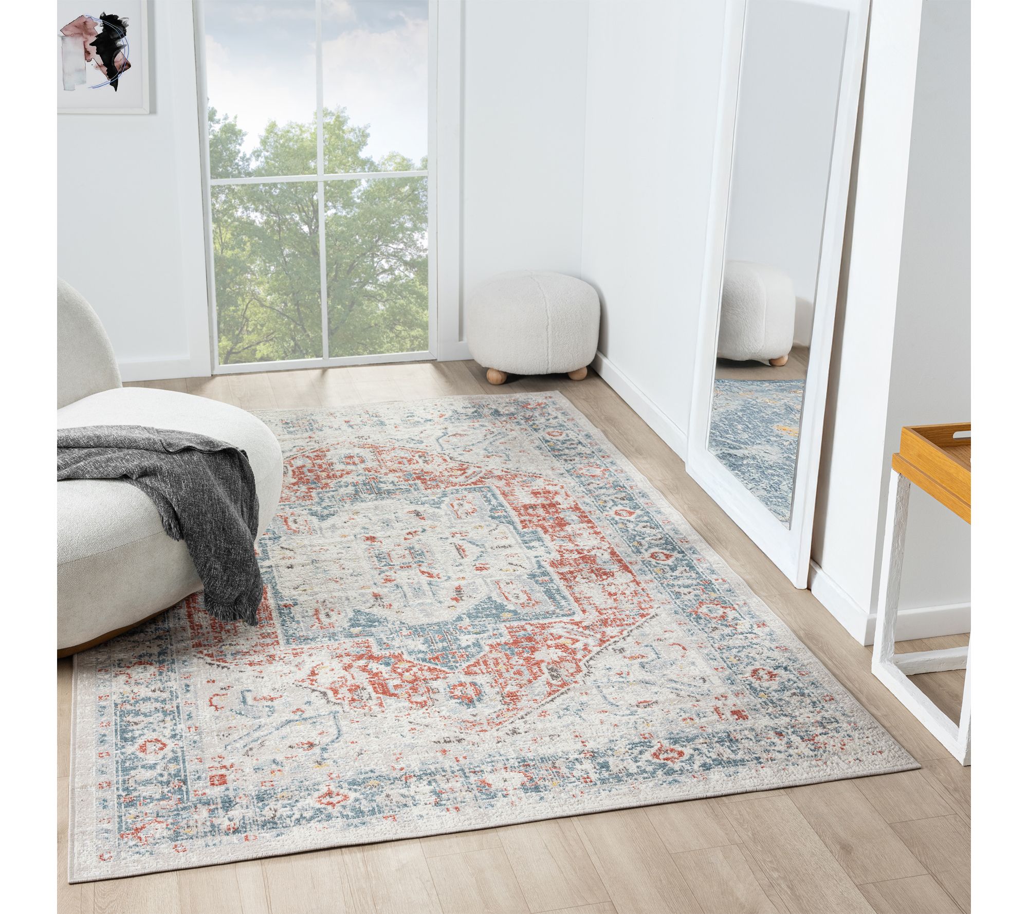 Whether it's sprucing up your sunroom or bringing style to your patio, this versatile area rug adds color and comfort wherever you lay it down. The bordered medallion design in blue and rust offers a welcoming foundation for gatherings, while the durable, power-loomed construction stands up to busy days with kids and pets. From Ox Bay.