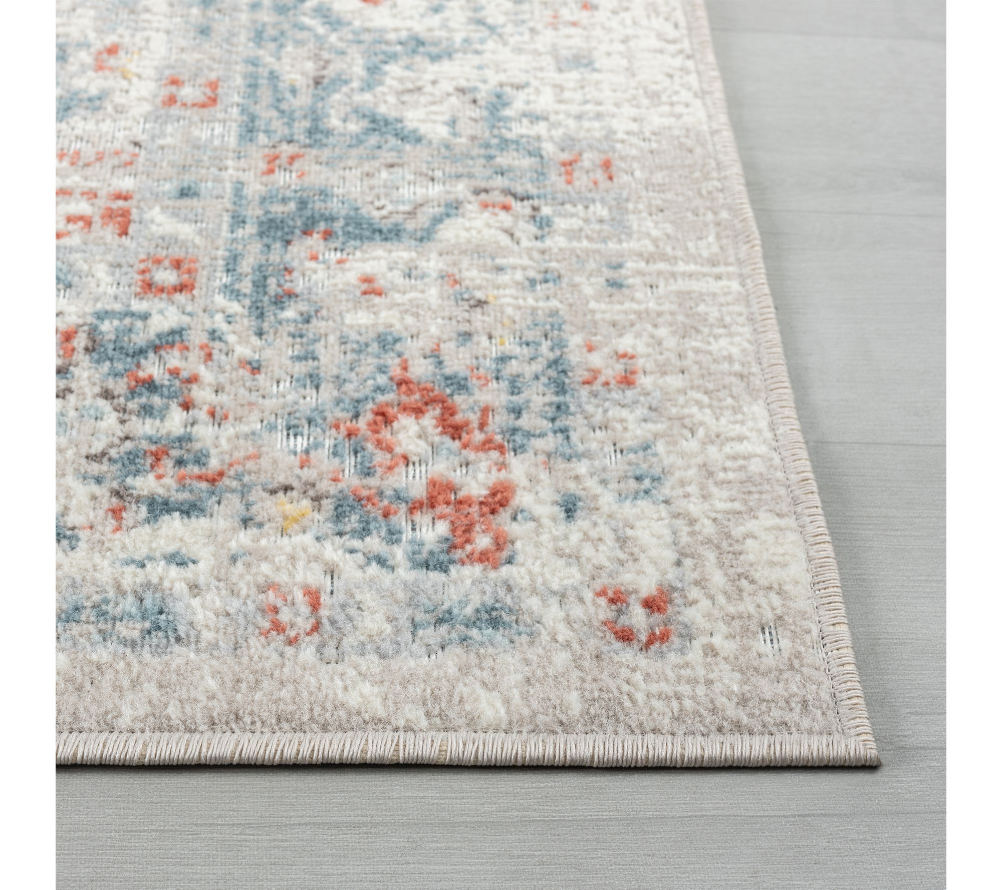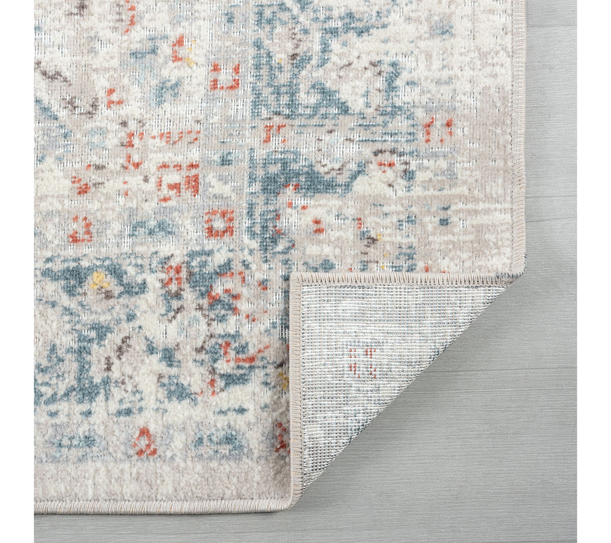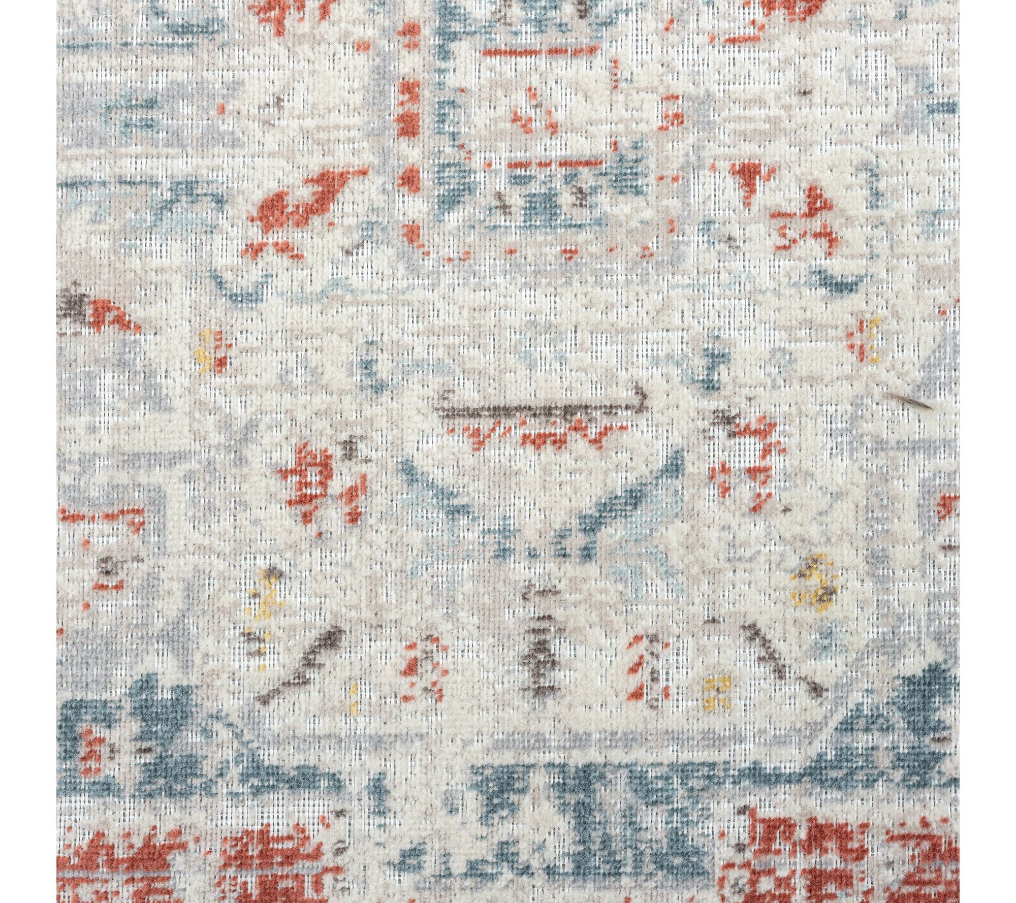 • Bordered faded medallion design in blue/rust