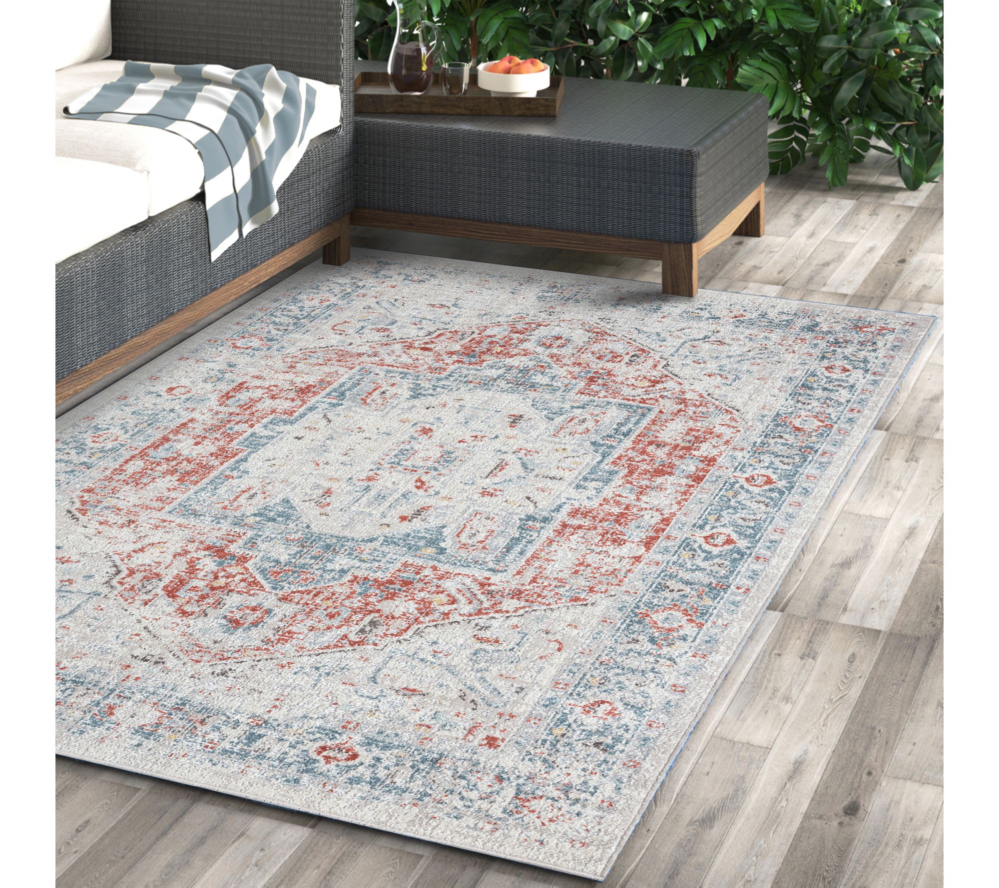 Bring classic charm to any indoor or outdoor space with this area rug, designed to handle busy family life and changing seasons. A bordered medallion pattern in blue and rust creates a striking centerpiece for your patio, sunroom, or living area while the low-pile construction makes cleaning up a breeze. From Ox Bay.