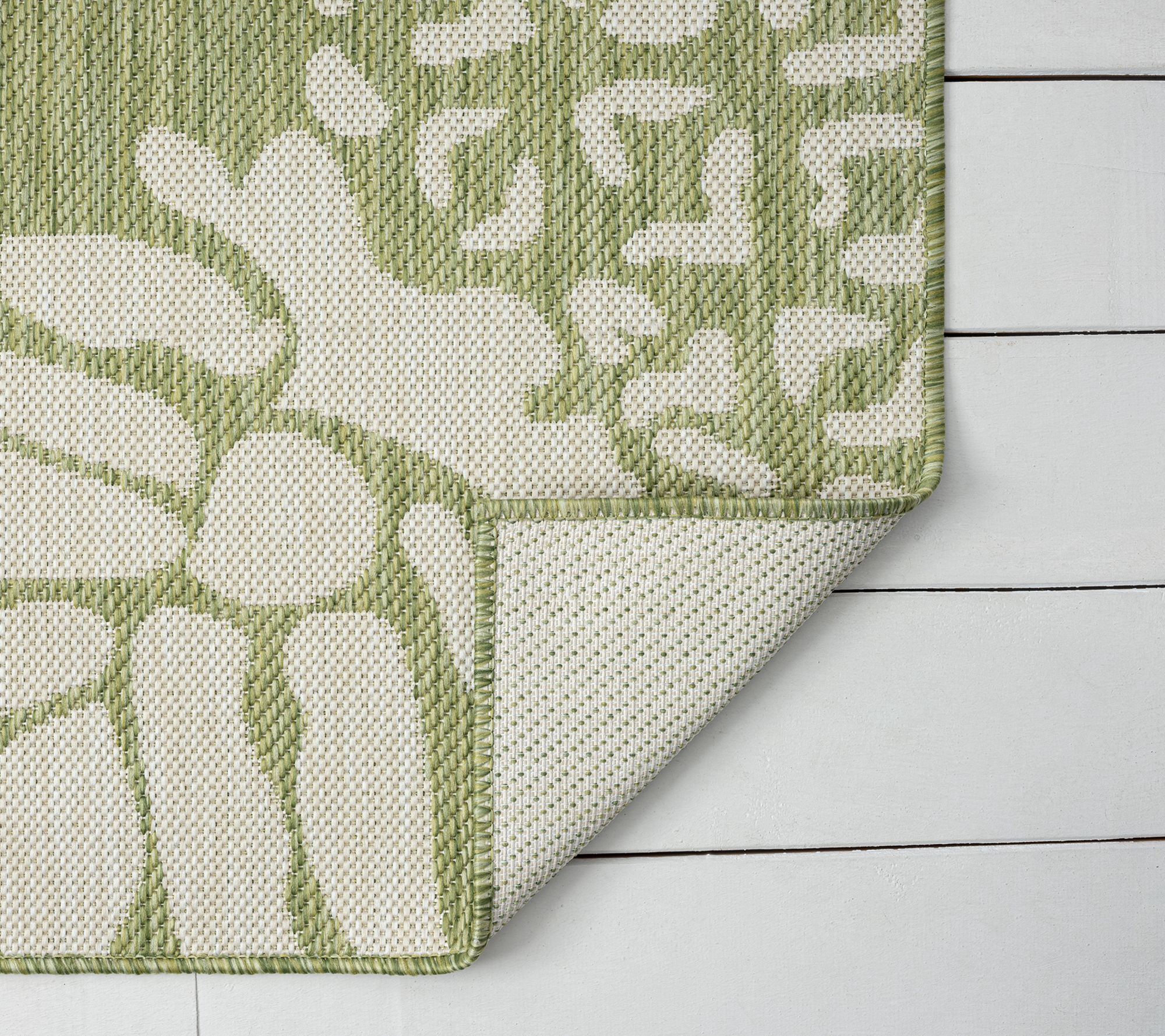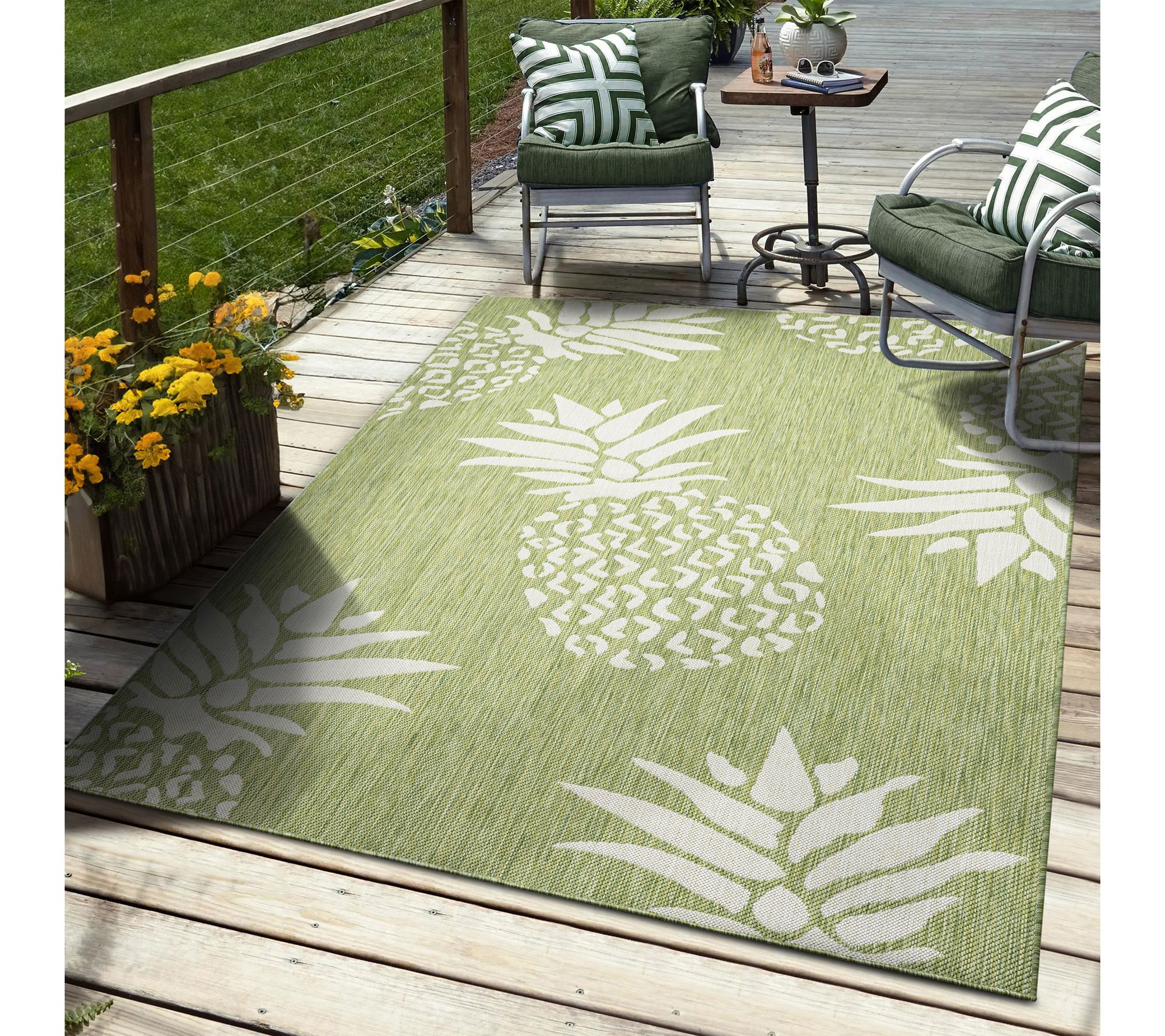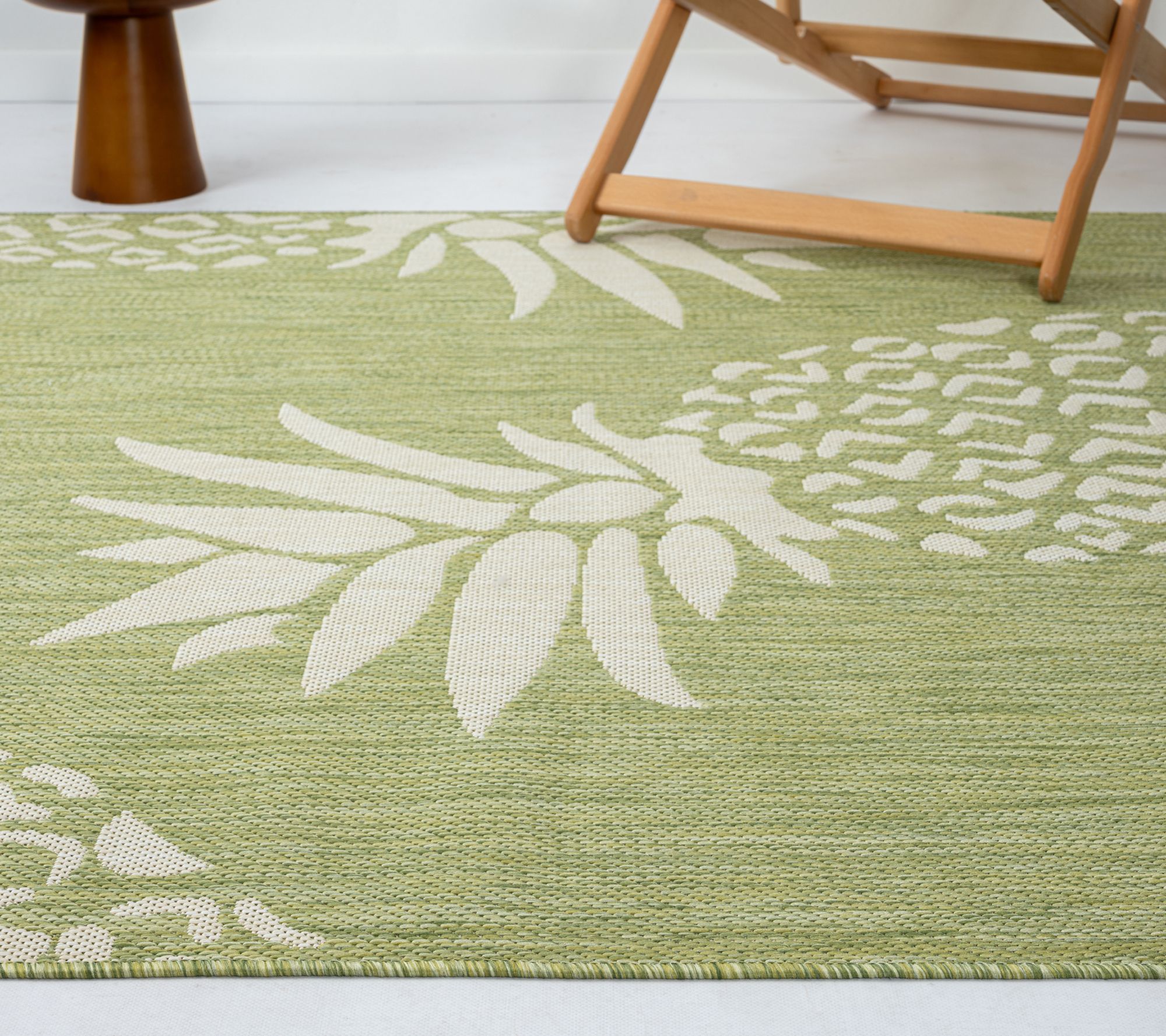 Transform your patio or entryway into a welcoming retreat with this outdoor area rug, featuring playful pineapple motifs in vibrant green and ivory hues. The durable power-loomed construction and easy-to-clean polypropylene make it a practical choice for high-traffic spaces, indoors or out. Add a stylish accent that brings a touch of the tropics to your home. From Ox Bay.