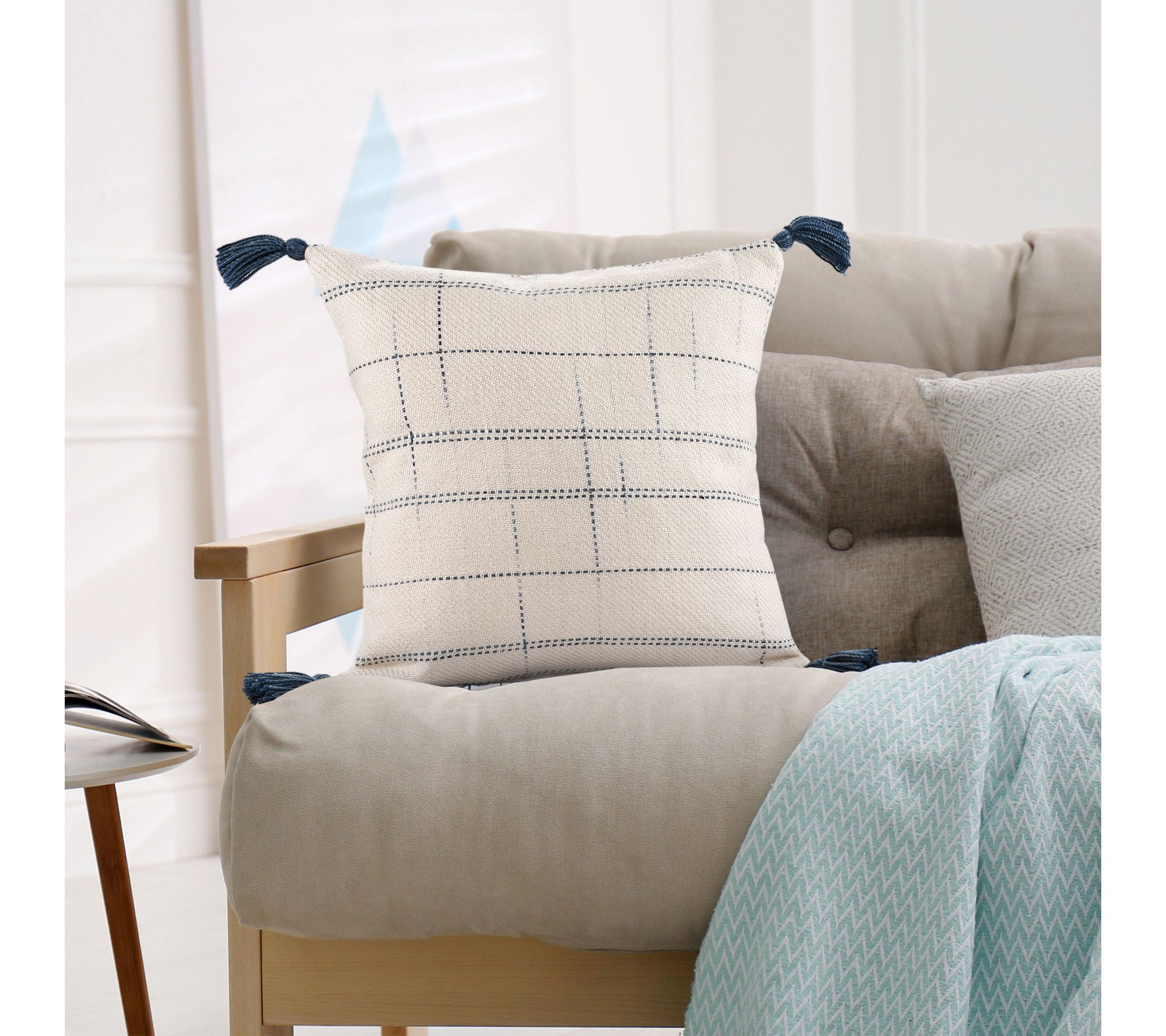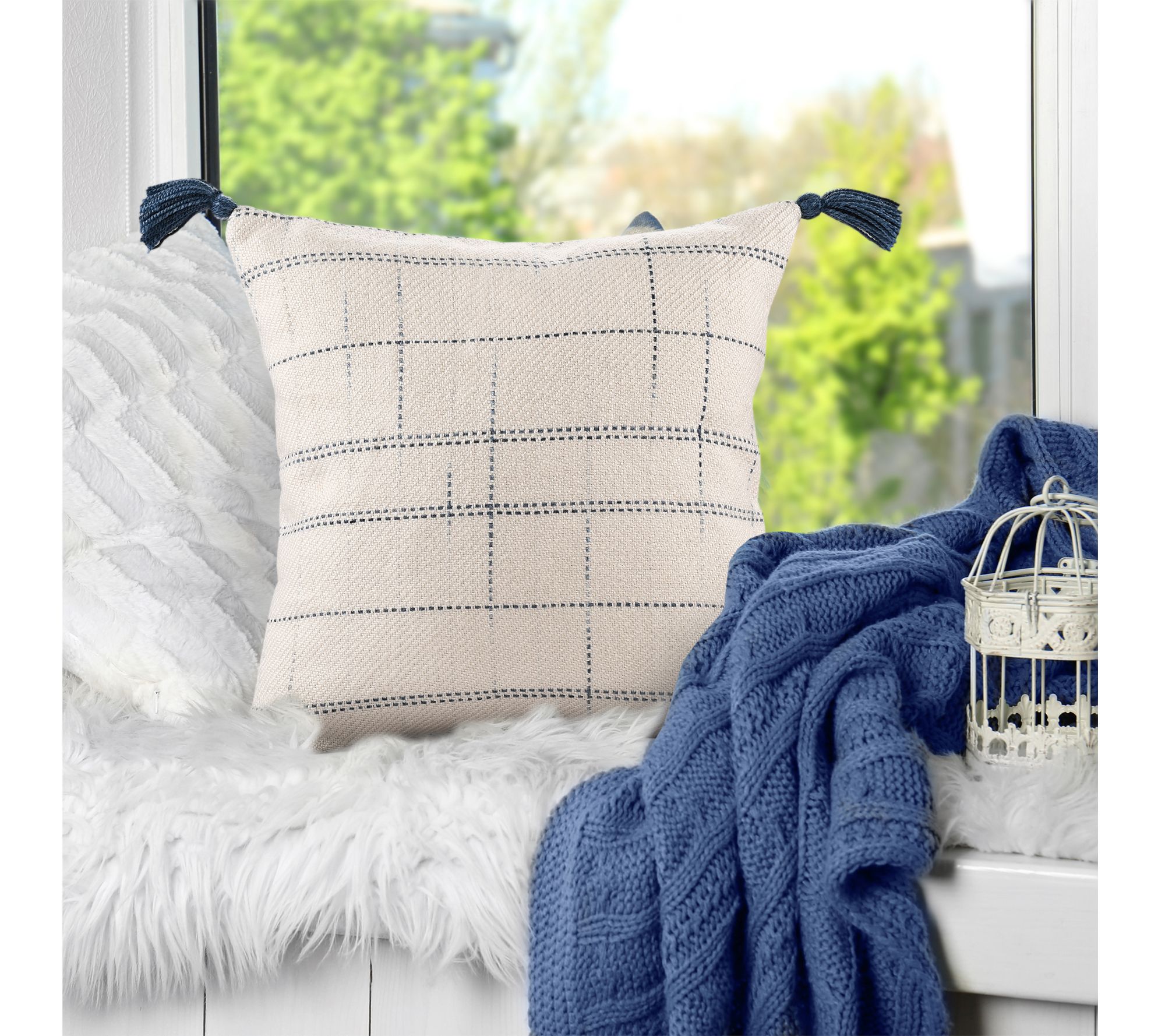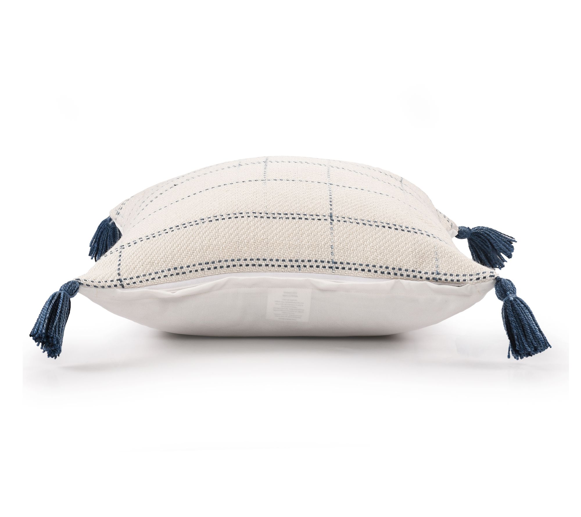 Settle into your favorite chair and feel the inviting comfort of this decorative pillow, where soft fill meets a stylish ivory and blue geometric design. Whether brightening up your bed or adding a touch of charm to your living room, the tassel accents and durable polyester weave make it an easy update for any space. From Ox Bay.