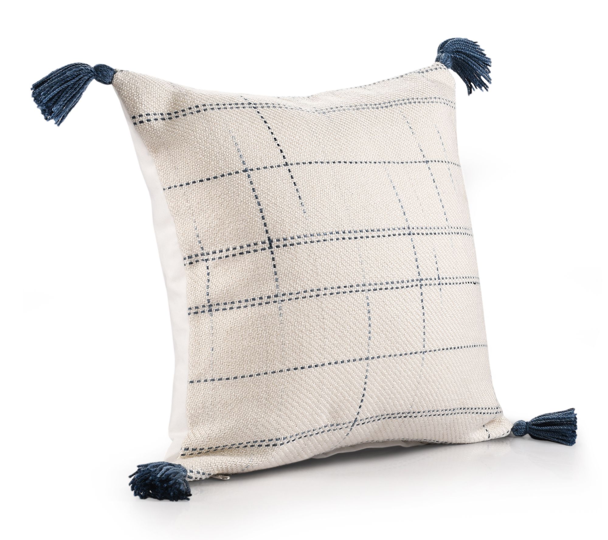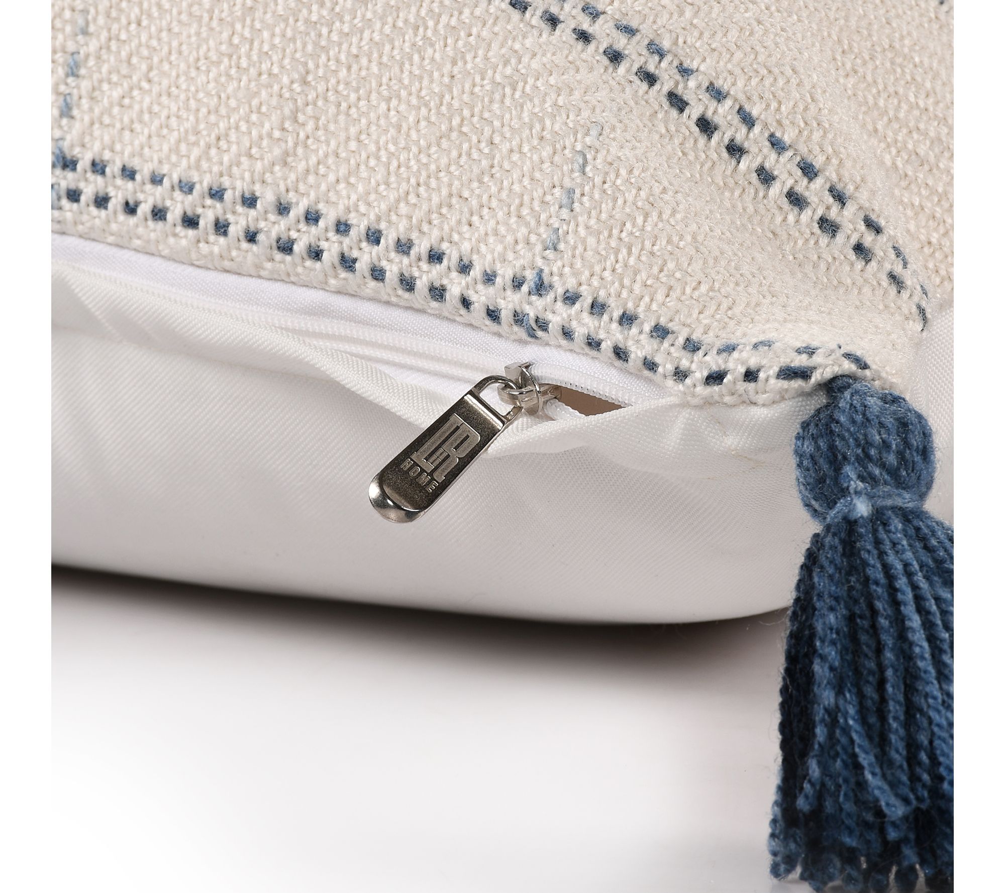 • Geometric ivory and blue pattern with tassel accents for a stylish touch