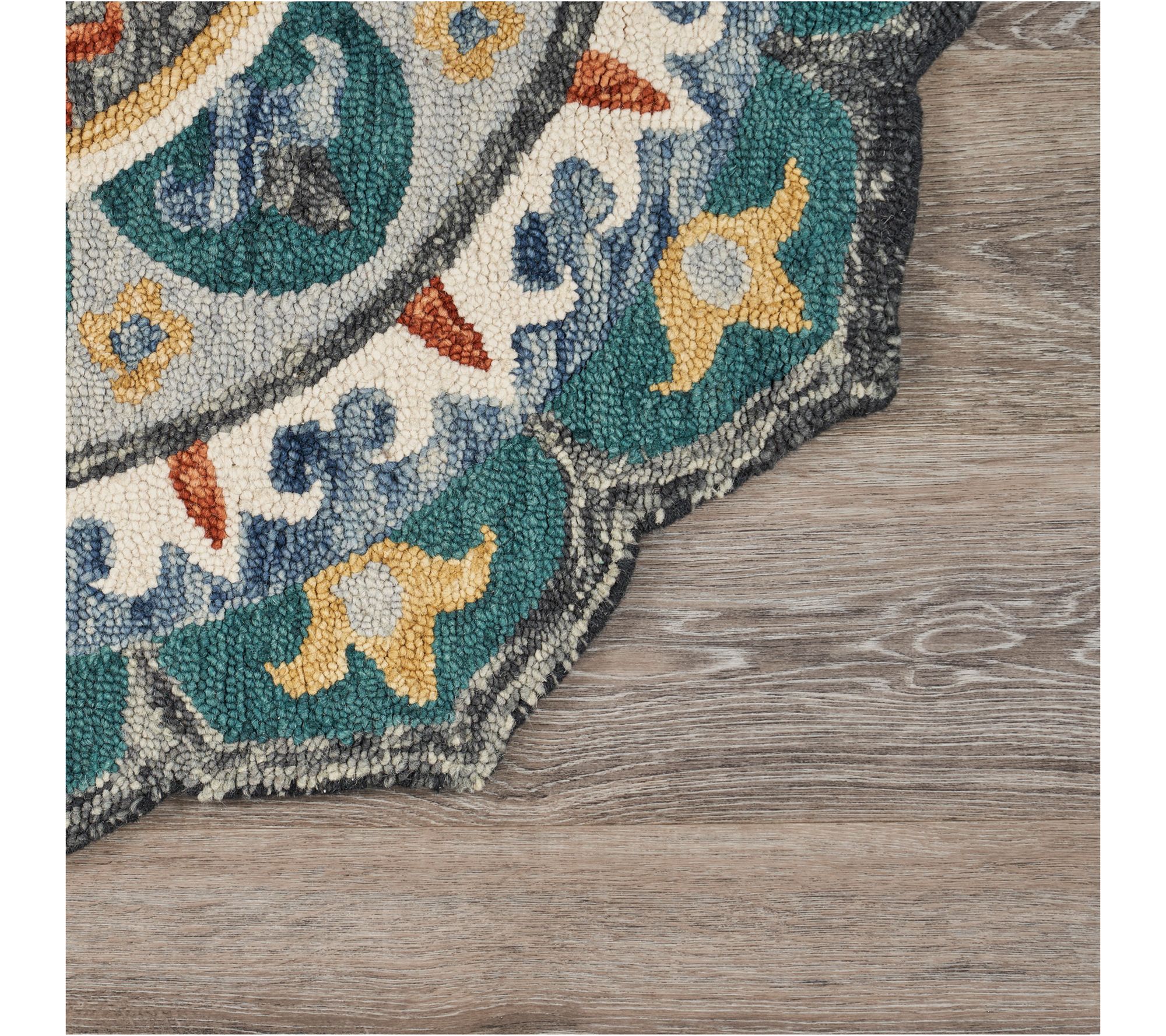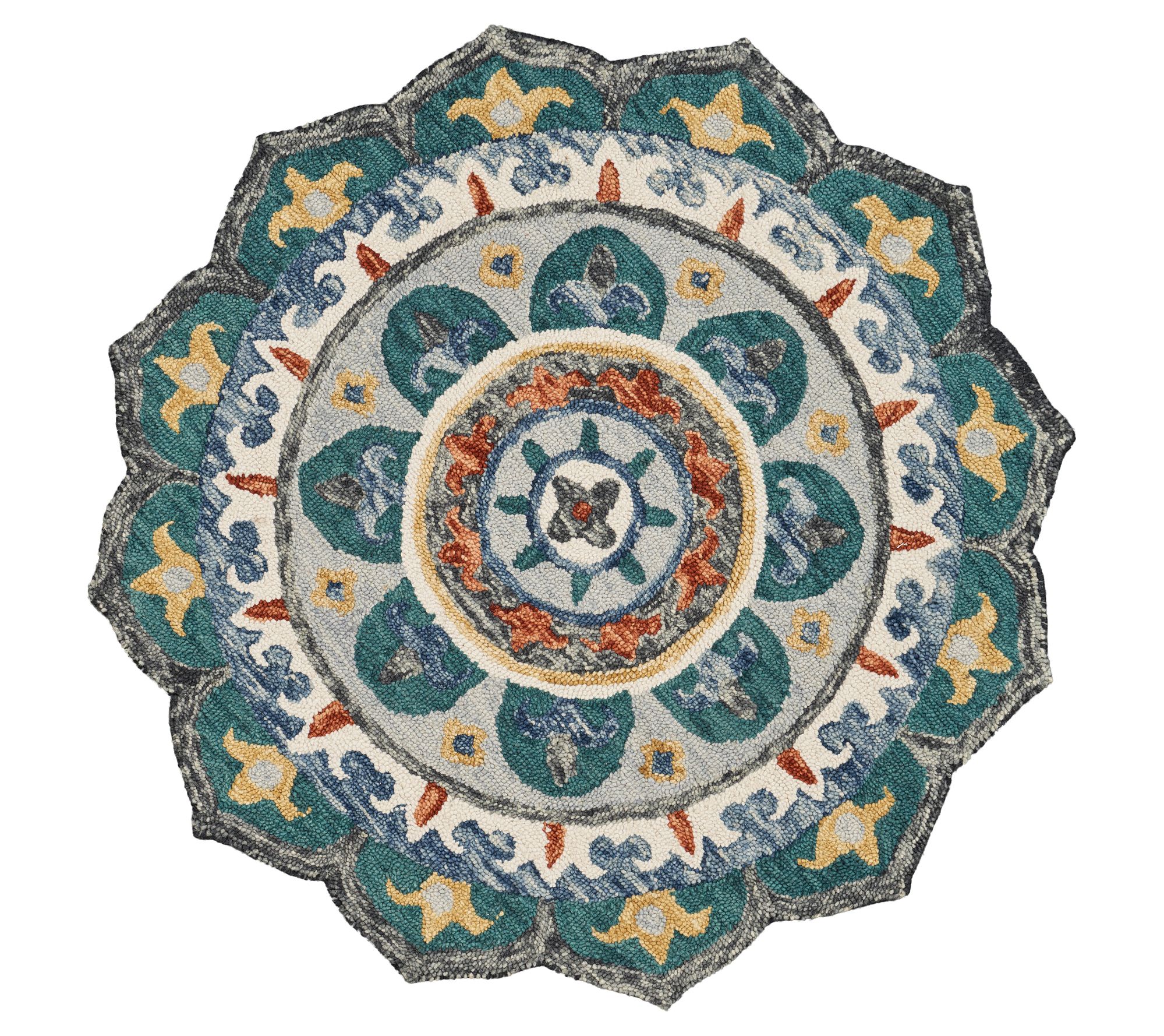Add a touch of modern farmhouse charm to your home with this beautiful medallion rug. Whether placed in an entryway, living room, or bedroom, its tufted design in hues of gray and teal creates a stunning focal point. The petal-edged round shape adds a unique accent that ties your decor together. From Ox Bay.