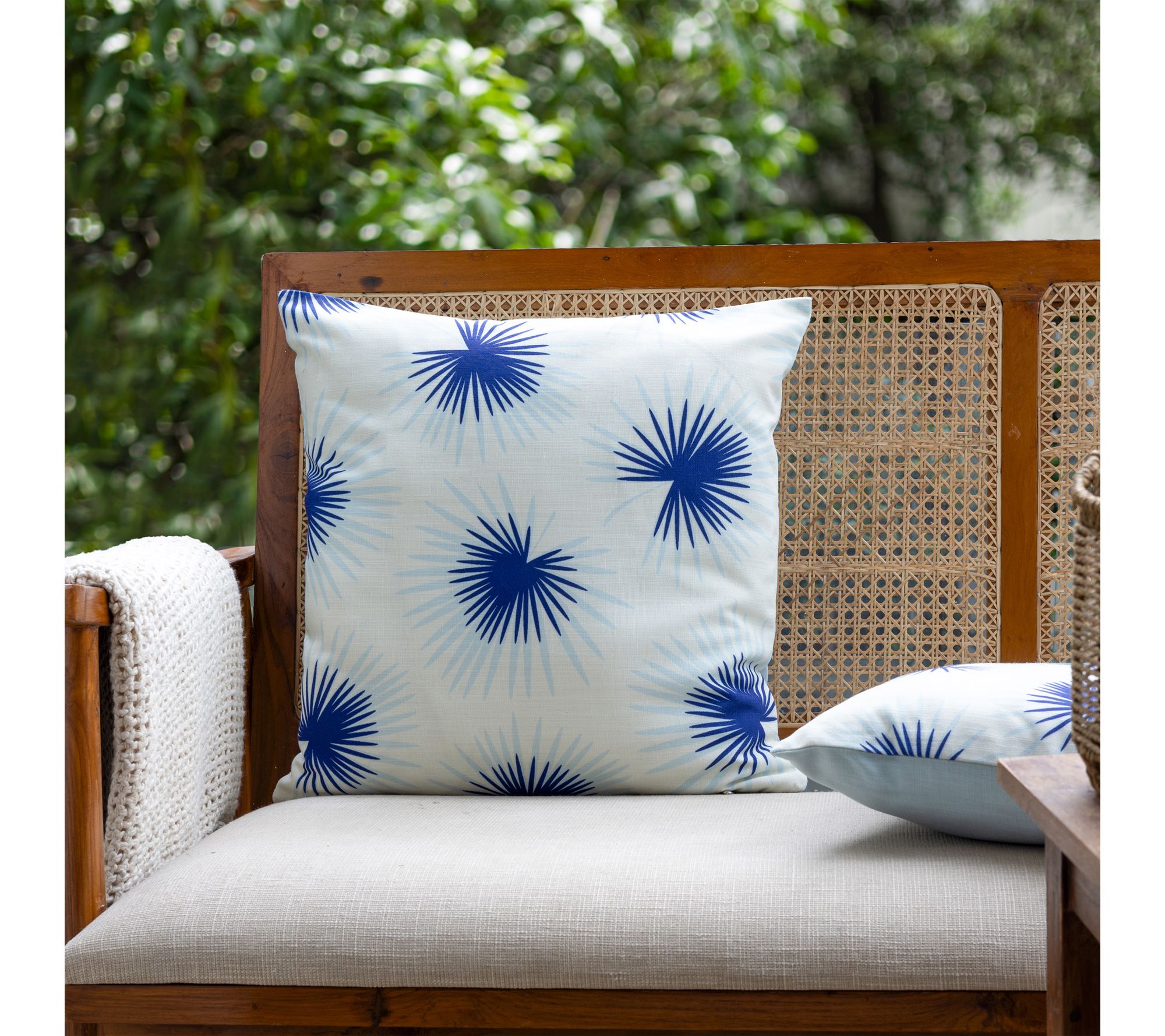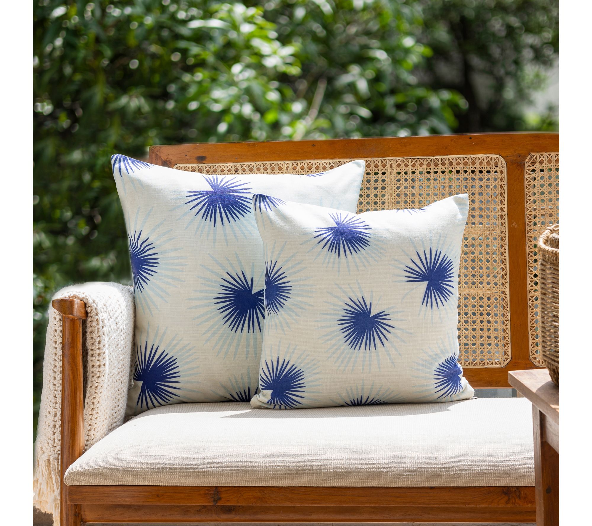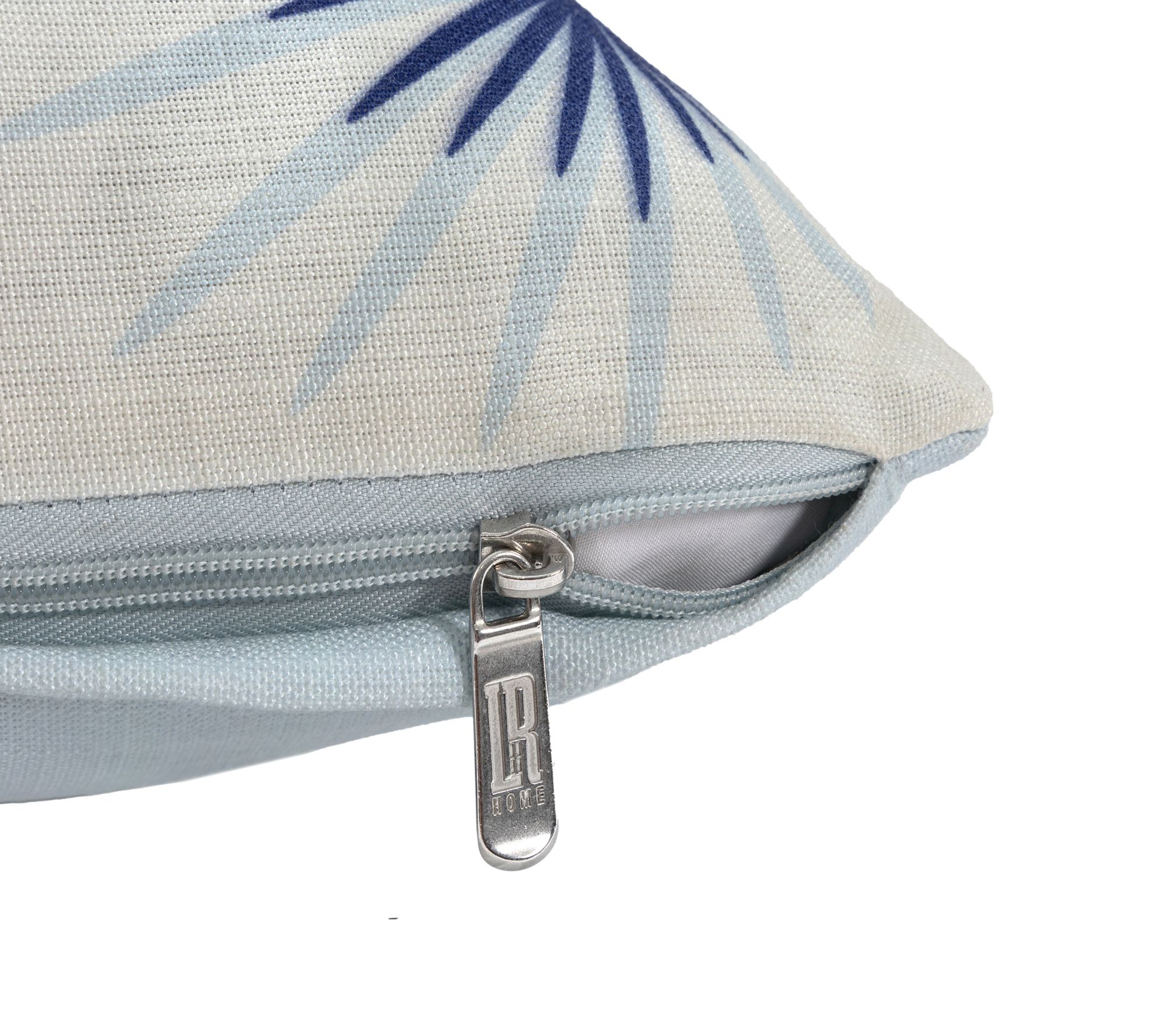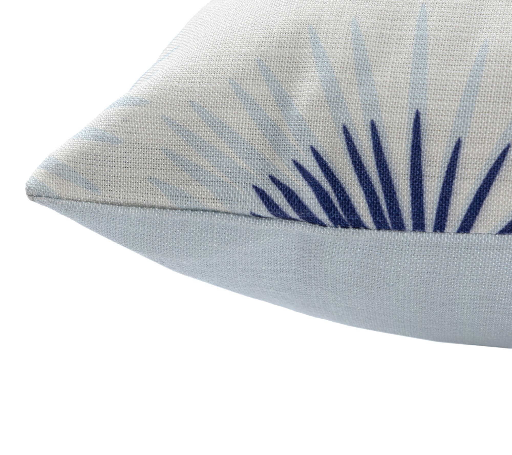 Infuse your bedroom or favorite lounging spot with a splash of the tropics using this decorative pillow. Featuring a vibrant navy and white palm frond print on one side and a solid blue reverse, this reversible accent adds versatile style and a pop of color -- ideal for brightening coastal-inspired or modern spaces. From Ox Bay.