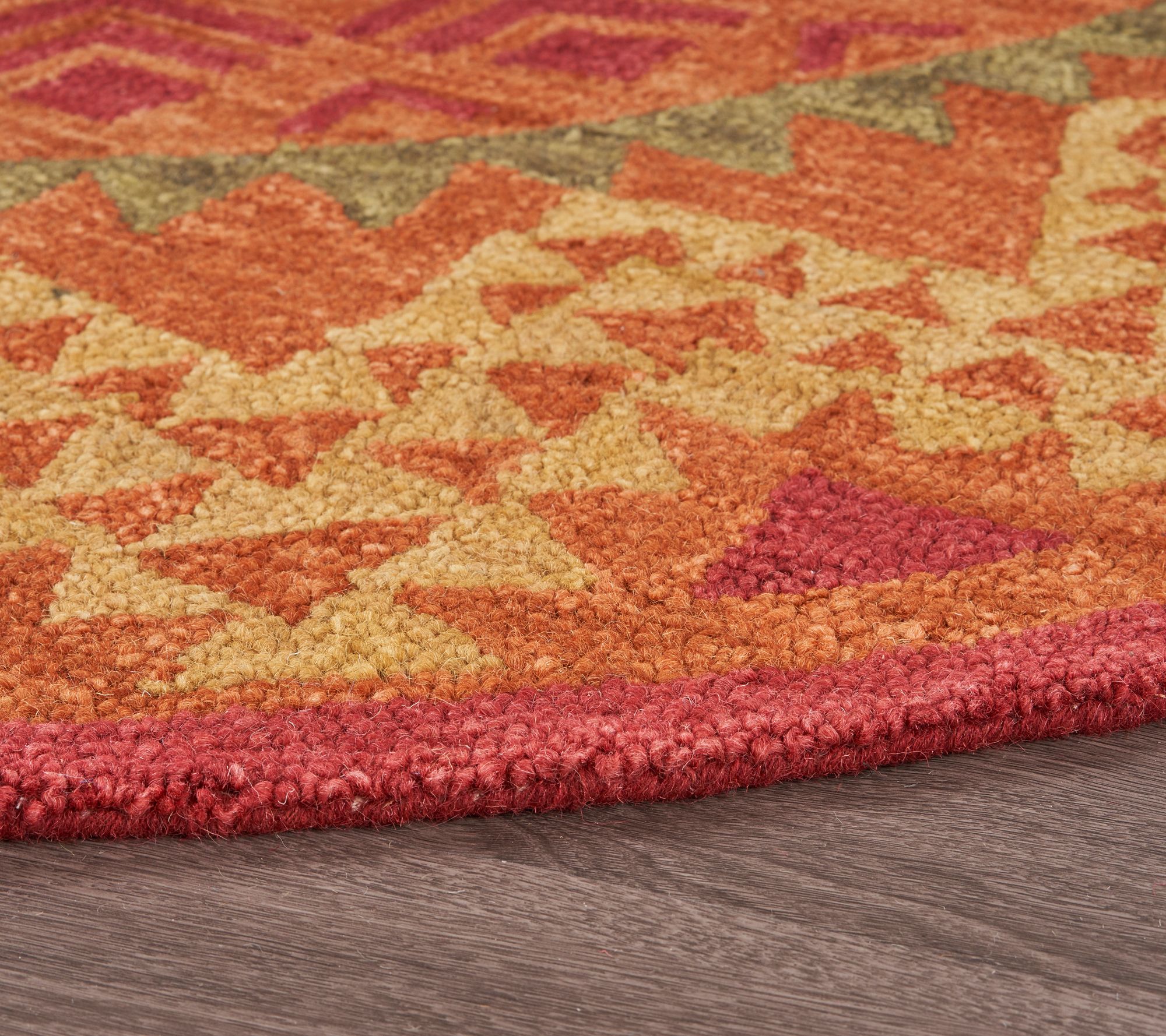 • Geometric medallion design in red, orange, and yellow