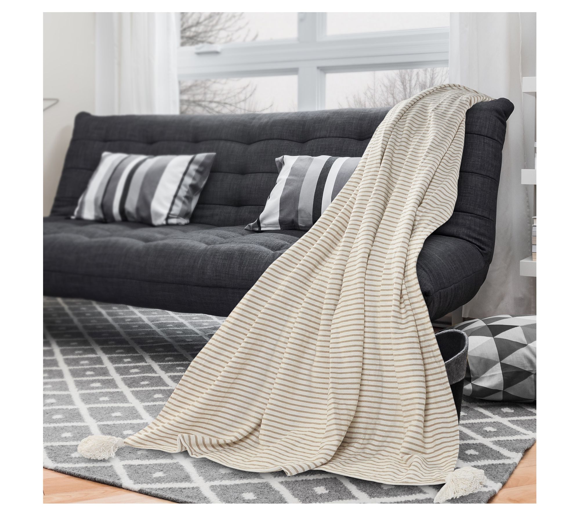 Snuggle into cozy softness and chic style with this transitional cotton throw blanket, featuring a striped pattern accented by playful tassels. From Ox Bay Trading & Supply Co.