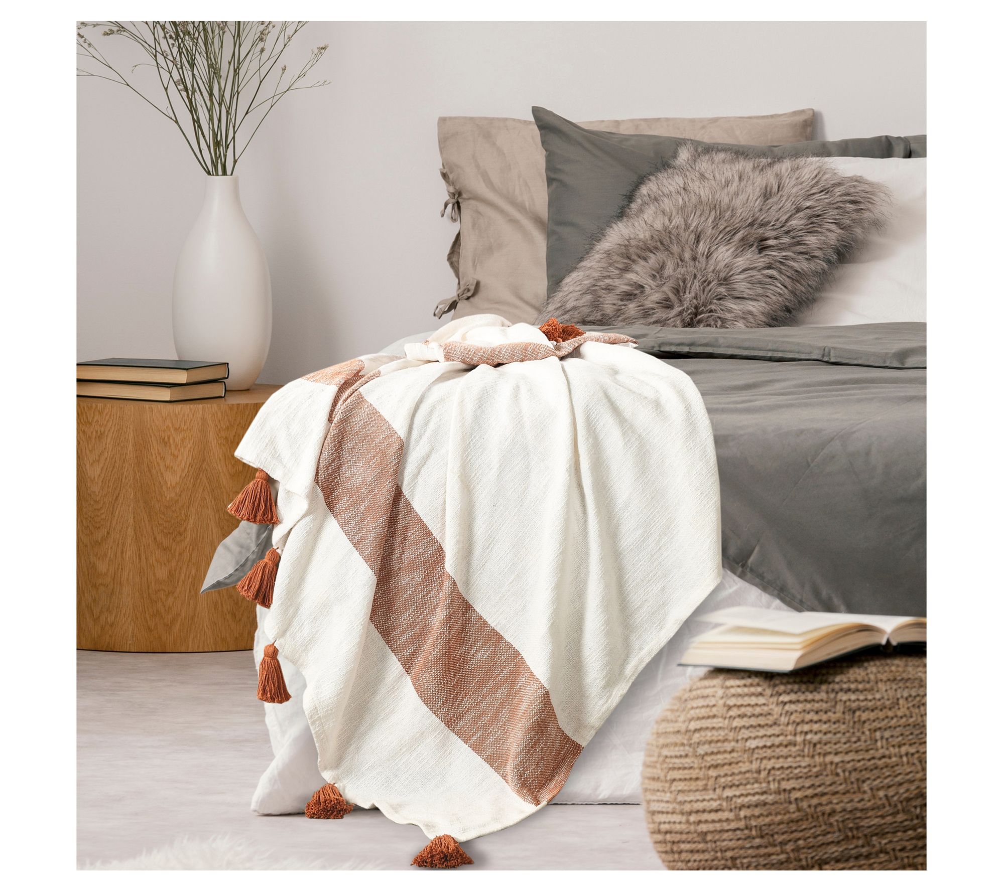 With its beautiful striped design accented by playful tassels, this cotton throw blanket lets you wrap up in total softness and boho-chic style. From Ox Bay Trading & Supply Co.