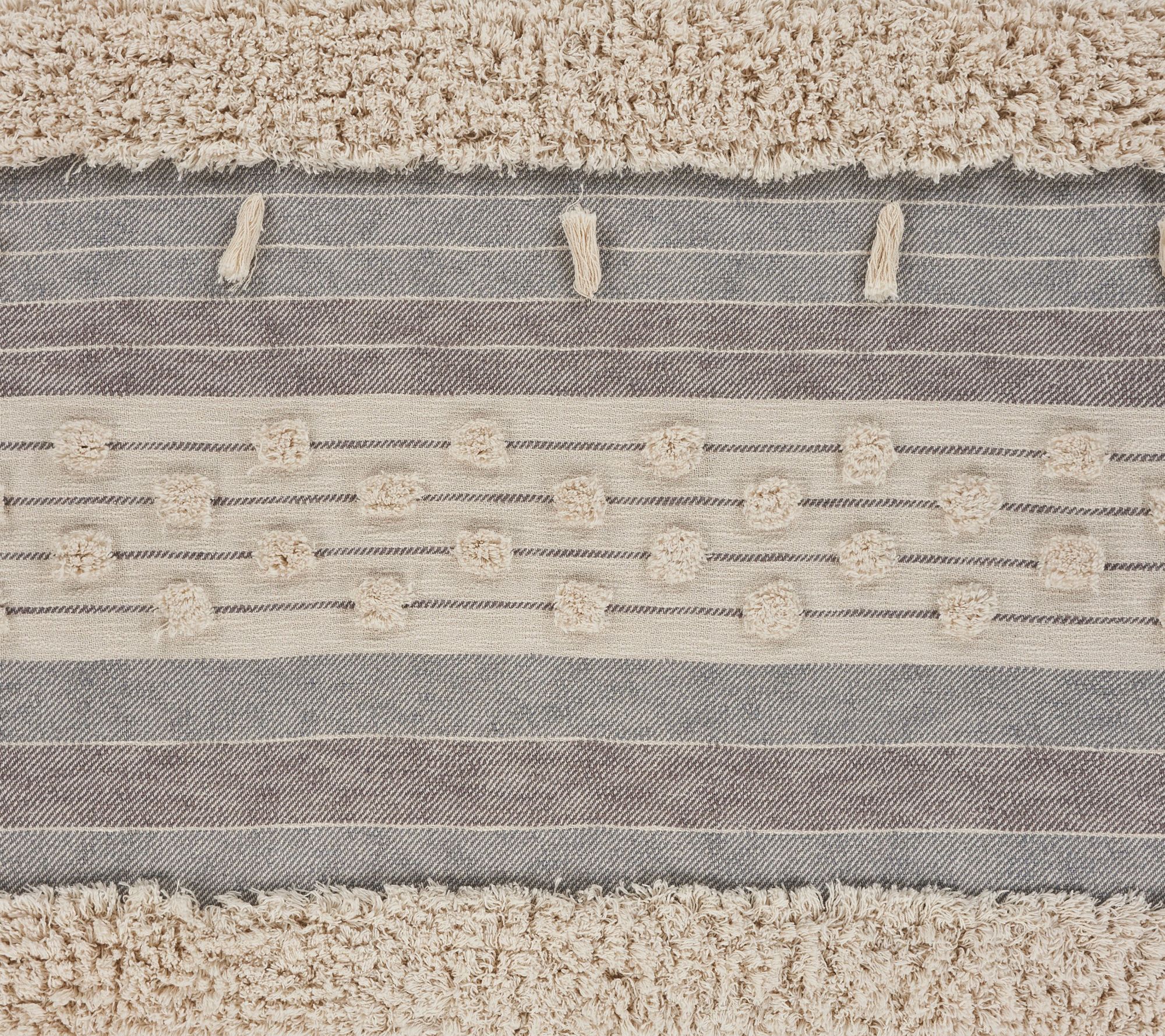 Designed with a beautiful blend of leisure and luxury, this overtufted throw blanket blends harmoniously into your home style and palette. The soft, neutral coloring, tufted stripes and poms bring fashion to your function. From Ox Bay Trading.