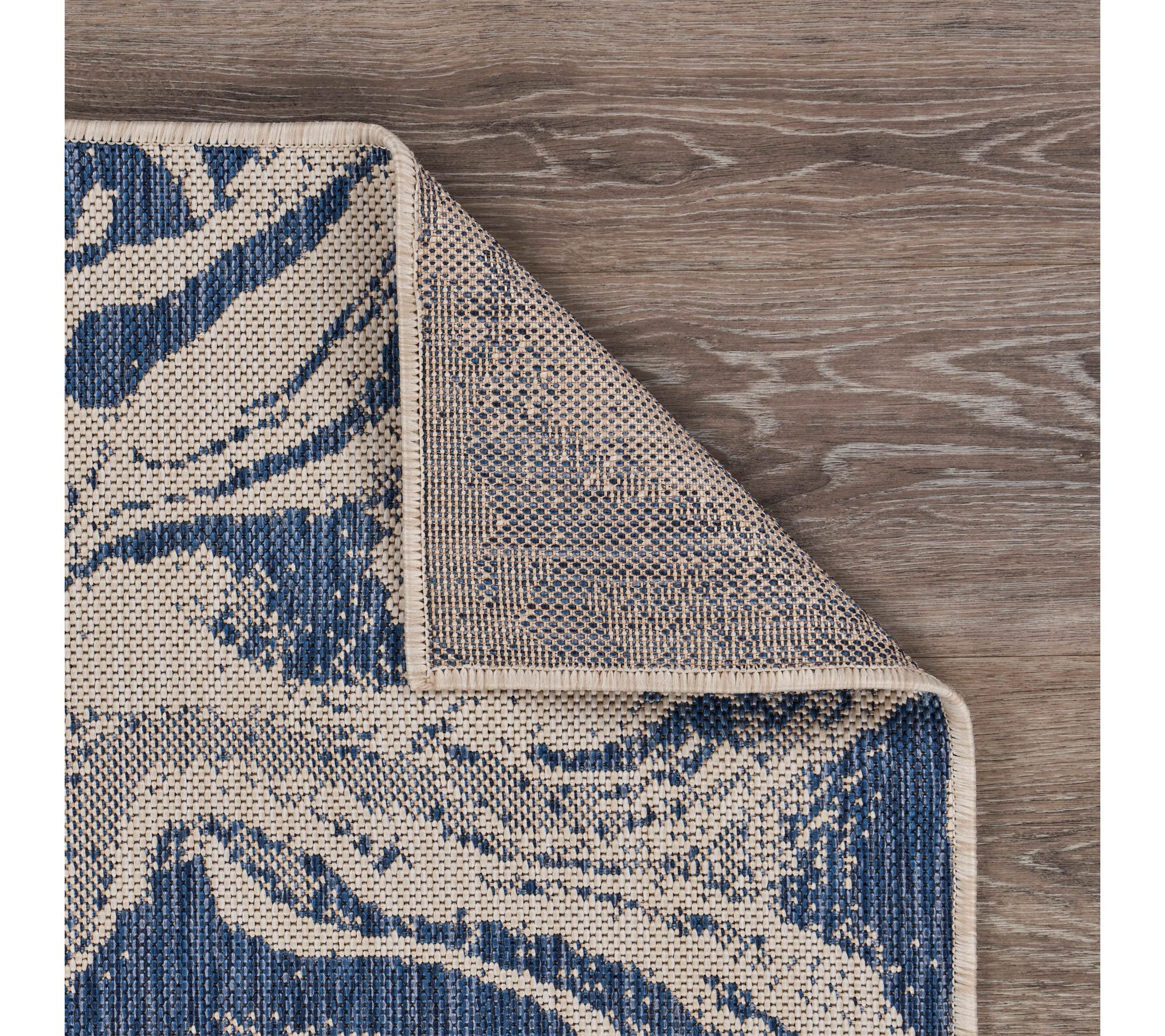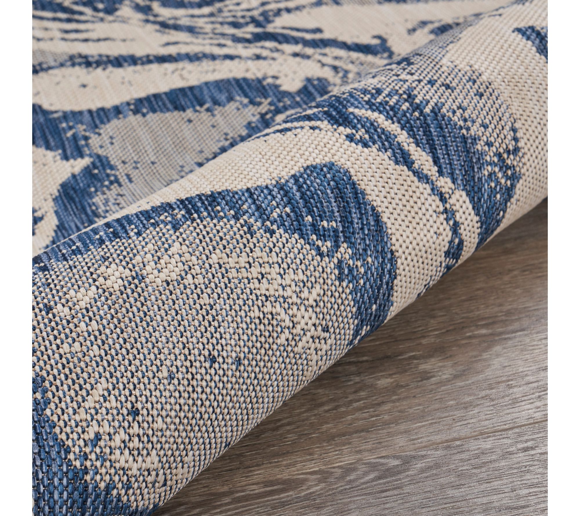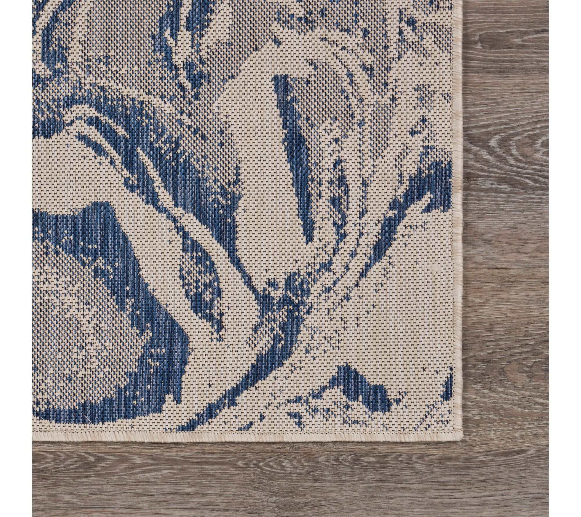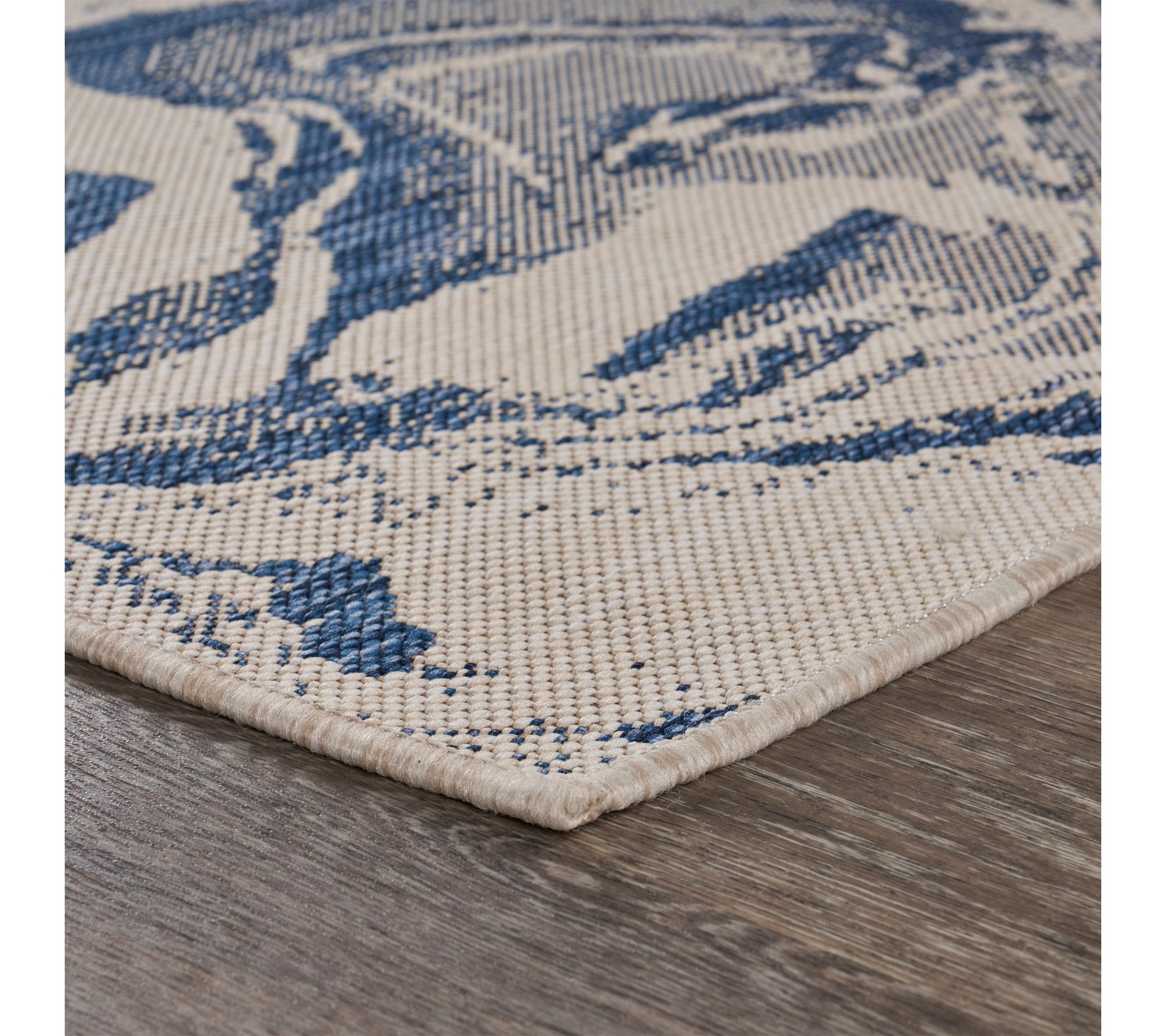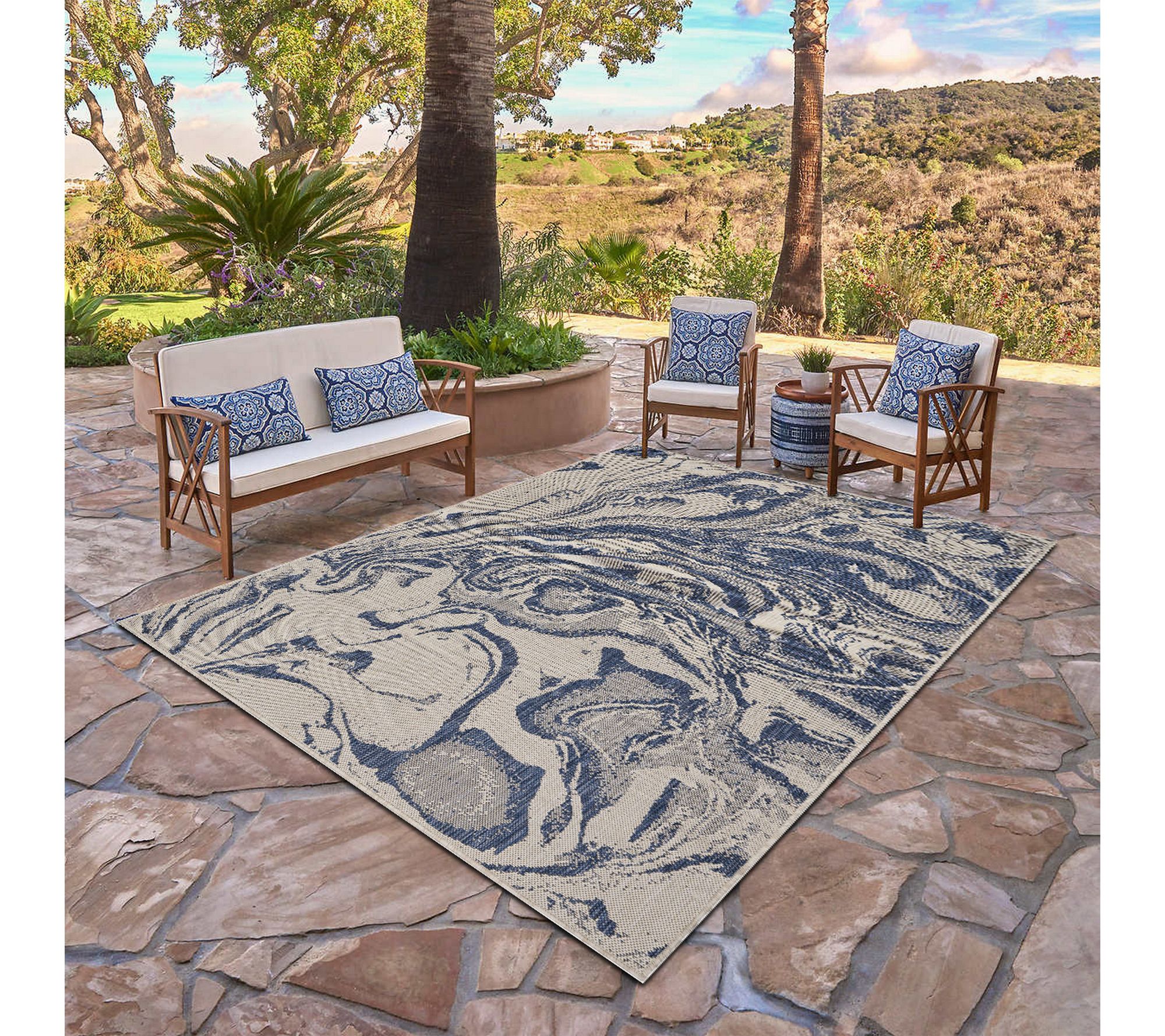Nautical vibes come alive with this white and navy area rug, offering a breezy anchor for your favorite spaces -- from a lively patio gathering to a peaceful sunroom retreat. With a power-loomed design for lasting style and simple spot-clean care, this outdoor rug fits seamlessly into high-traffic living, dining, and entertaining areas. From Ox Bay.