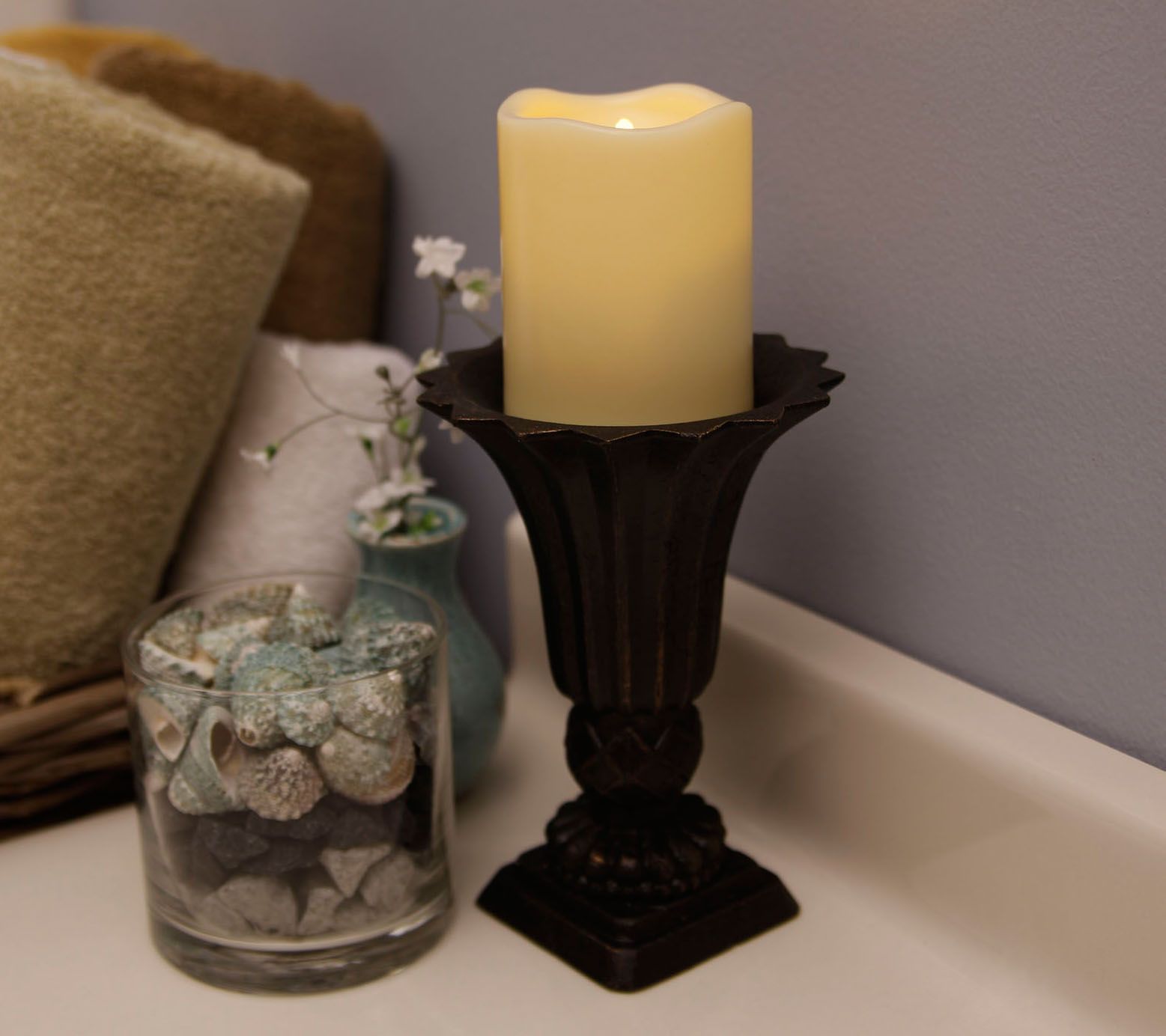 • Includes two flameless resin pillar candles