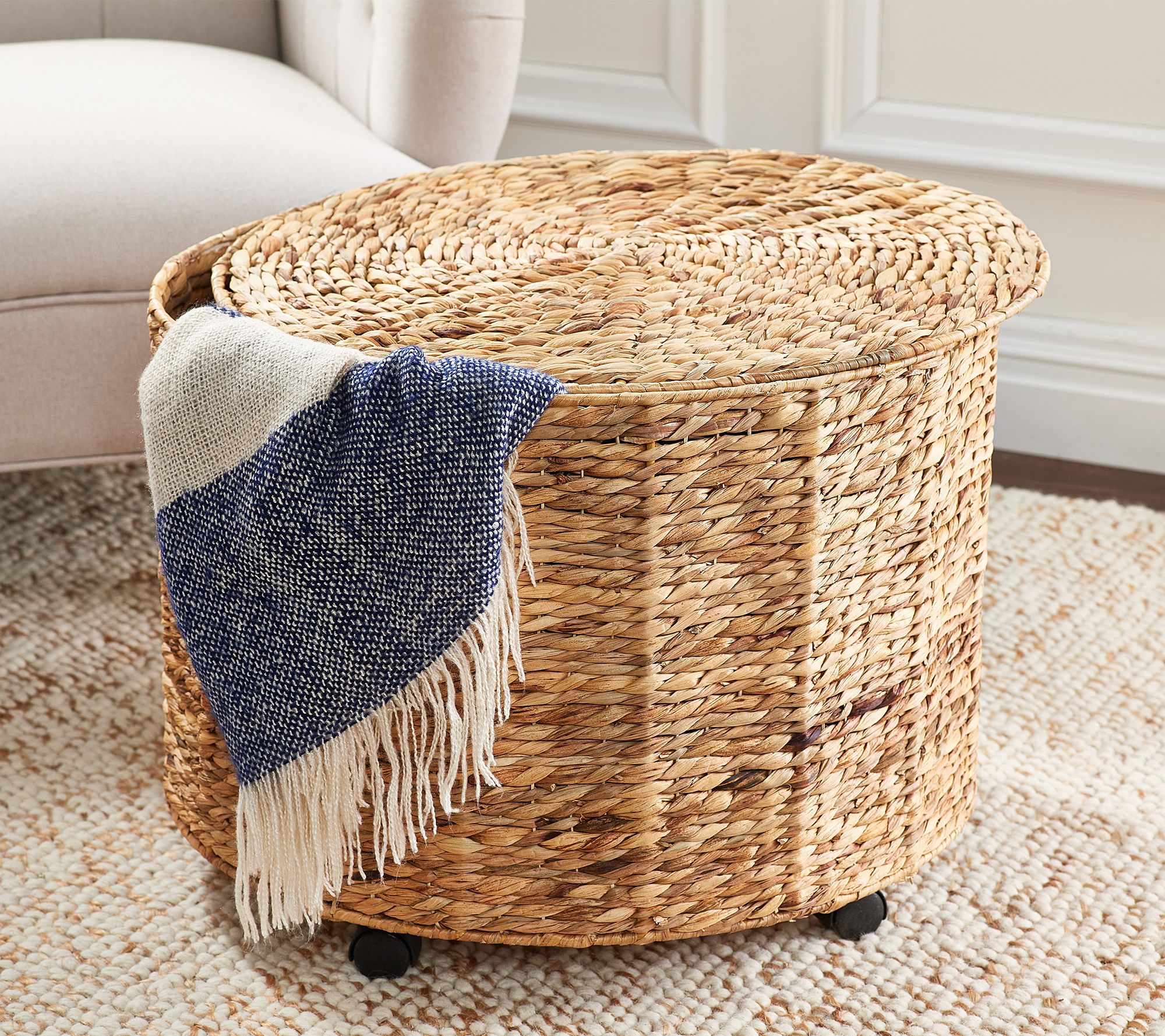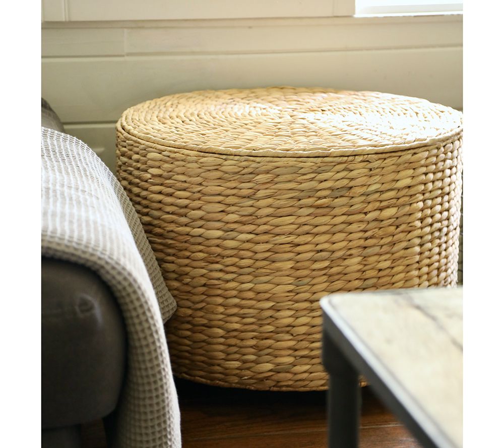 Convenience and coastal charm come together in one multifunctional piece of furniture. Yes, this ottoman looks great wherever you place it (thank you, woven water hyacinth design) adding texture and dimension to your decor. And yes, it goes wherever you want or need it (thank you, wheels!). But while it's serving you in style as a foot stool or accent table, it has a secret underneath its lid -- the perfect place to stash books, games, that favorite fuzzy throw, or just about anything you want to hide (company's coming!) yet keep in reach. From Pacific Thyme.