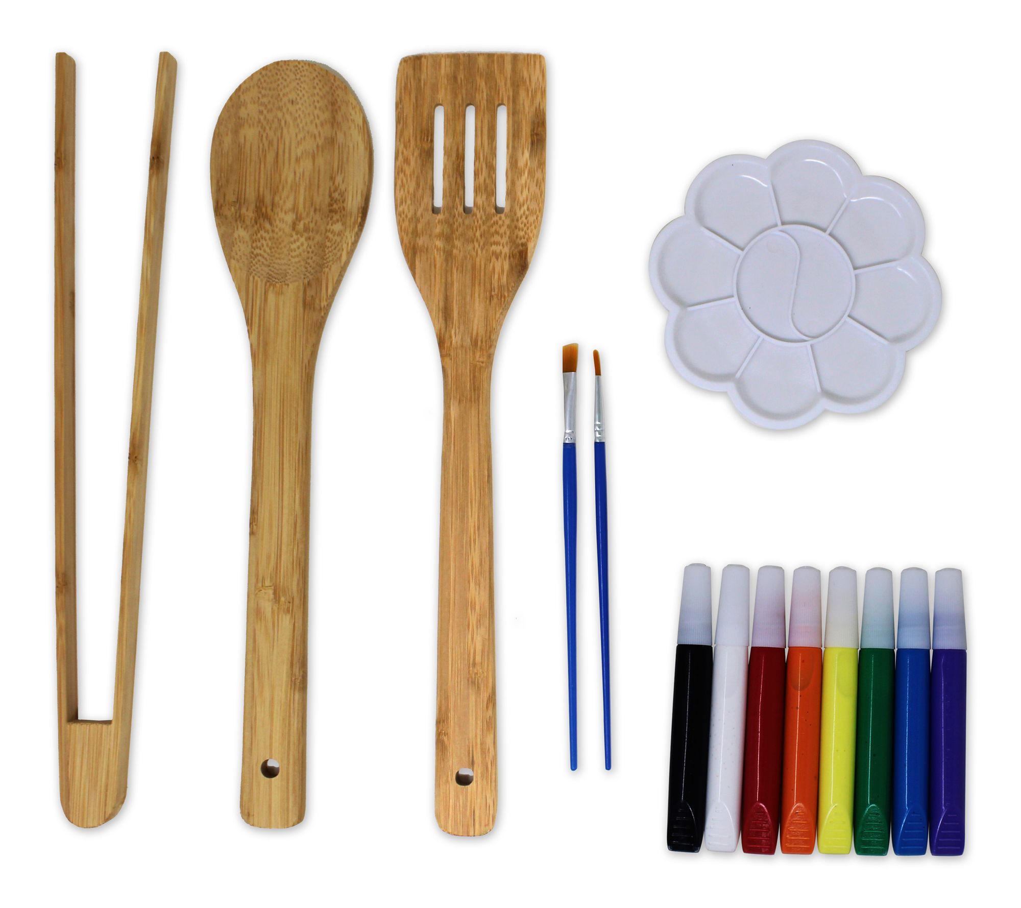 • Includes mixing palette, adjustable chef's hat, adjustable apron, two paint brushes, eight acrylic paints, three bamboo utensils, tea towel, and ten recipes