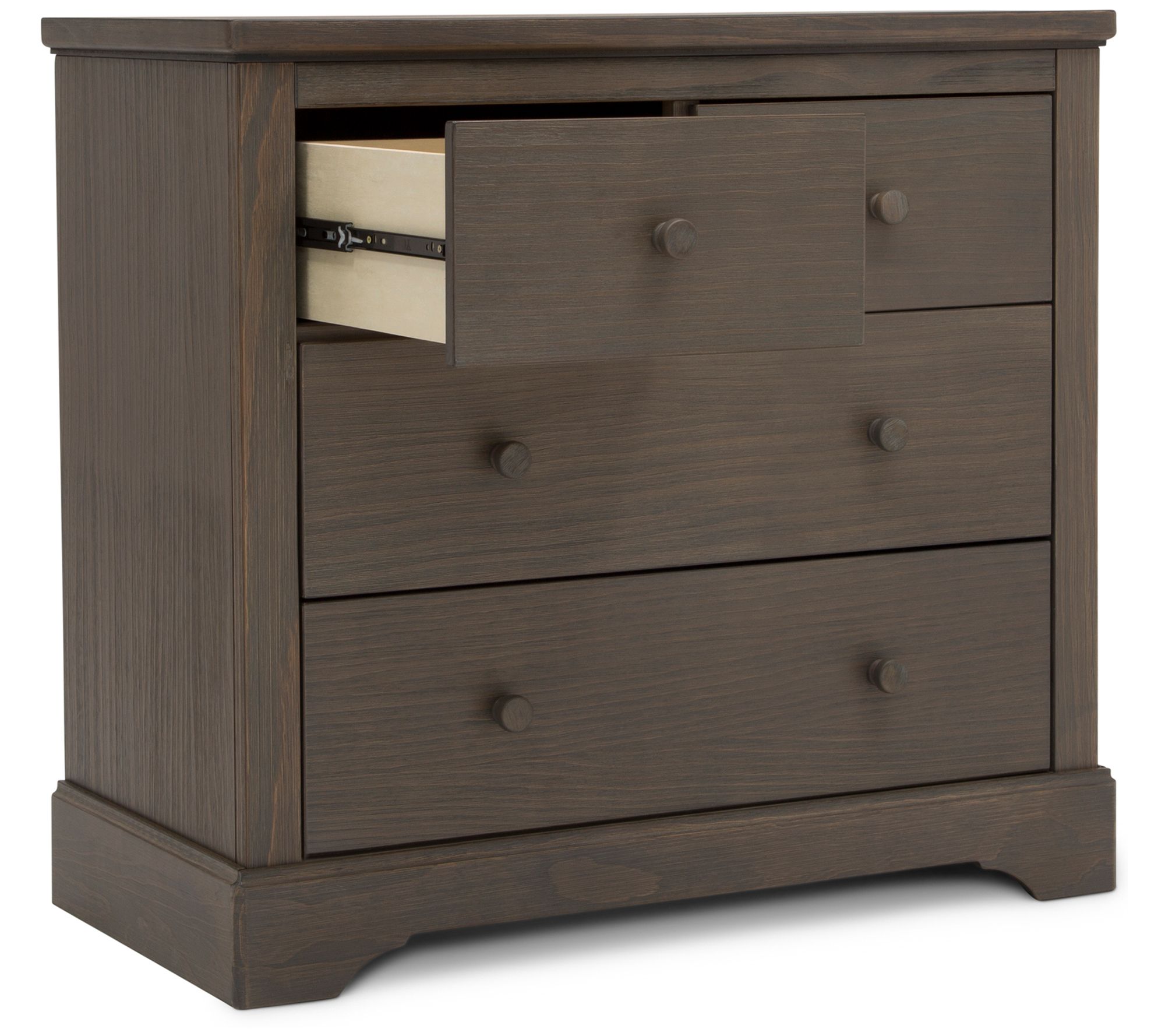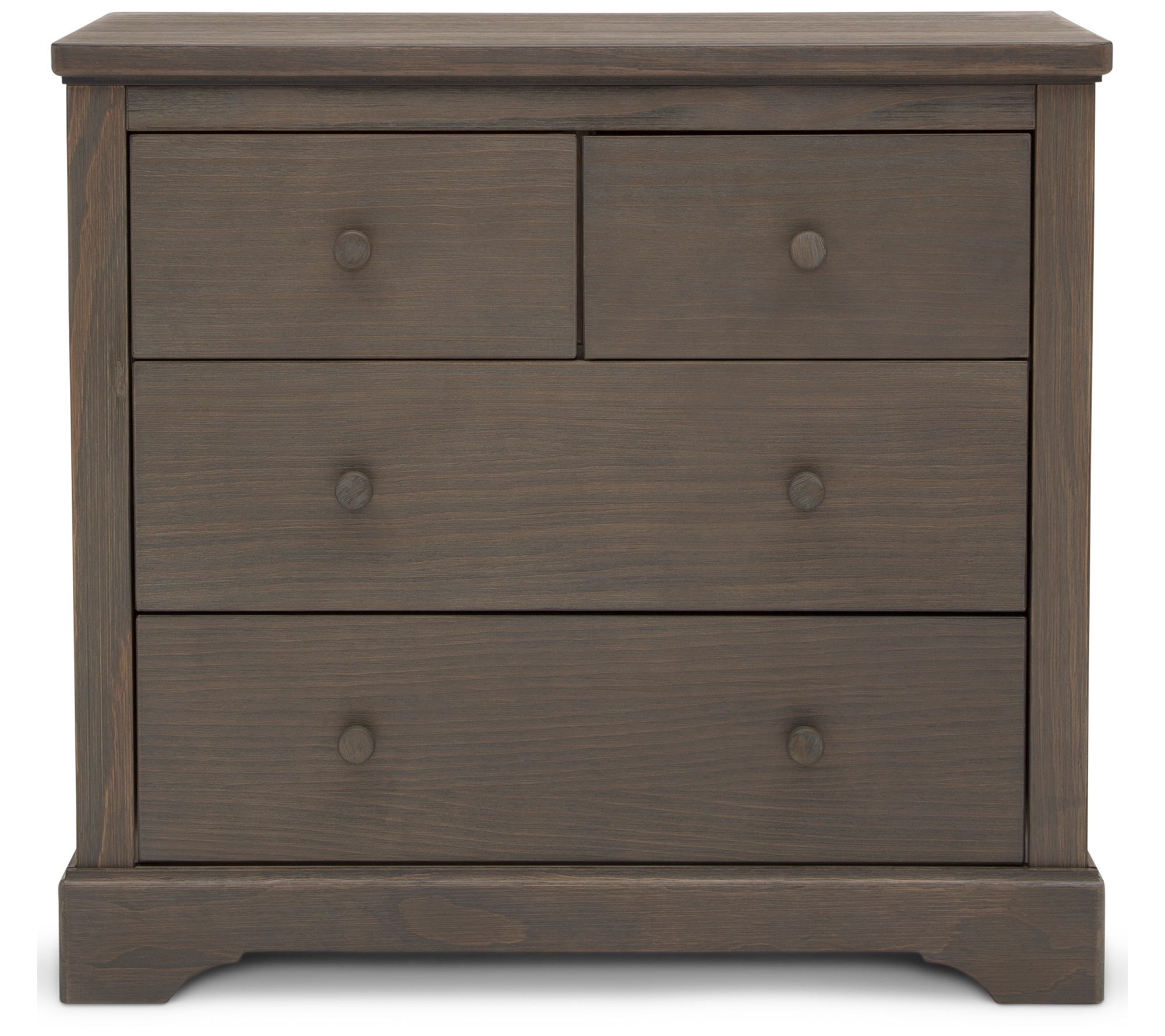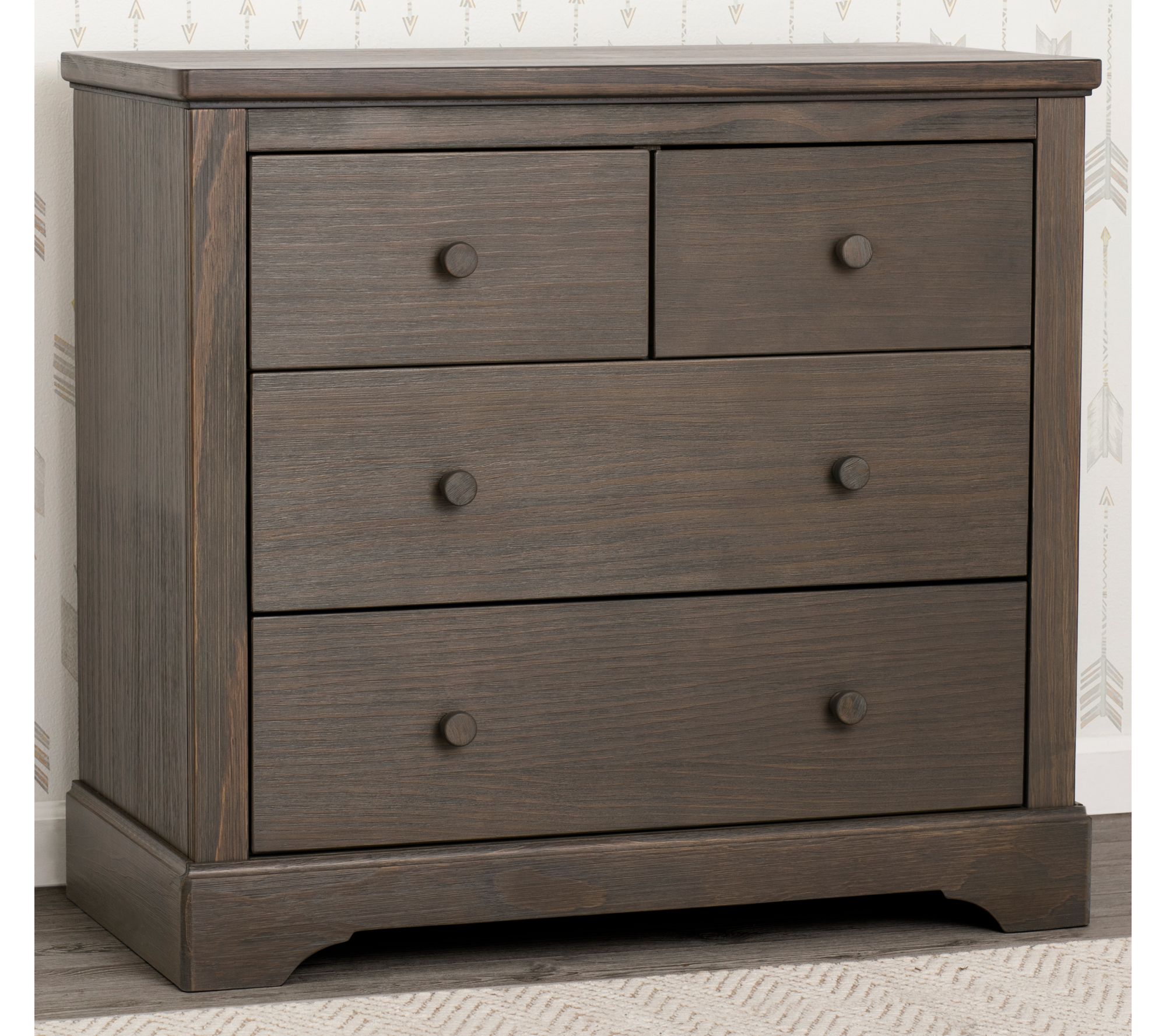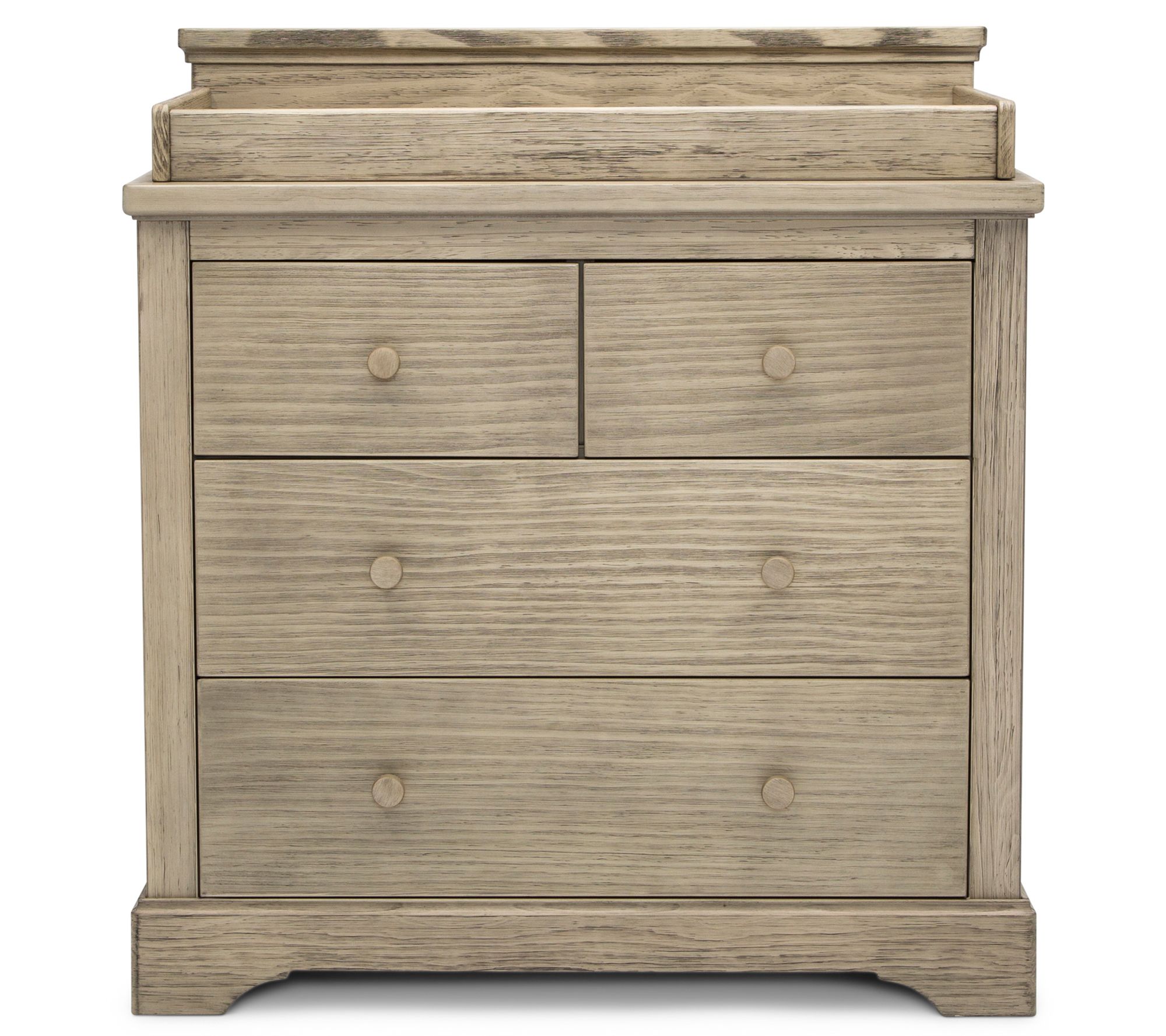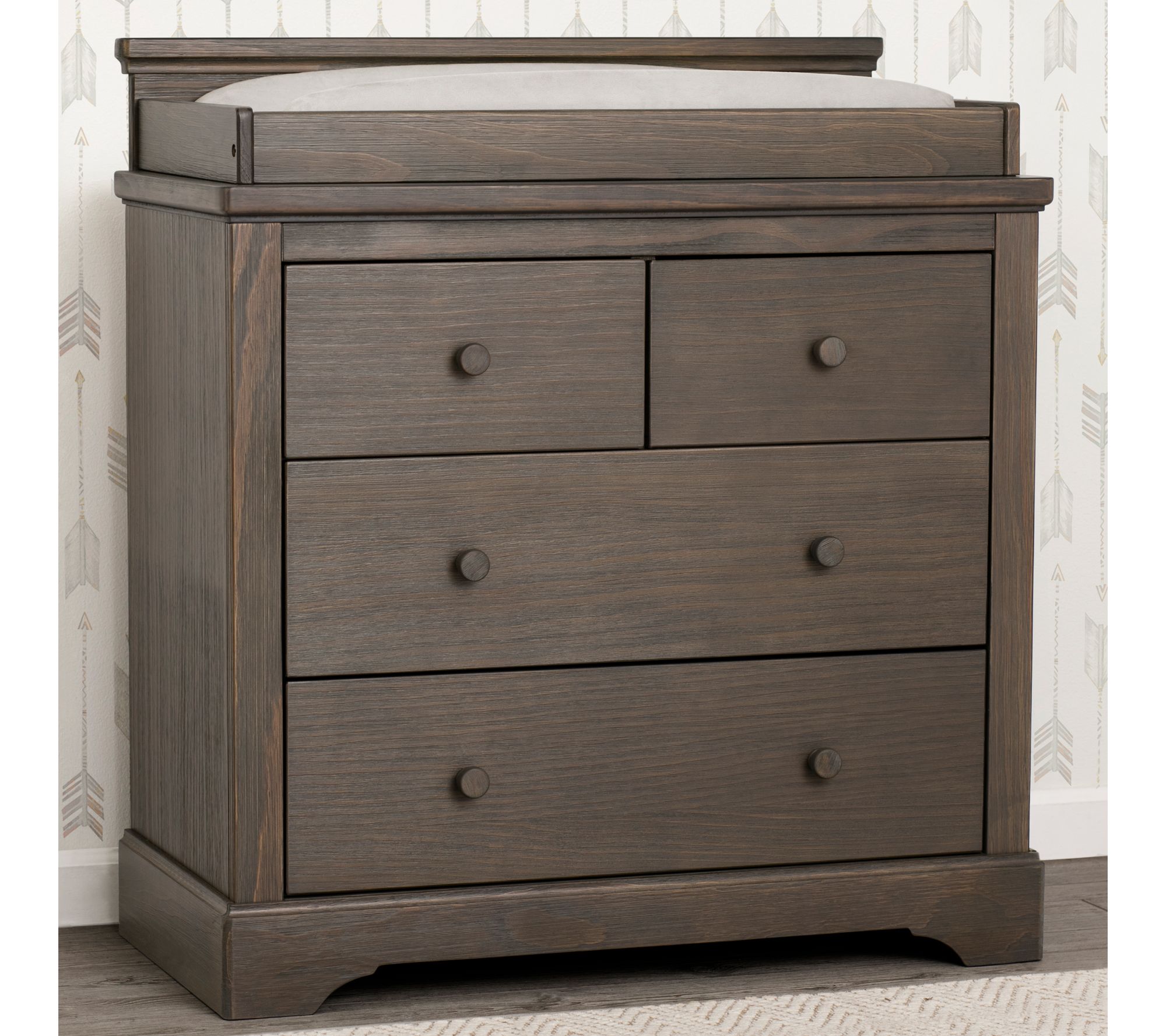 Impressive and substantial, this four-drawer, hand-distressed dresser with changing top brings warmth to your nursery while accommodating your child's needs. From Delta Children.