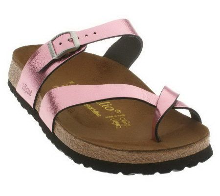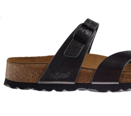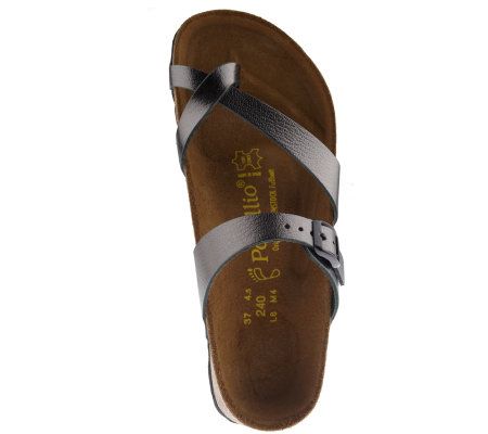 How do you stroll? In comfort and style with these sandals on your feet. Unique metallic leather straps cross over your foot and around your toe, while a strap across the vamp has an adjustable buckle for the perfect fit. From Papillio.