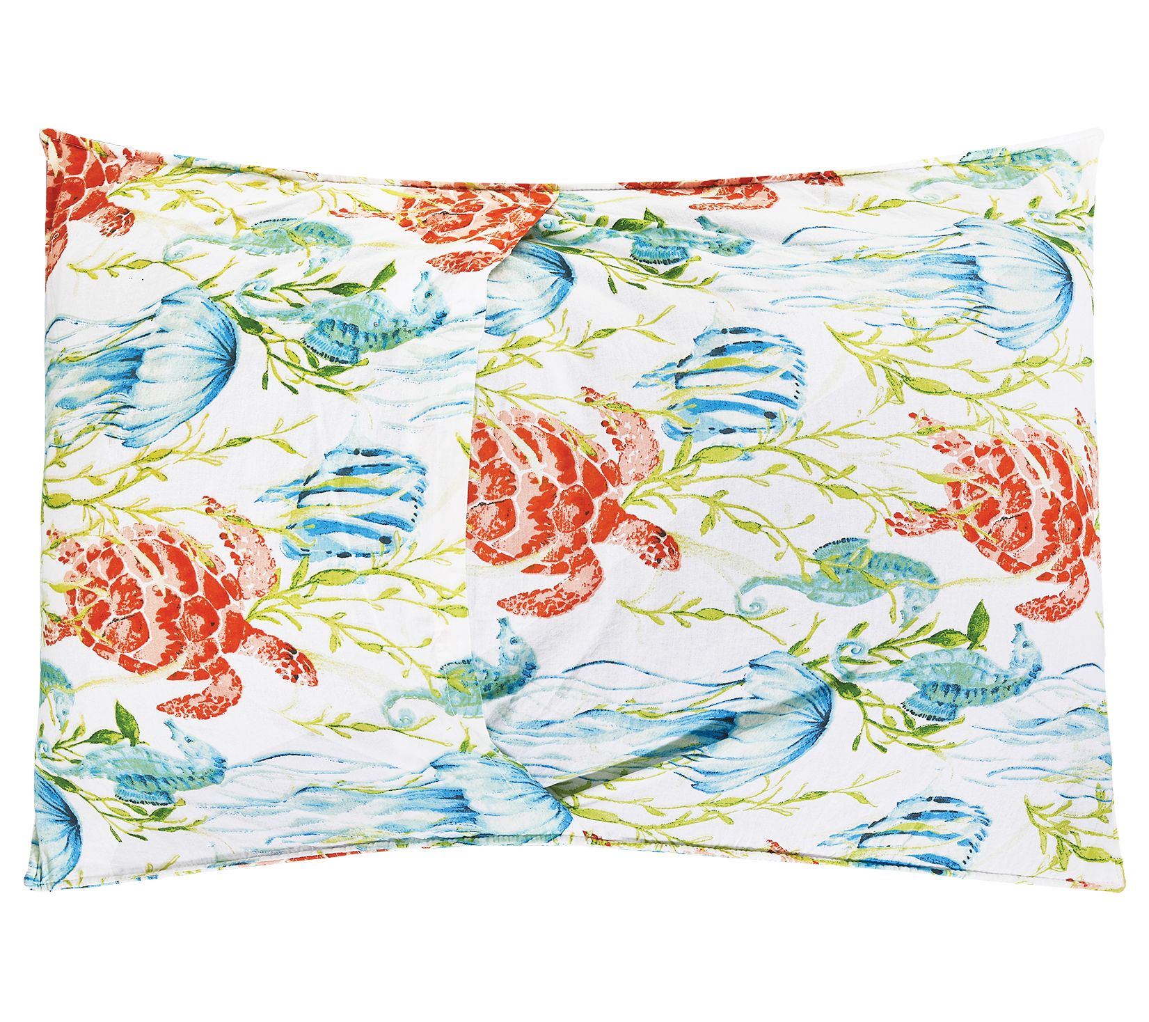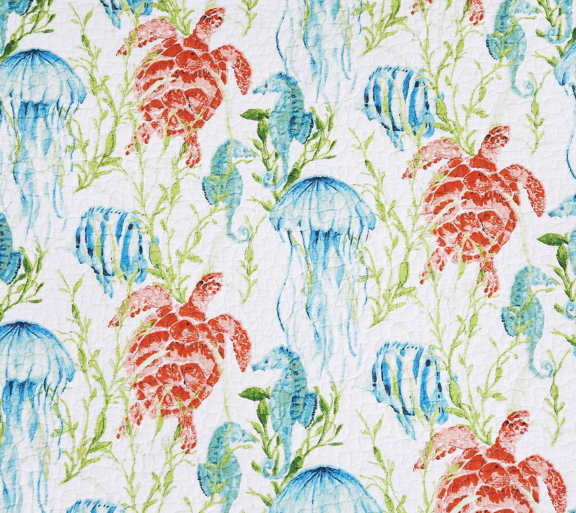 Create a tropical oasis in your home with the Paradise Sound twin size quilt set, showcasing a vibrant watercolor design of blue, green, and orange undersea creatures, reversible to a coordinating net pattern. From the Valerie Parr Hill Collection.