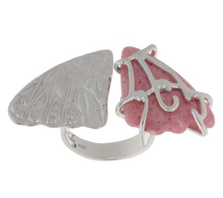 • Open butterfly-design ring with rhodonite cabochon as one wing, set with sterling overlay design; other wing detailed with sterling work; highly polished