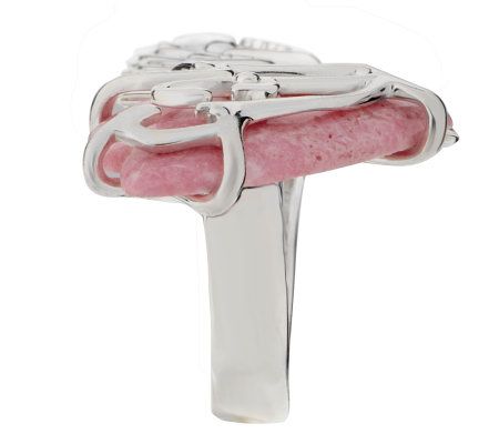 Spread your style wings with this distinctive butterfly ring. The open design incorporates one rhodonite cabochon wing with an intricate overlay. The other wing showcases a beautiful, detailed pattern.