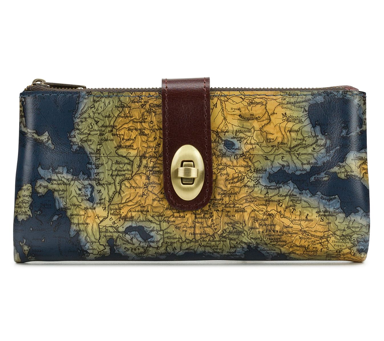 In a vibrant Greek Map design, this Patricia Nash leather wristlet is a versatile companion for any adventure. Whether heading to a cafe or a night out, its retractable wristlet strap provides easy carrying, while the twist-lock closure ensures everything stays secure. Inside, find ample storage with designated spaces for cards, bills, and essentials, along with a handy ID window and a rear zip pocket for extra security. It's a chic blend of function and fashion, perfect for your everyday needs. From Patricia Nash.
