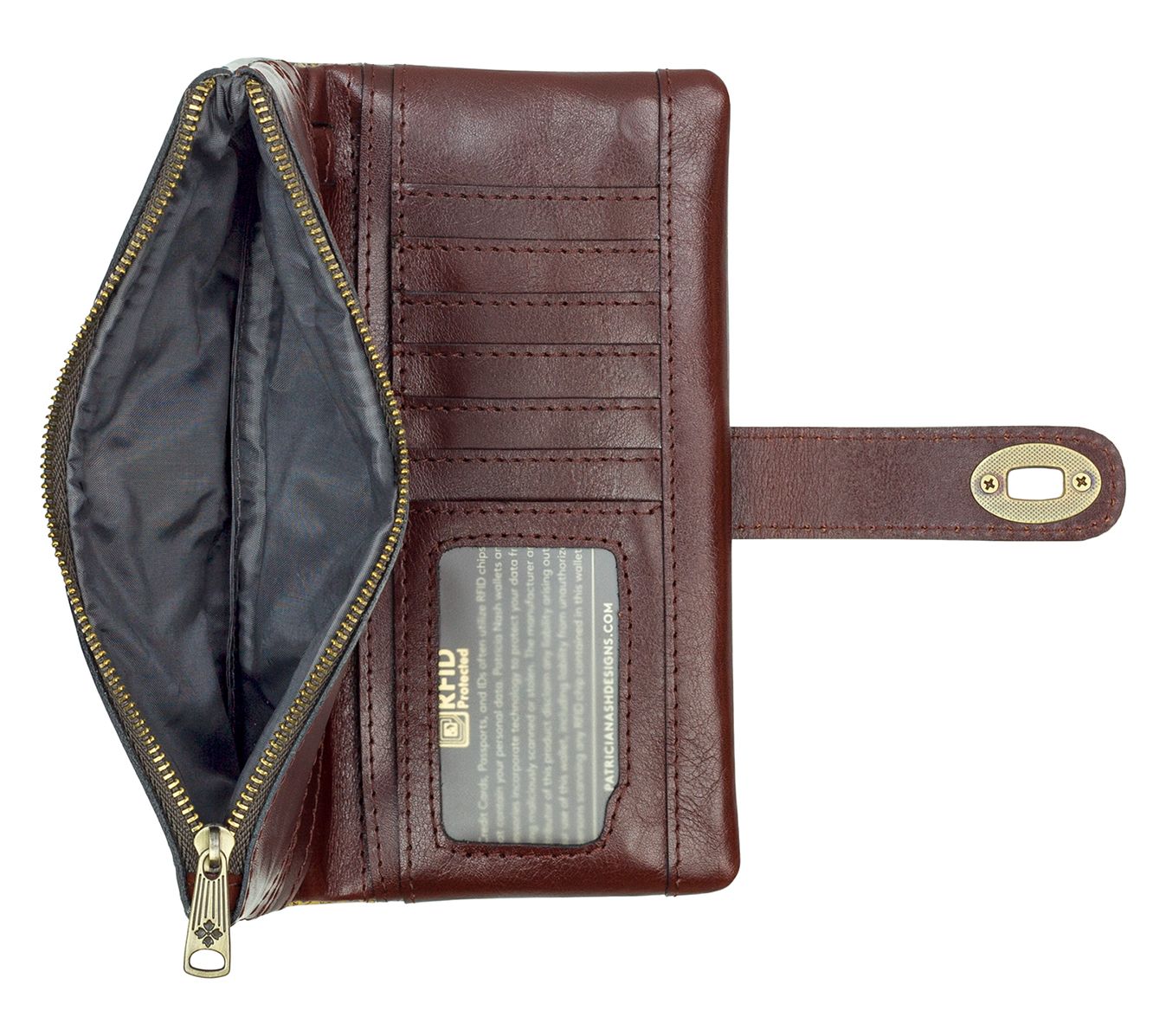 Interior: three bill pockets, one zip pocket, 12 credit card slots, one clear ID window