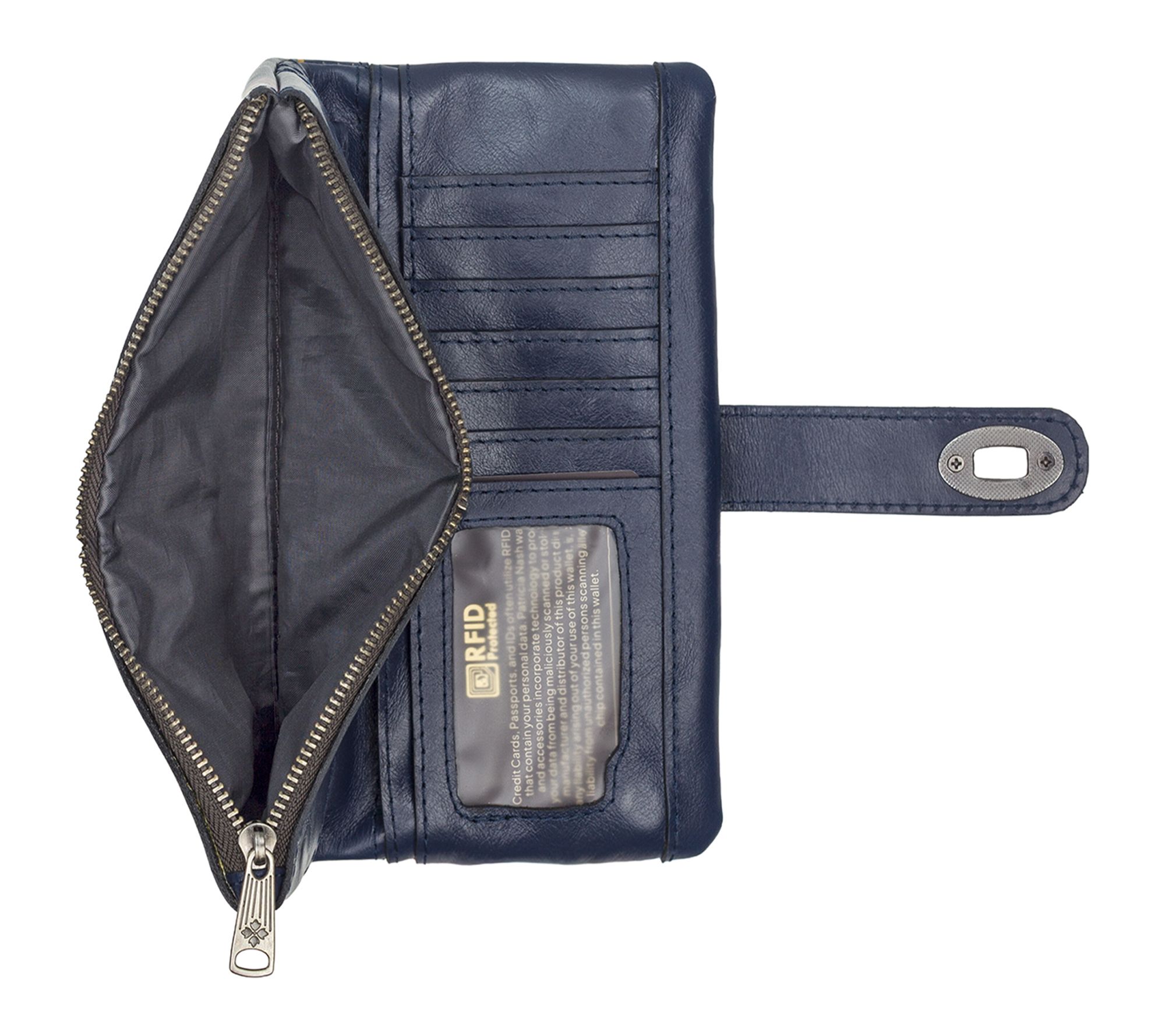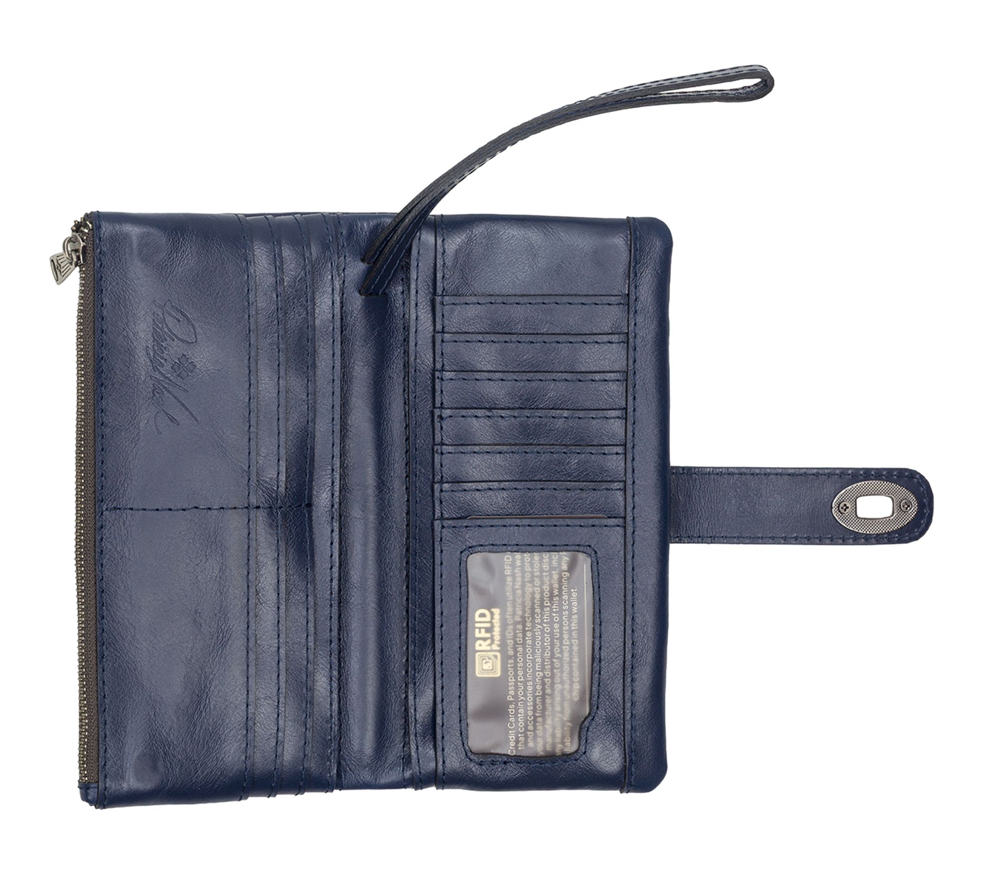 • Lined interior, bill pockets, zip pocket, 12 credit card slots, clear ID window, leather trim, nylon lining