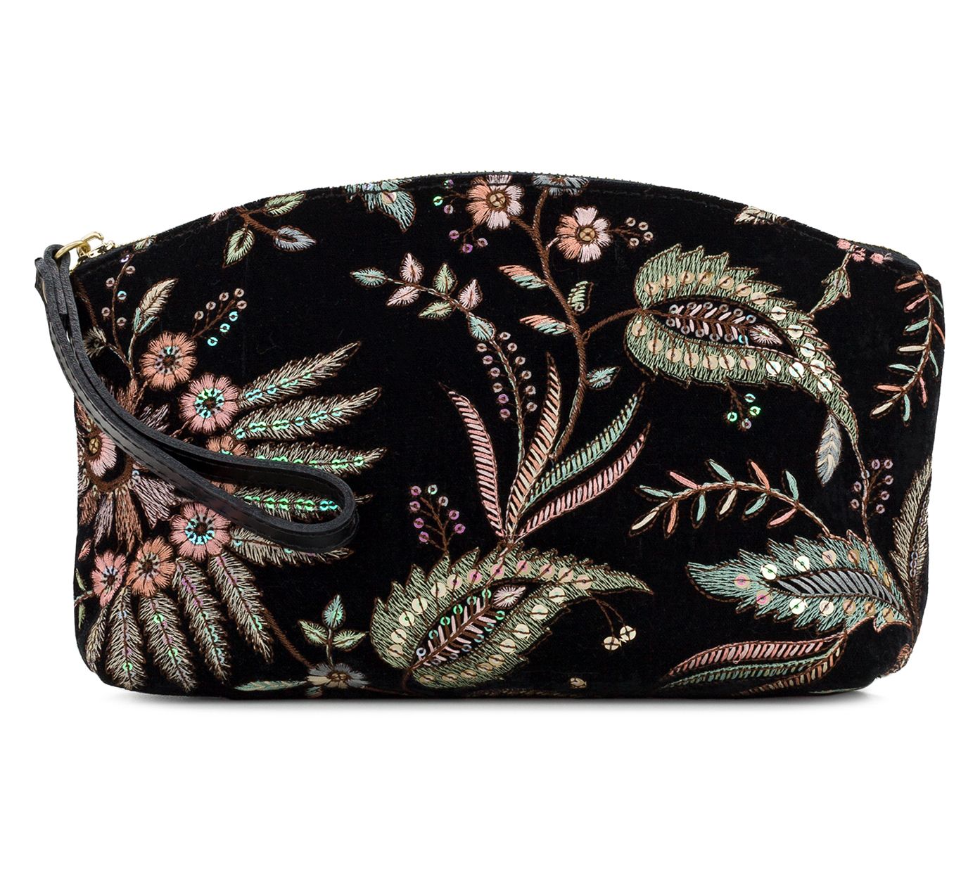 Whether you're heading out for the evening or packing it in your travel tote, the Patricia Nash Aritzo cosmetic bag is a versatile companion. Crafted from luxurious leather and featuring an elegant velvet jacquard design, it combines both style and functionality. With a handy wrist strap, it’s perfect for all your essentials on the go. From Patricia Nash.