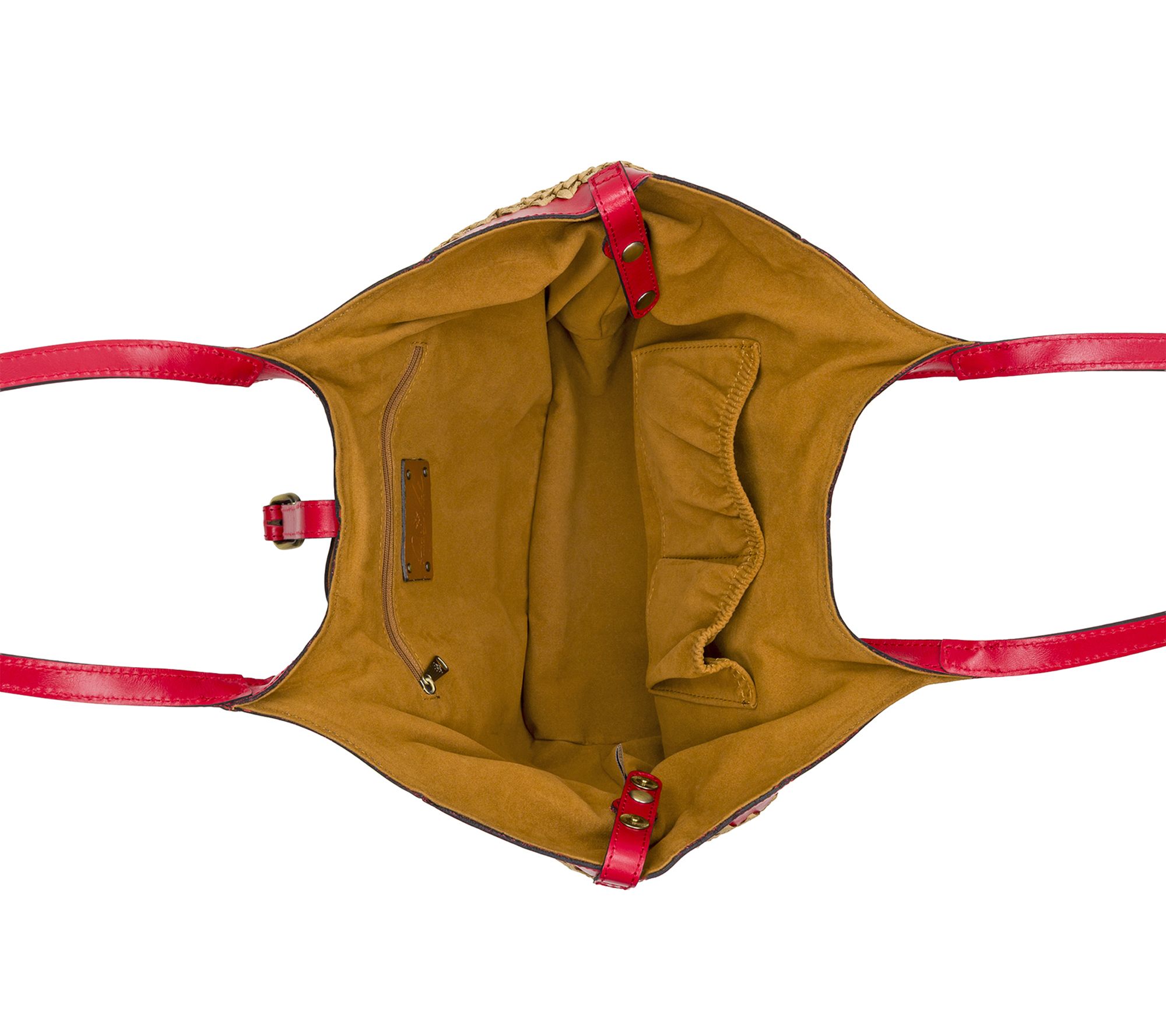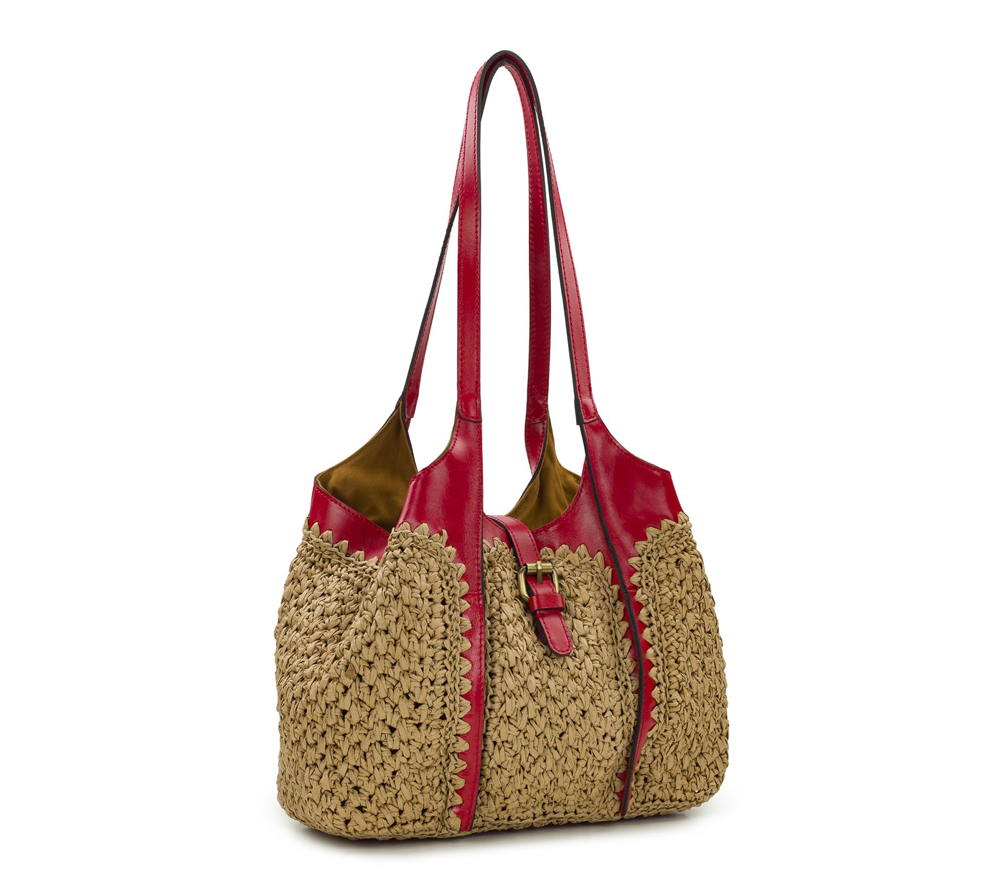 Woven leather and straw exterior, double handles, snap closure, signature brushed brass hardware, rear slip pocket with magnetic snap closure, burned edge finish