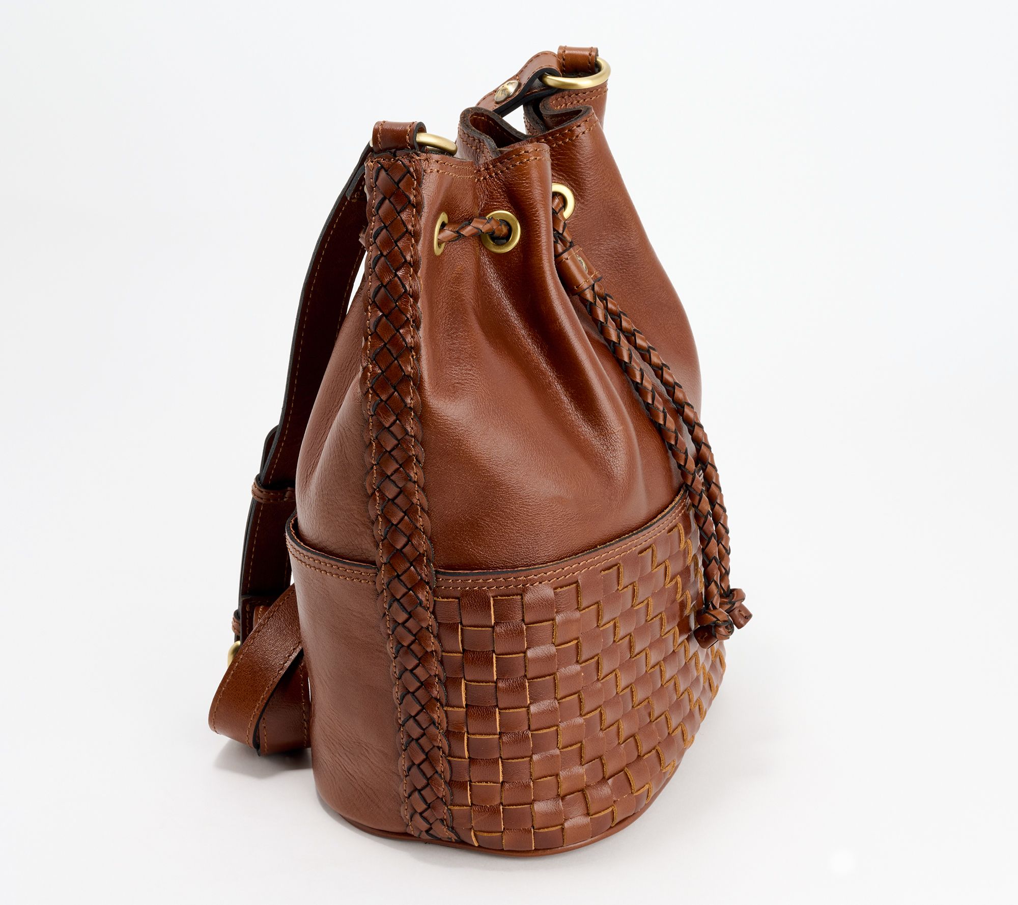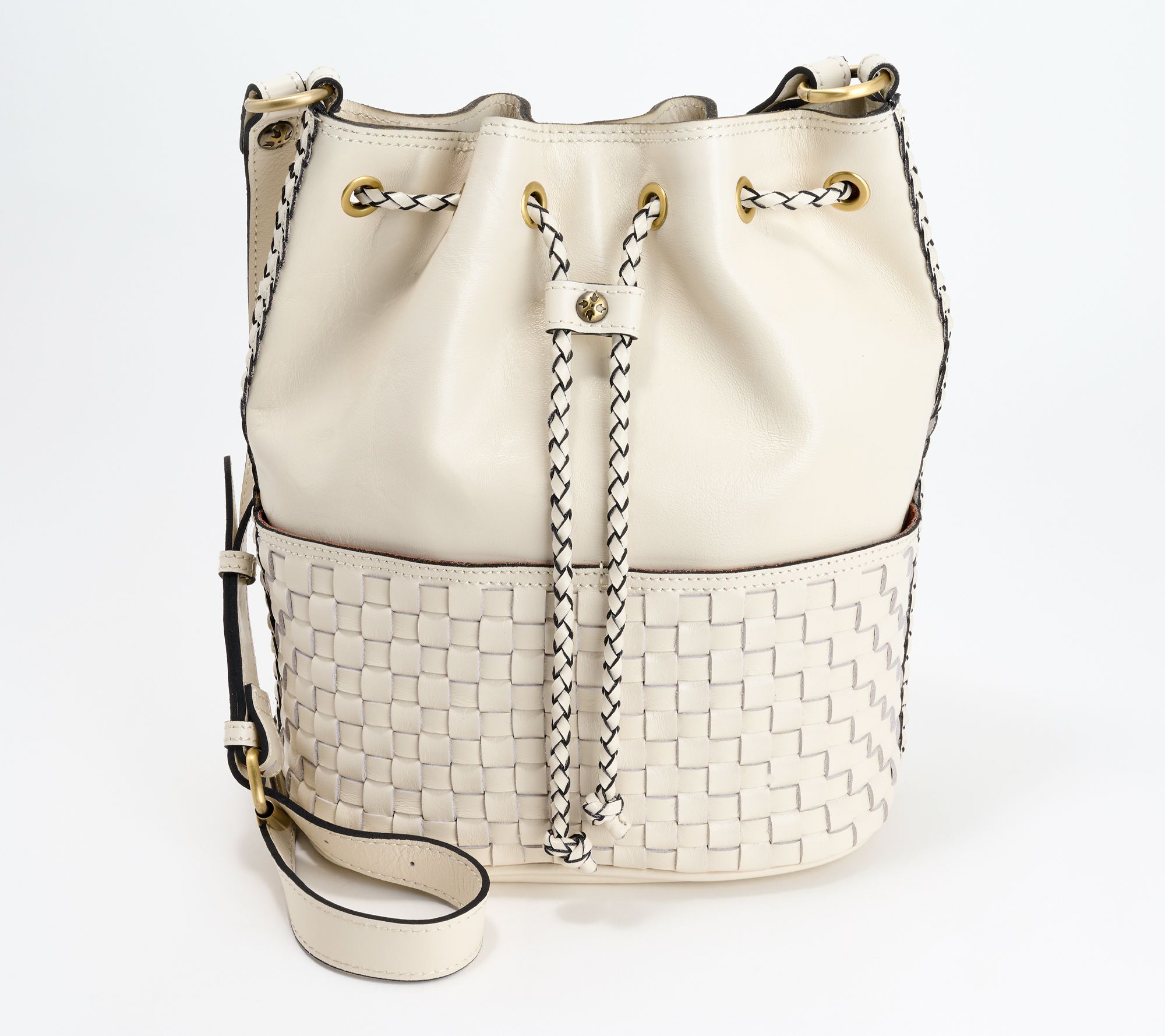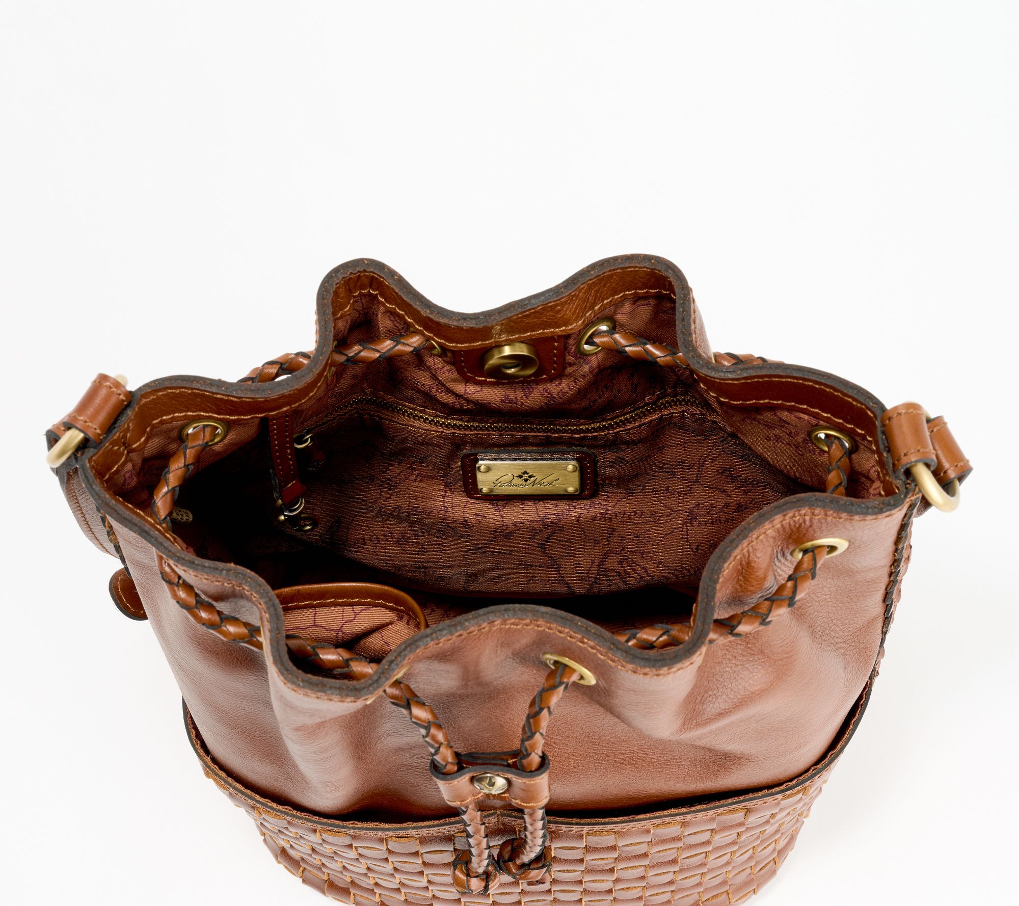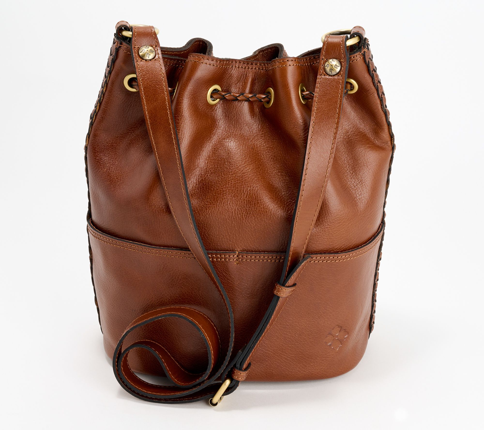 Drawstring with magnetic snap closure, metal logo plate, crossbody strap