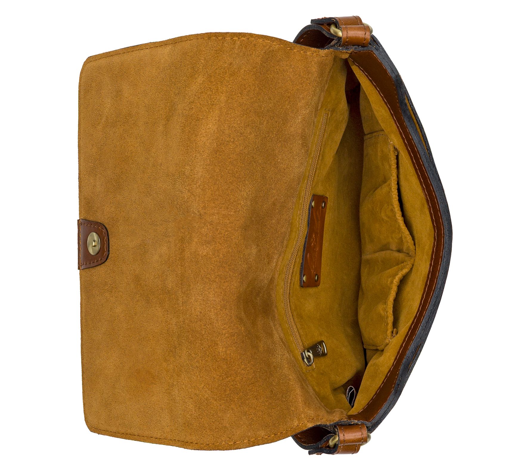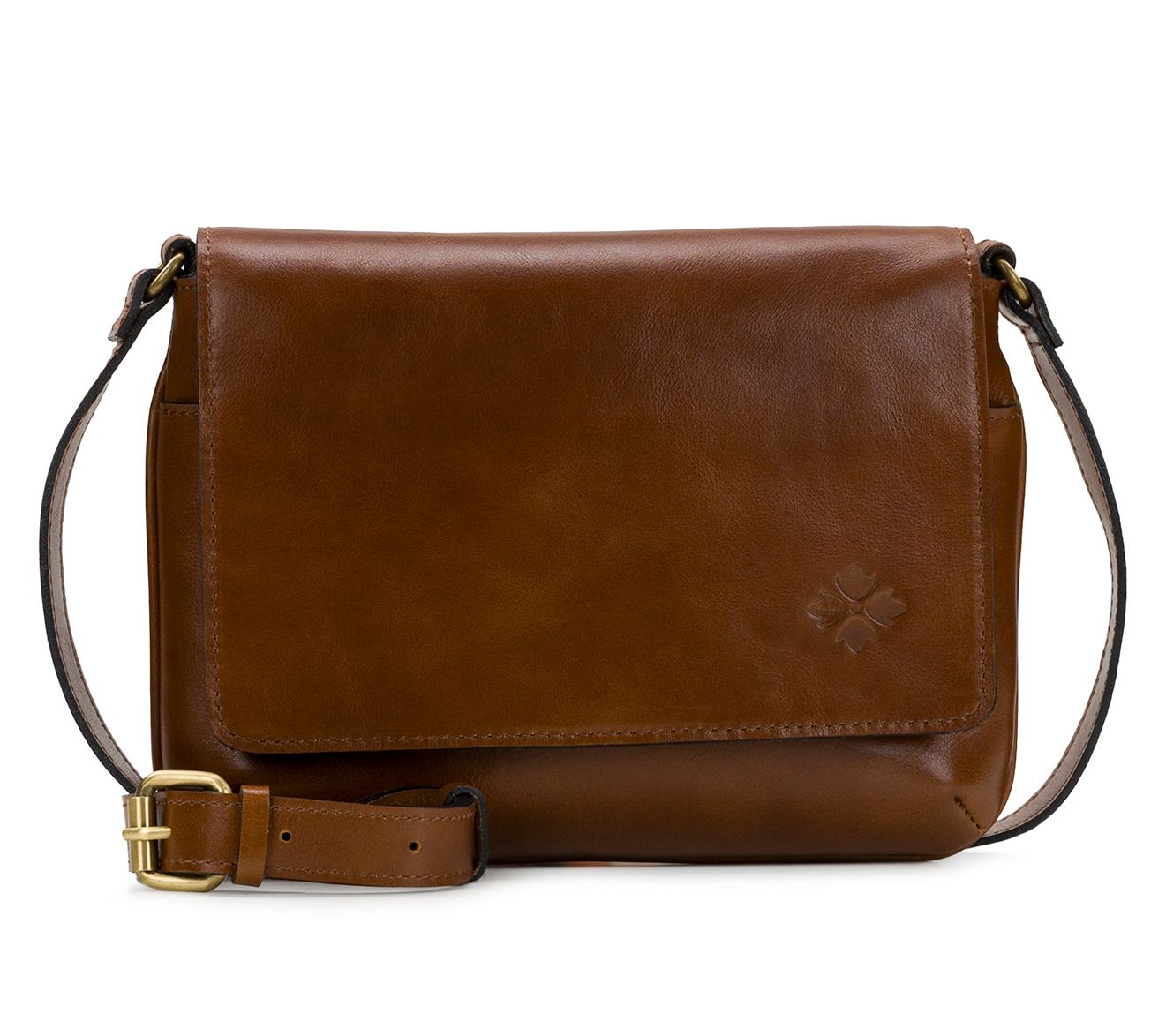 • Signature brushed brass hardware; magnetic snap flap closure; single adjustable strap; exterior pocket