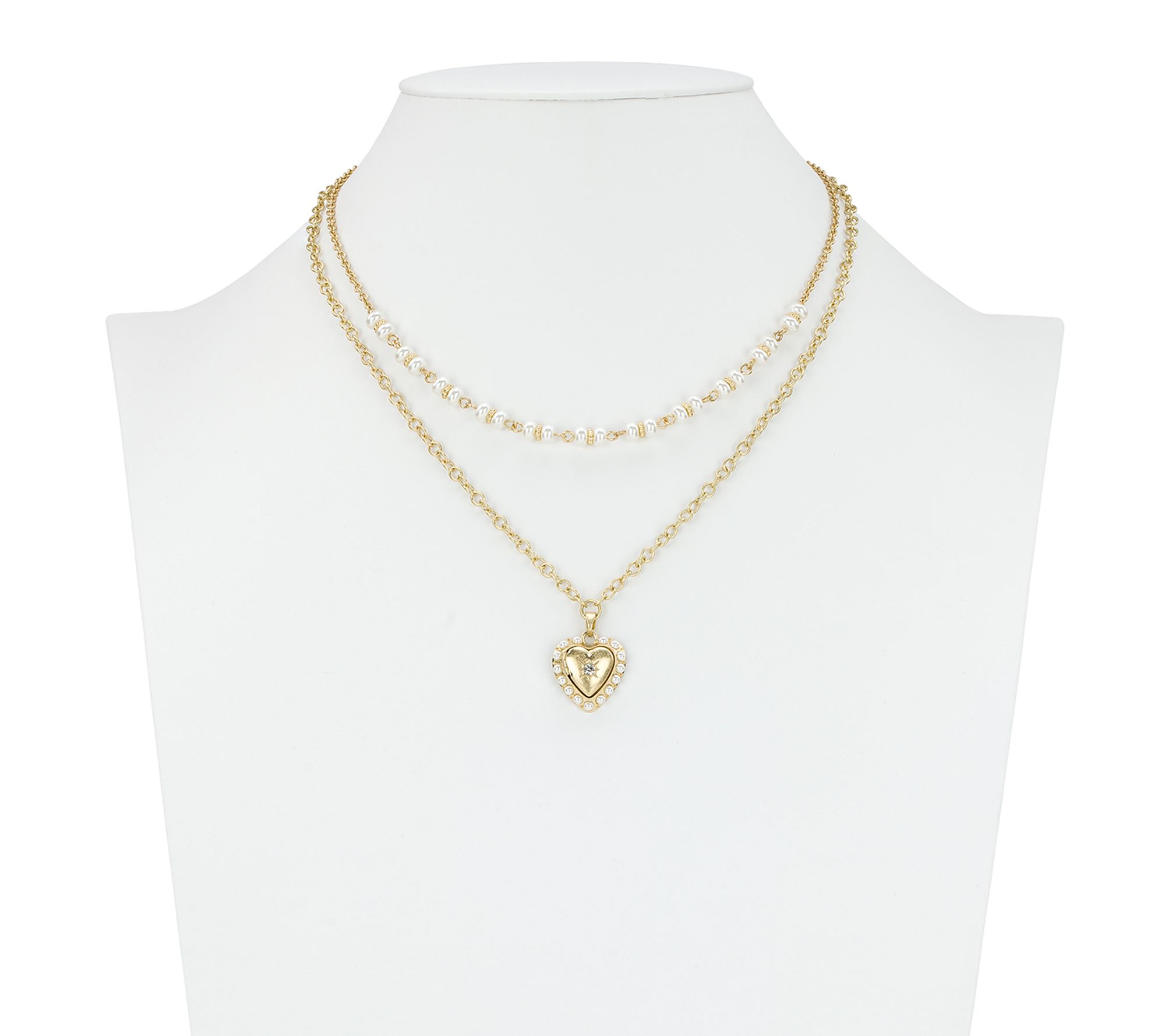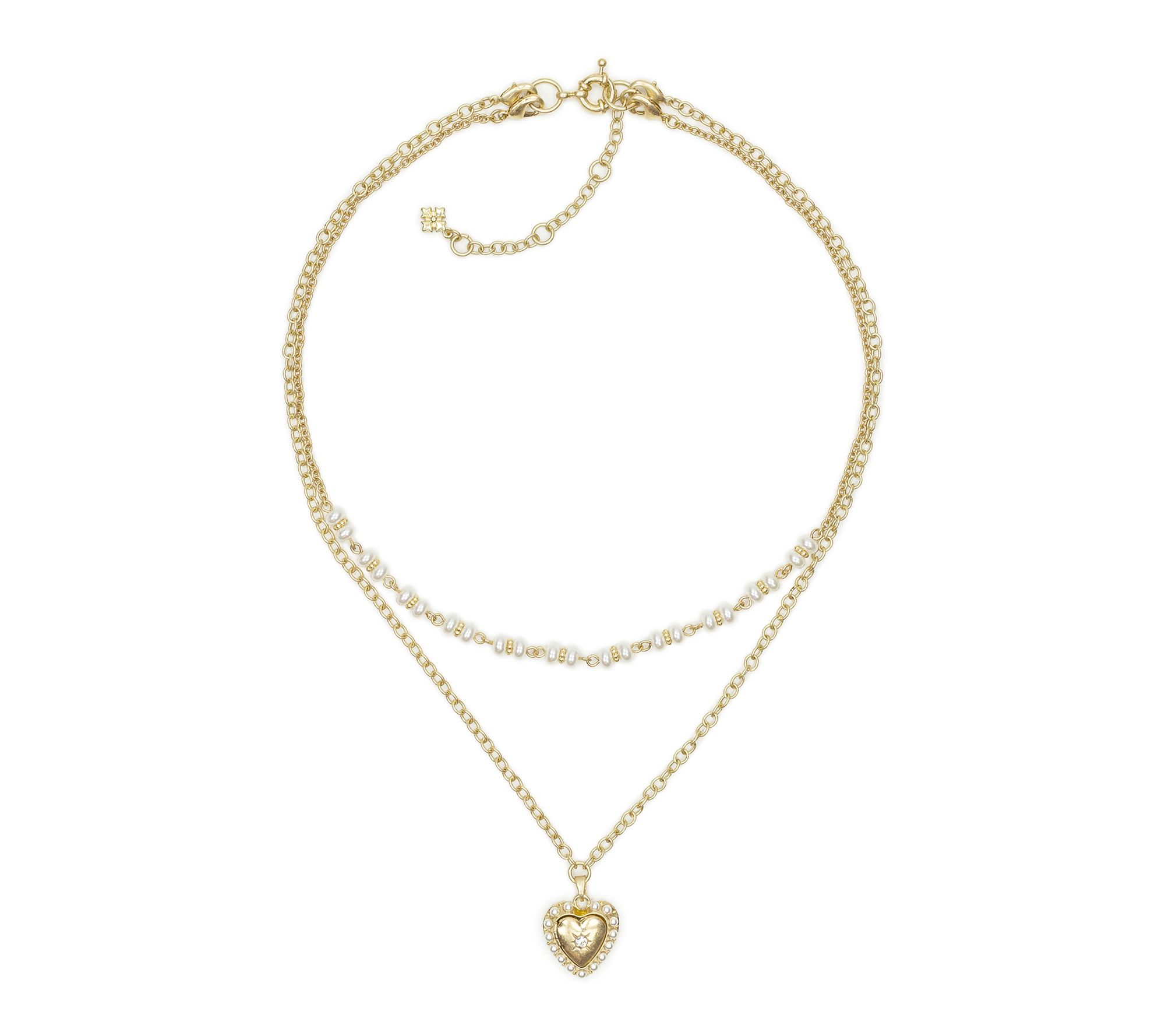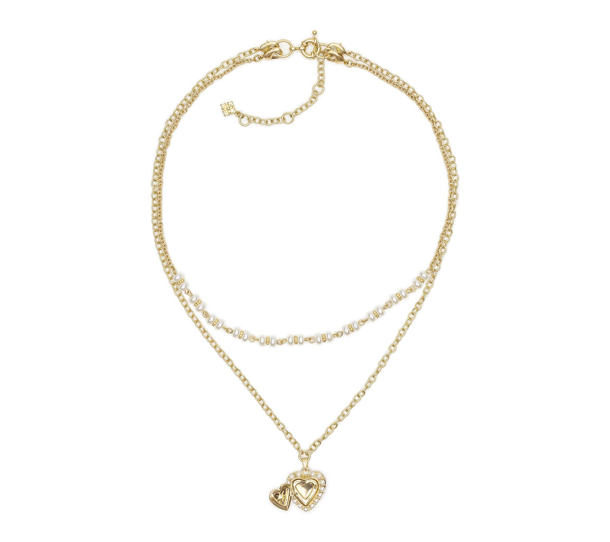 Celebrate special moments or elevate your everyday style with this double love locket modular necklace. Two graceful strands -- one classic, one featuring a charming heart pendant -- frame your neckline in elegance whether layered with a chic blouse or paired with a simple dress. From Patricia Nash.