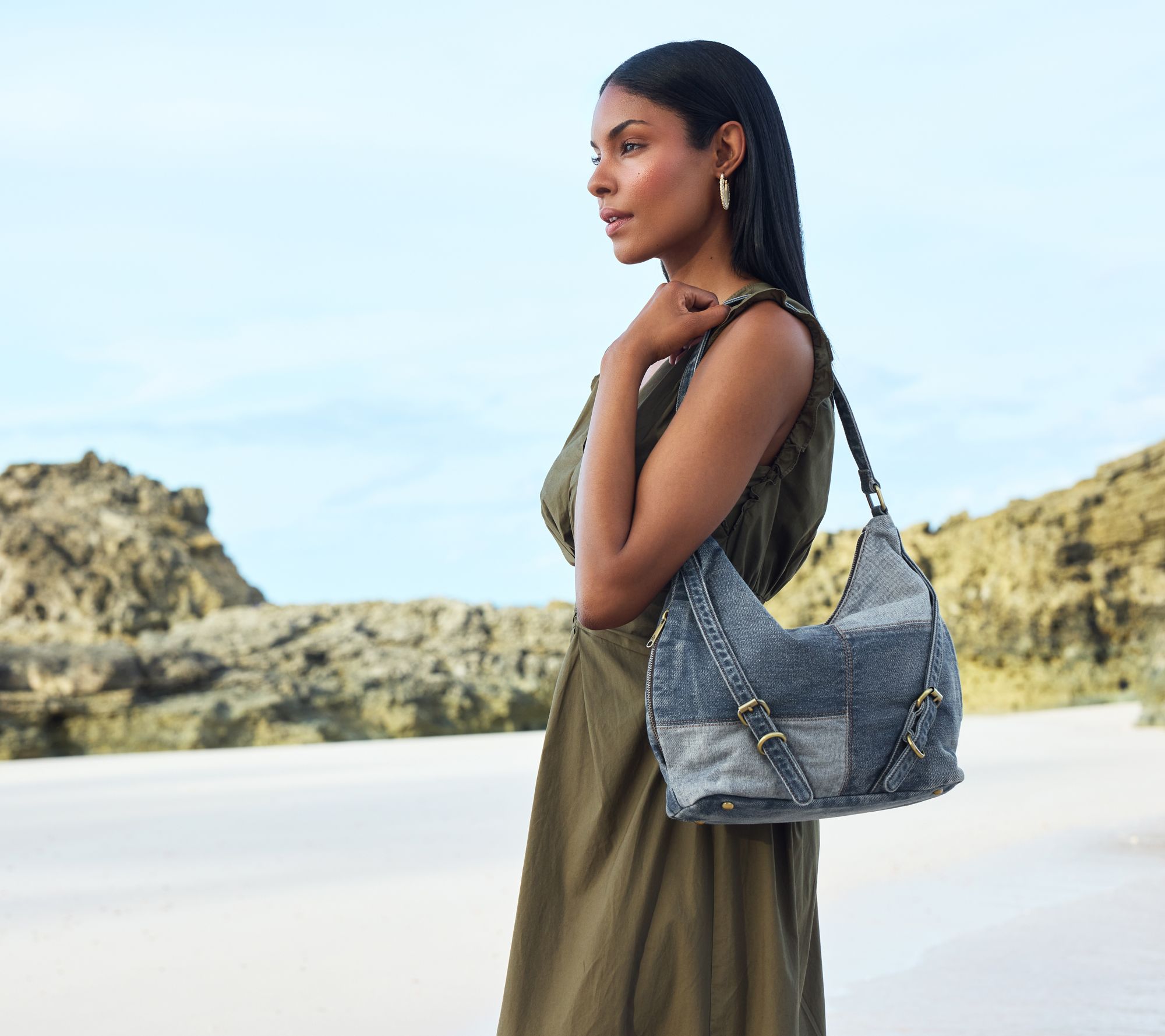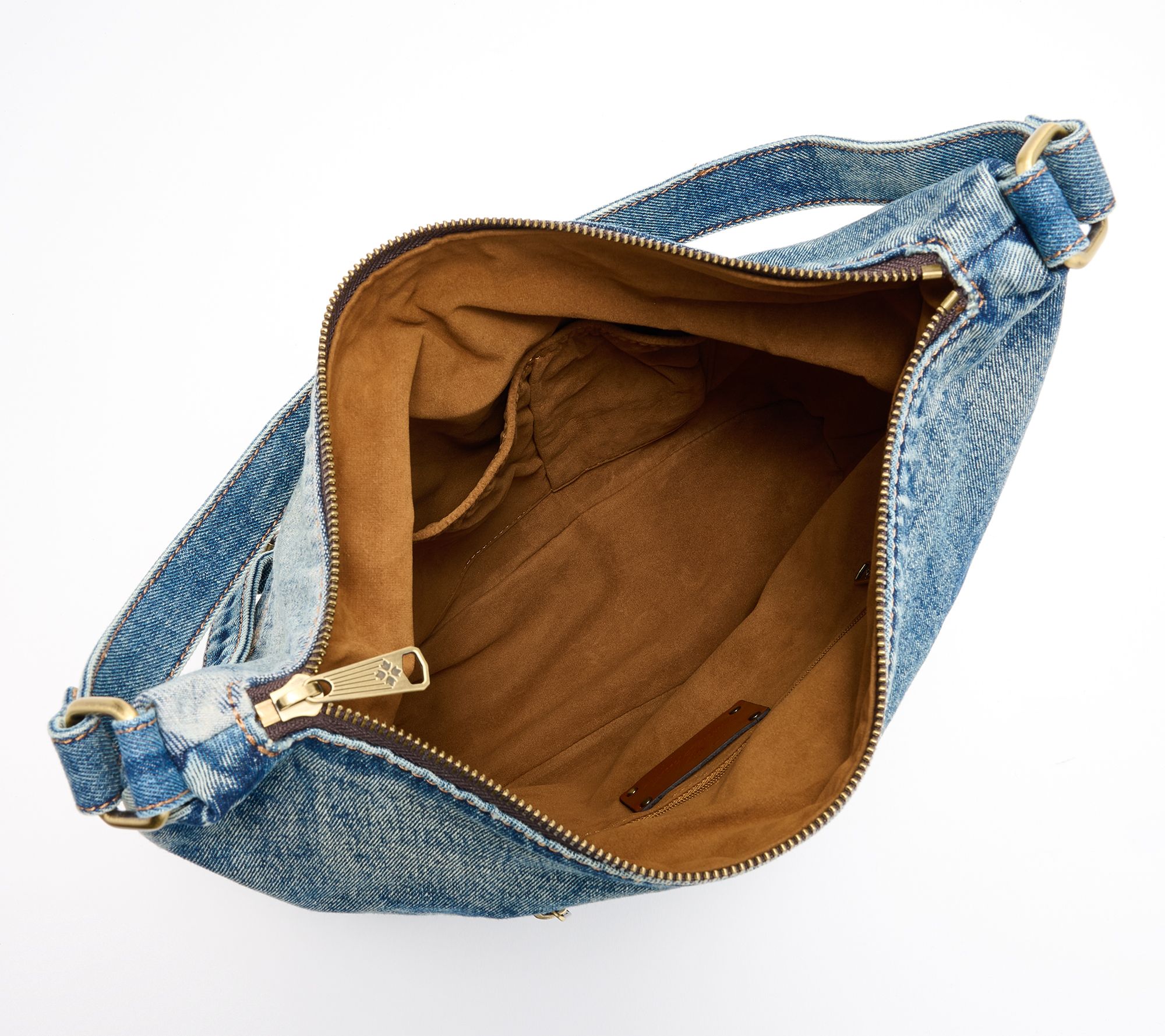 Denim body, hobo silhouette, zipper closure, rear zip pocket, two side zip pockets, top handle