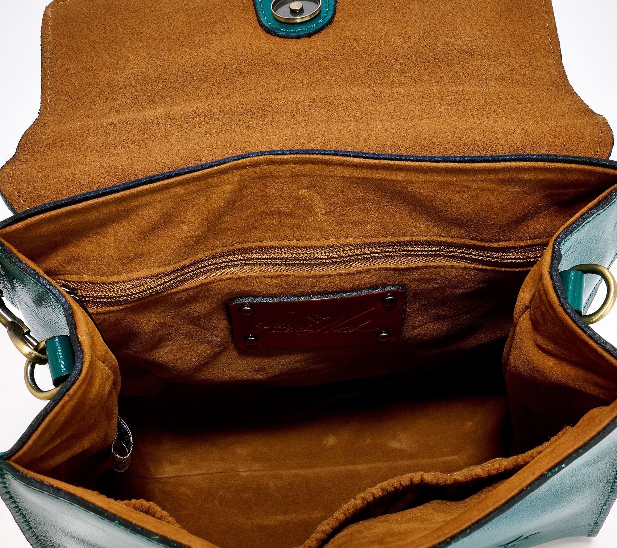 Velvety faux suede fabric lining, interior zip pocket, two slip pockets
