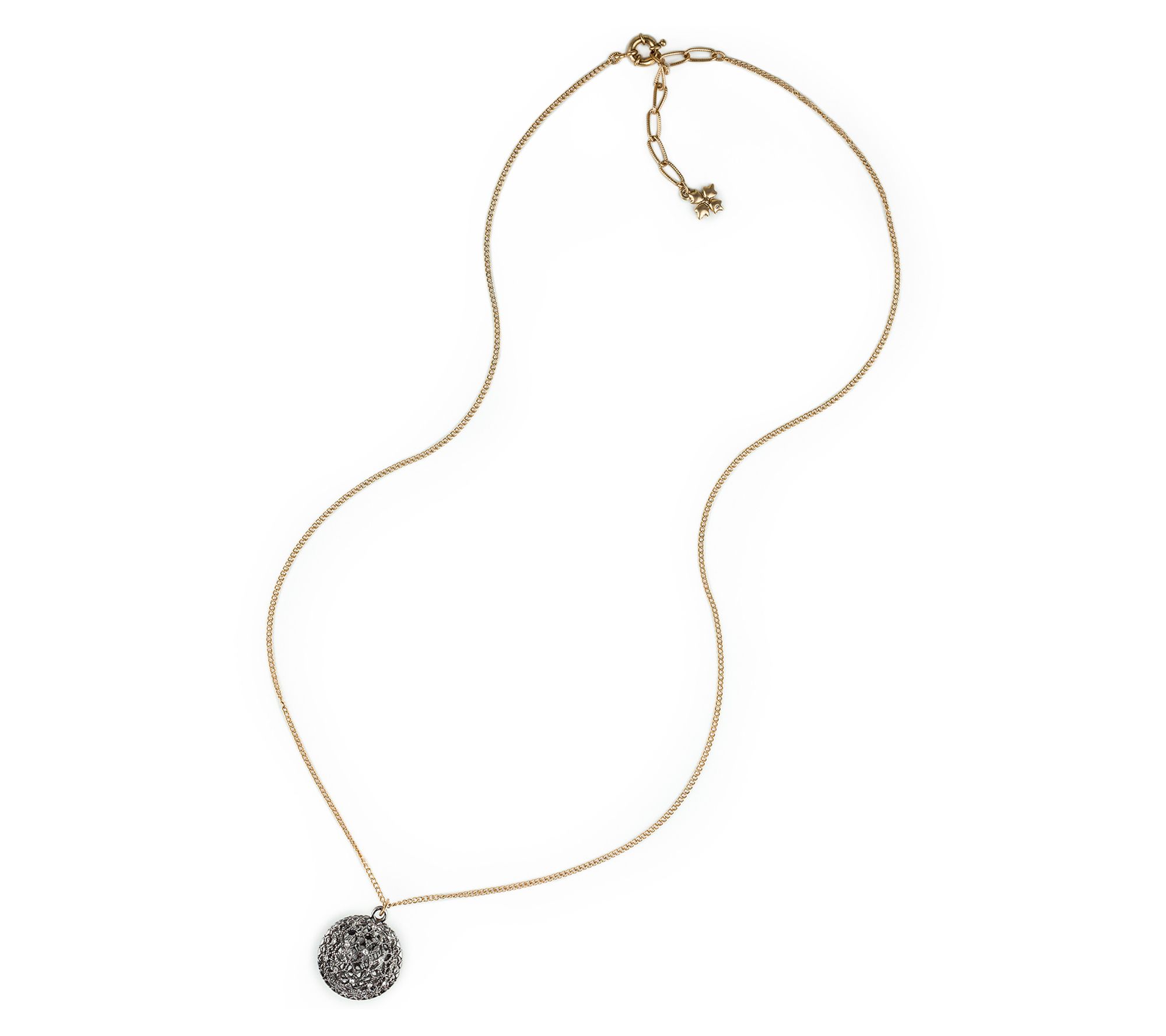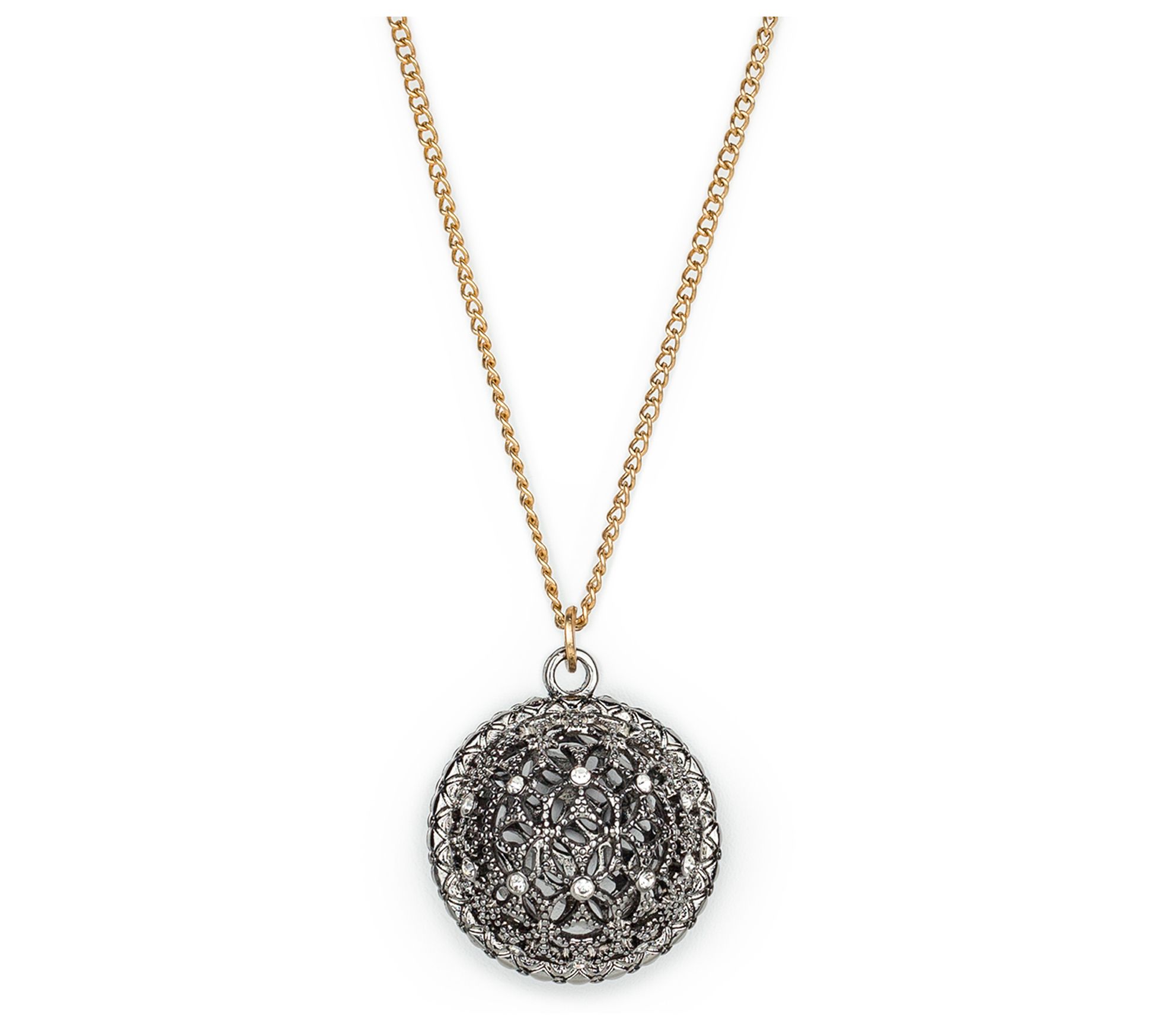 This globe pendant necklace elegantly showcases the timeless filigree technique, weaving intricate lace-like patterns into goldtone metal. Dress it up or down, this piece adds a sophisticated touch to your ensemble, seamlessly transitioning from day to night. Whether paired with a crisp blouse for the office or a simple tee for brunch, its bold yet delicate design makes it an ideal accessory. From Patricia Nash.