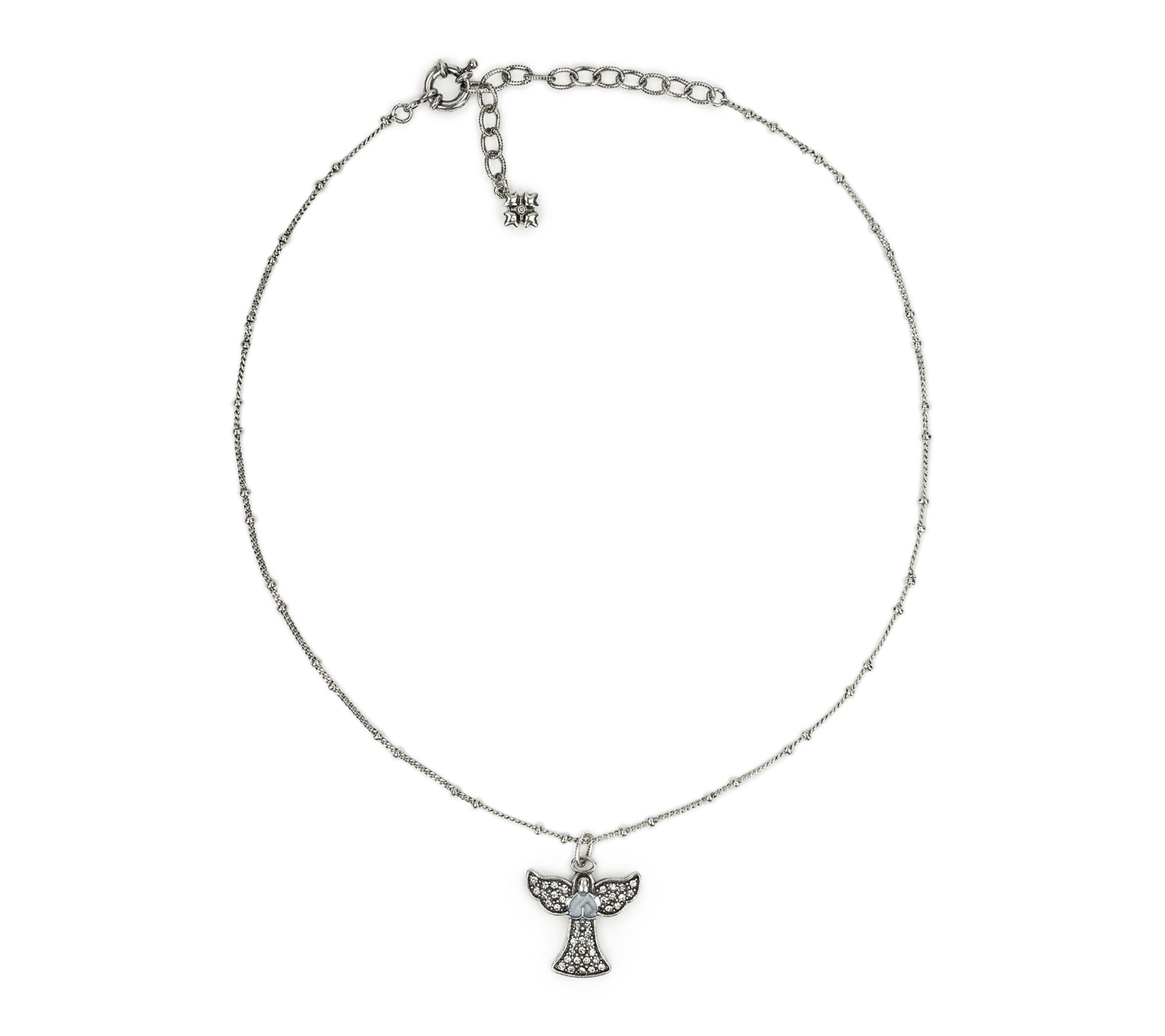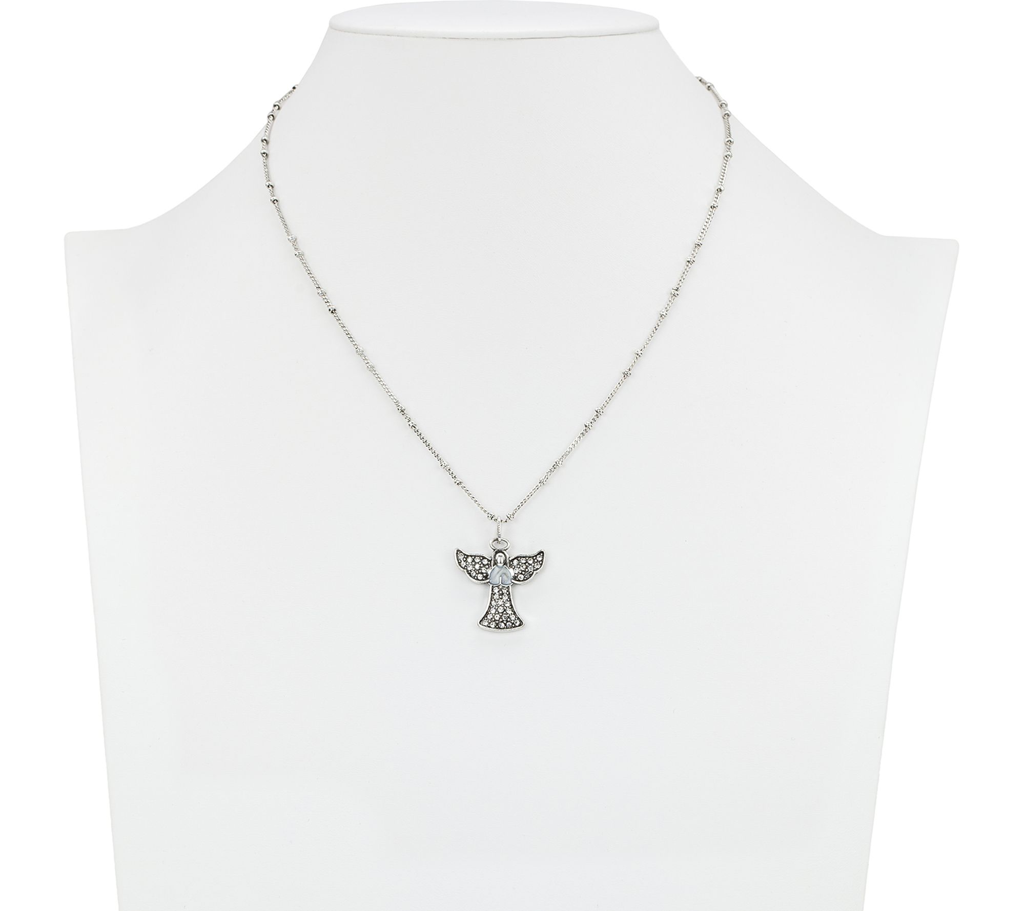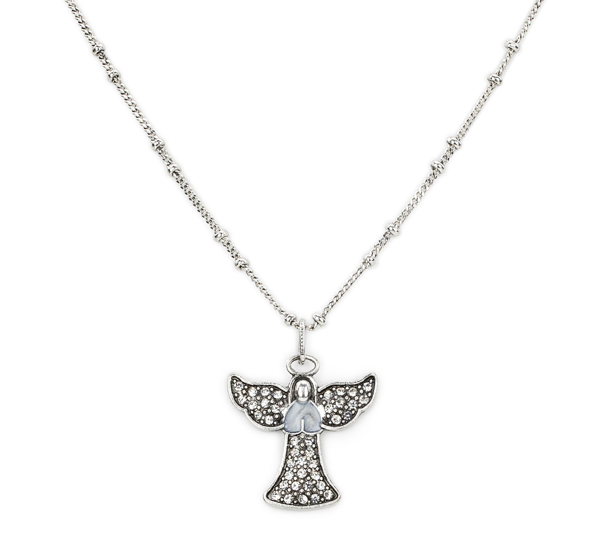 • Etched angel pendant; round simulated crystal pave accents; beaded curb link chain