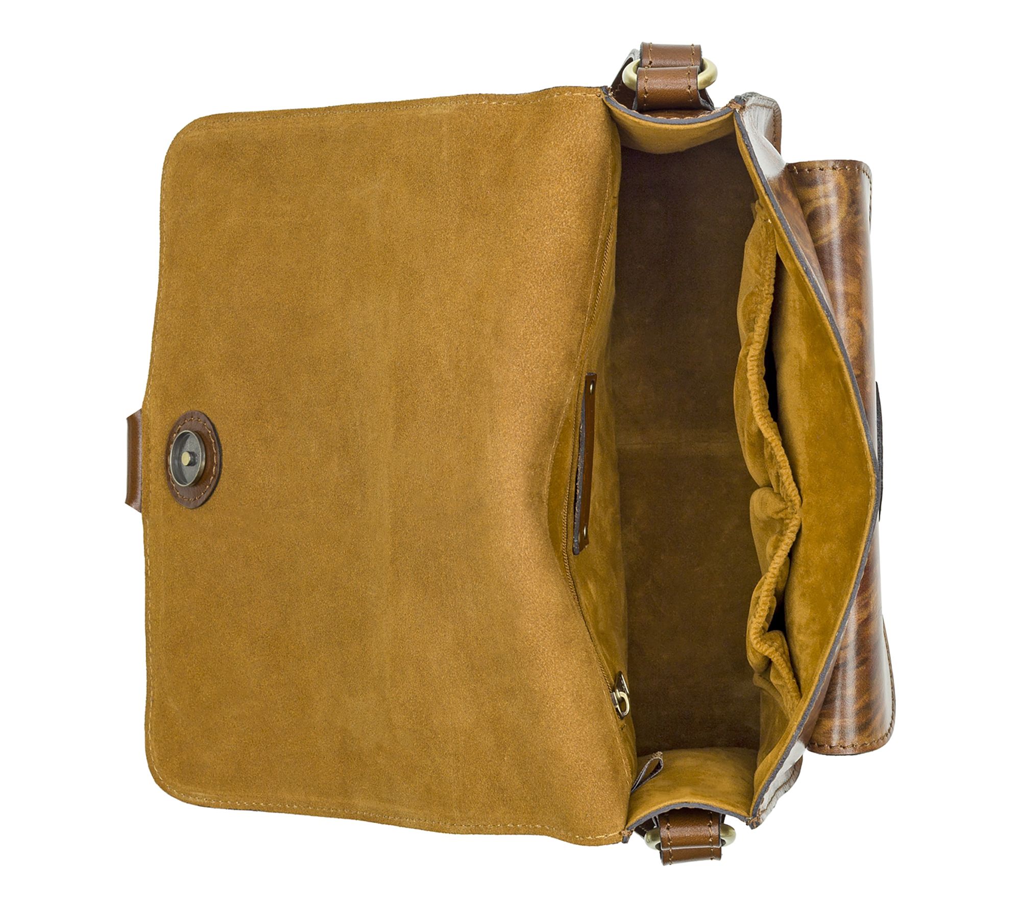 • Flap with magnetic snap closure, adjustable strap, rear slip pocket with magnetic snap closure, signature brushed brass hardware