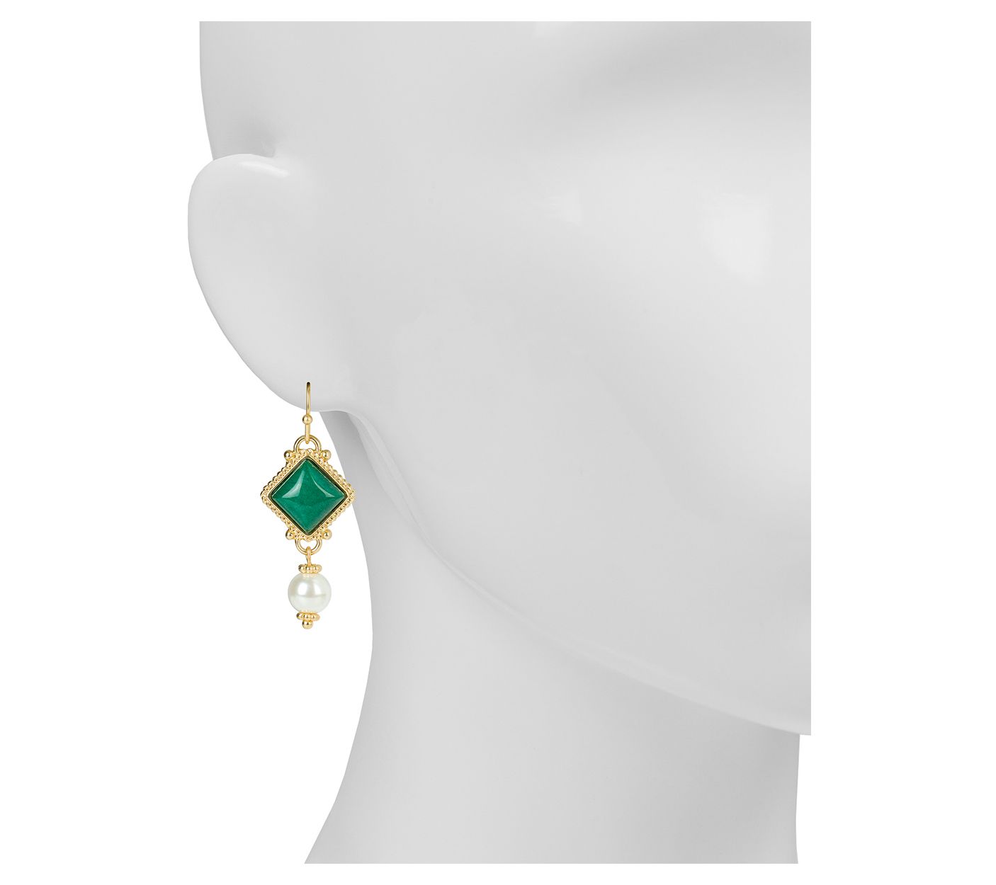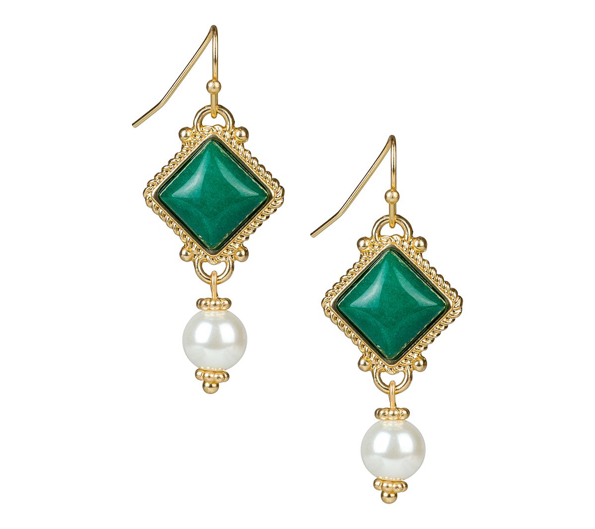 Add a touch of elegance to any outfit with these Patricia Nash dangle earrings. Featuring square cabochon jade paired with suspending simulated pearls, they create a colorful and sophisticated look. From Patricia Nash.