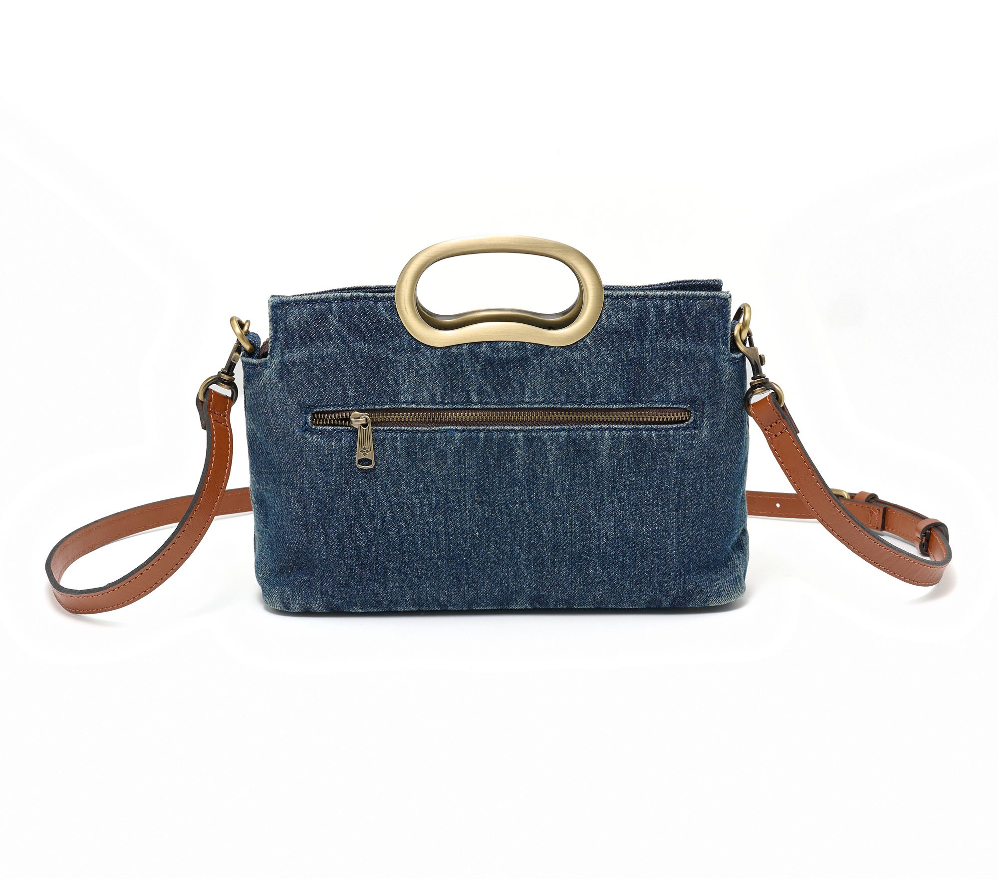 Zipper closure, brushed metal top handle, front slip pocket with magnetic snap, rear zip pocket, adjustable/detachable crossbody strap