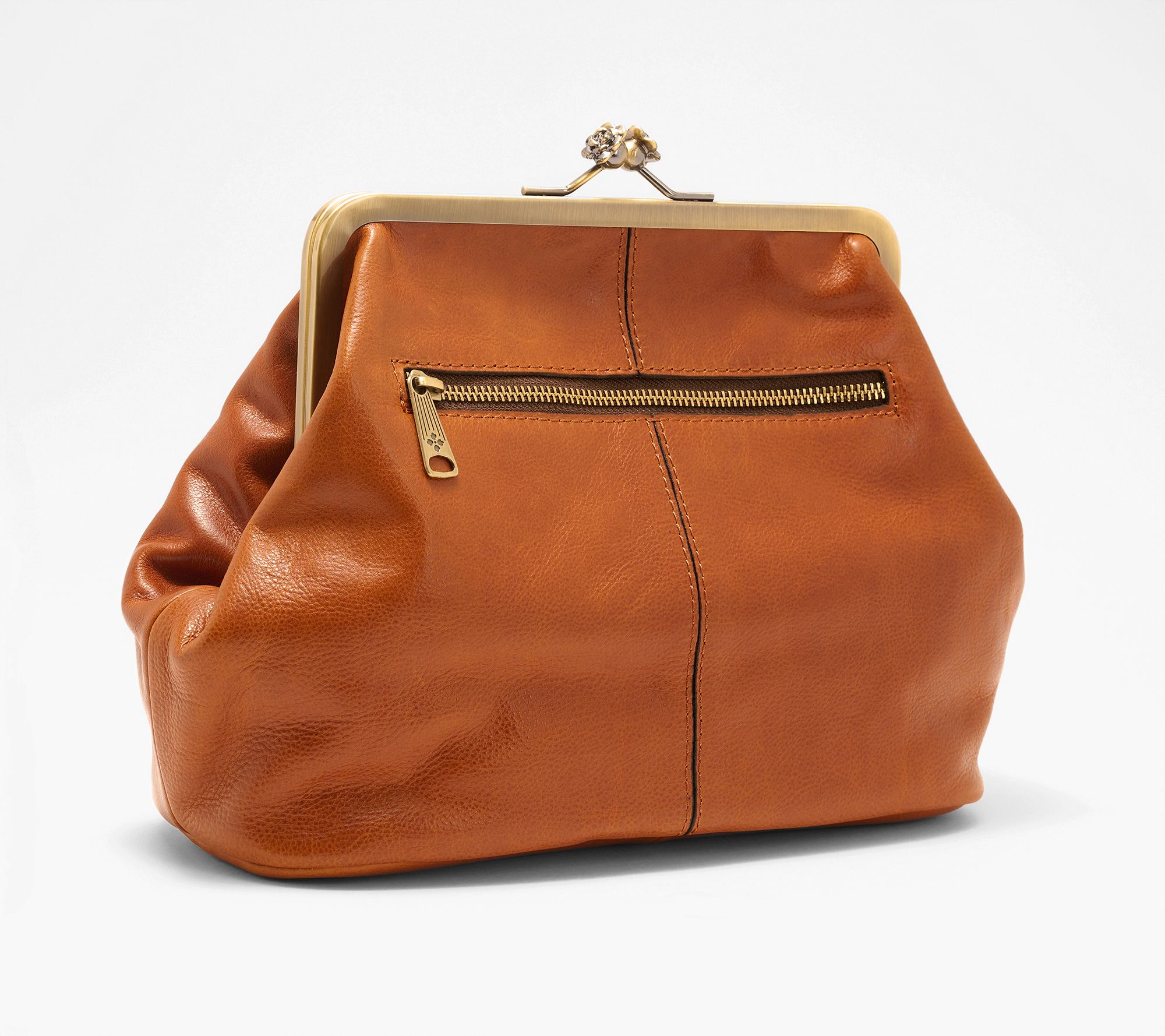 Full-grain leather body, removable and adjustable shoulder strap, kiss-lock closure, back zip pocket