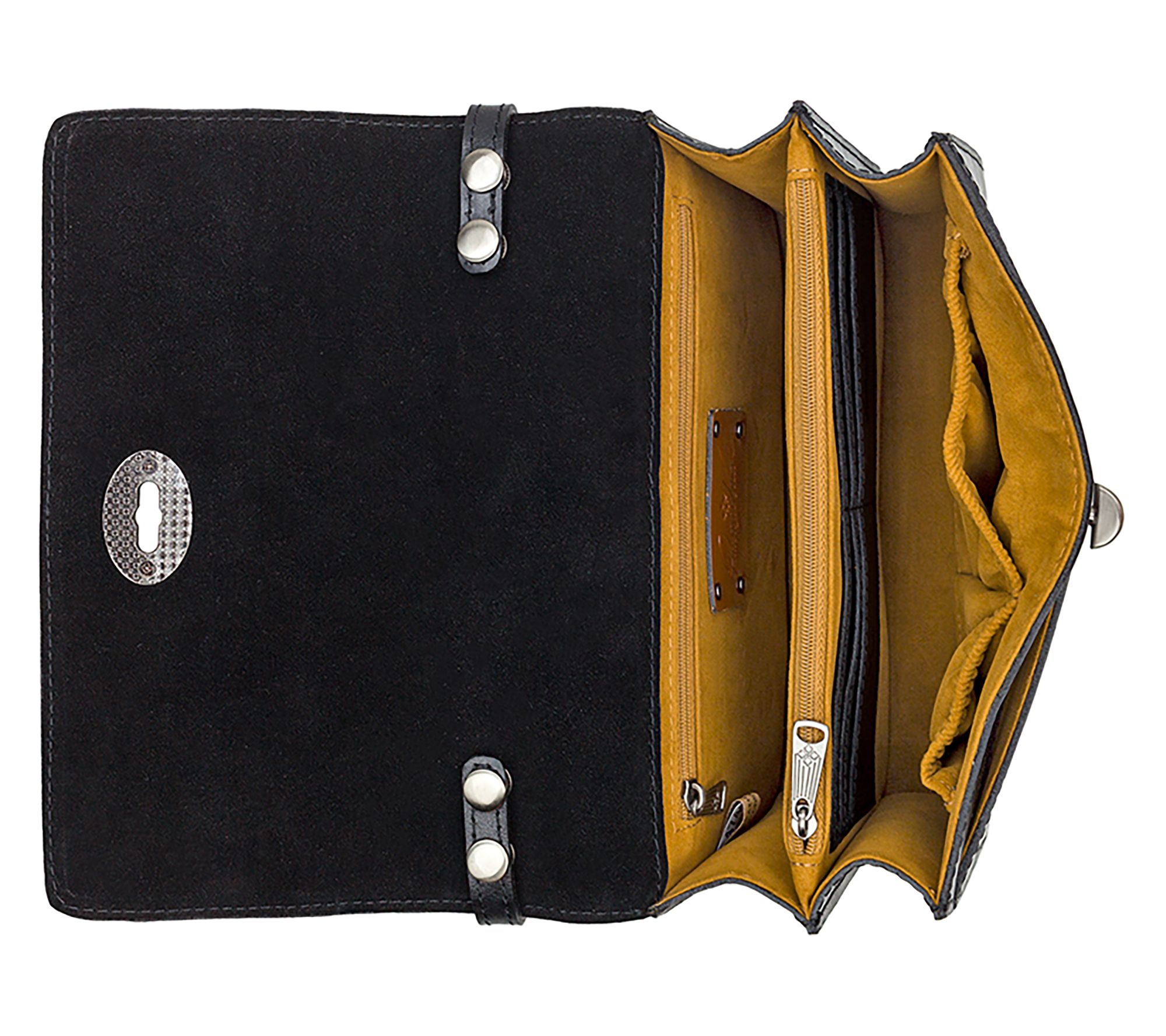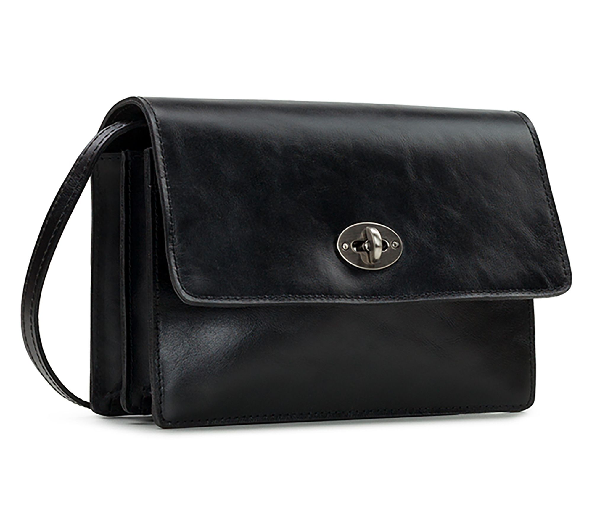 • Flap with turn-lock closure, adjustable strap, patch logo, goldtone hardware
