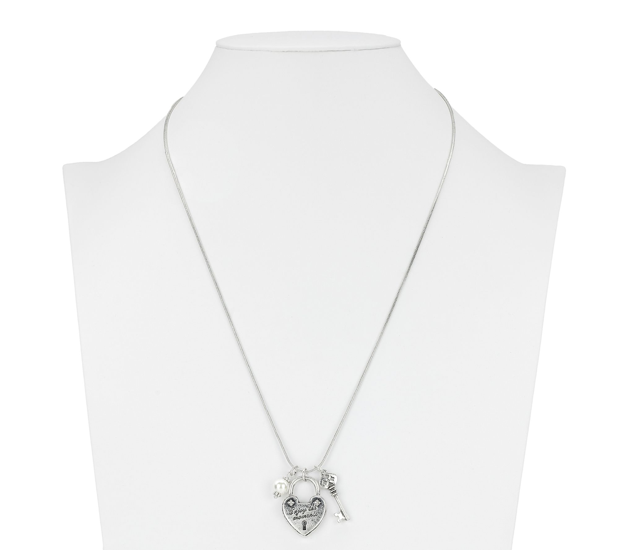 • Heart-shaped lock engraved with "Enjoy the moments"; key charm; luminous simulated pearl bead accent; bezel-set crystal