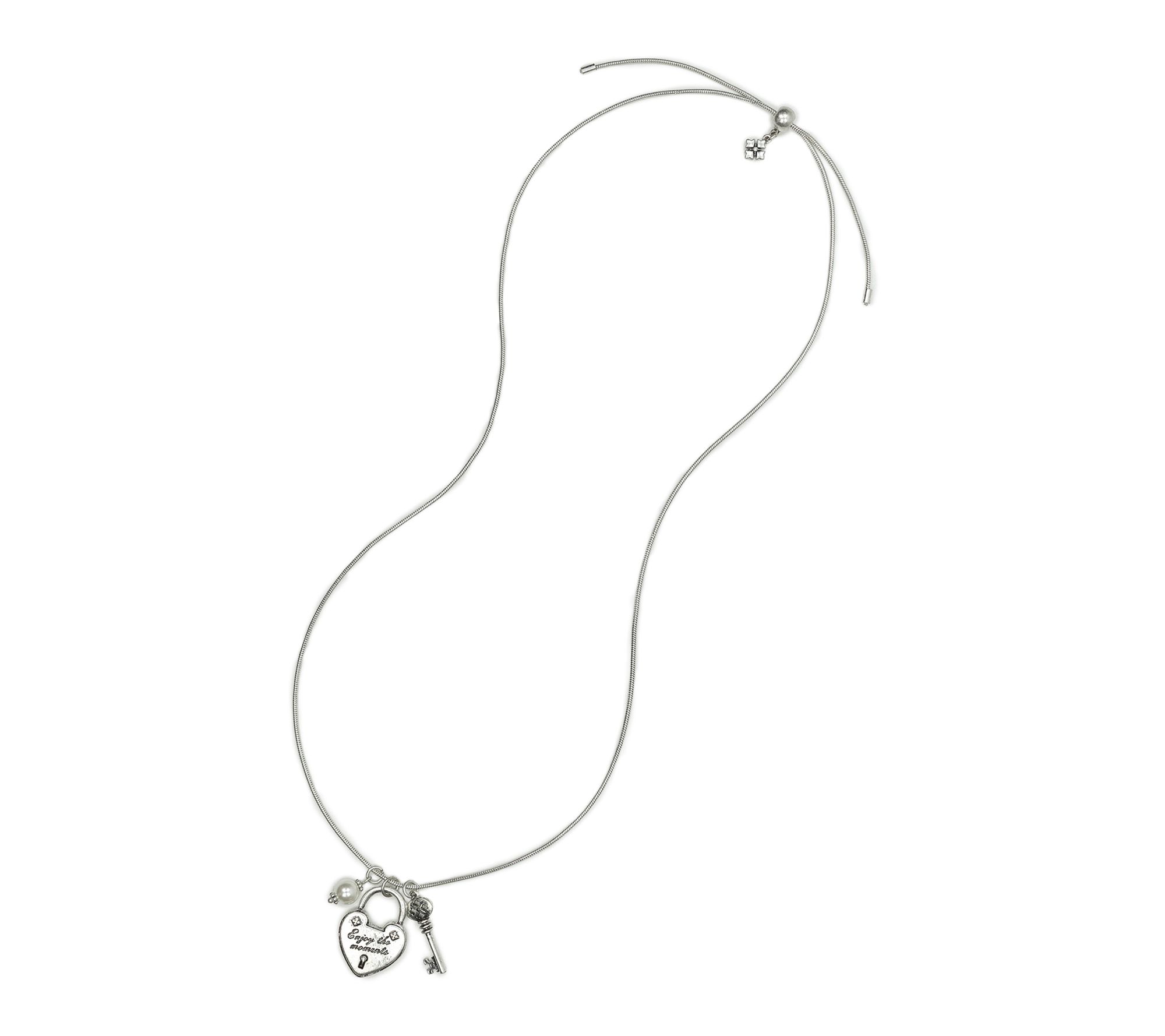 Commemorate life's sweetest little moments with this sentimental necklace -- a heart-shaped lock engraved with "Enjoy the moments," accented by a tiny key charm and a luminous simulated pearl. The delightful blend of playful and meaningful details makes it a lovely everyday accessory, whether layered or worn solo. From Patricia Nash.
