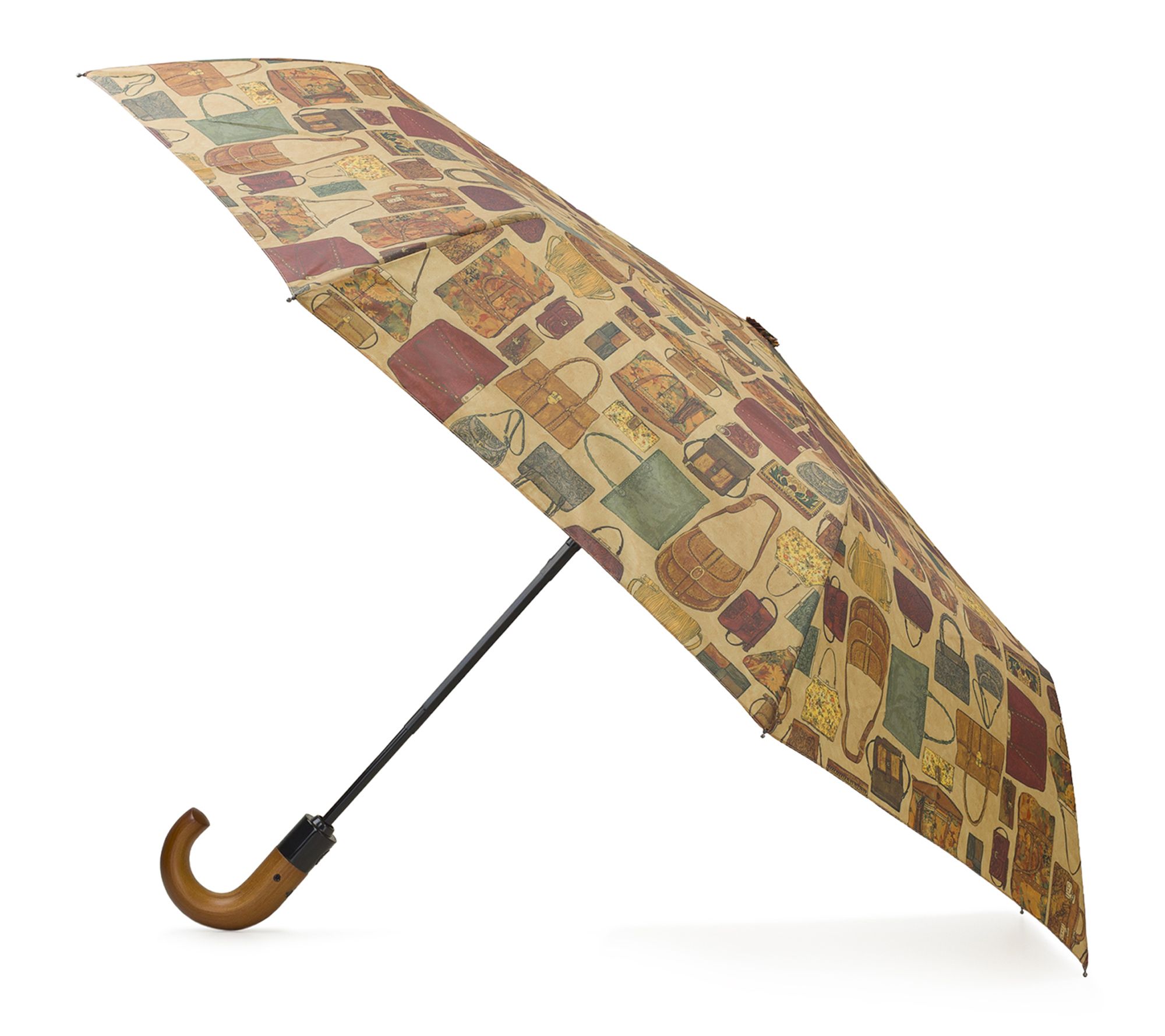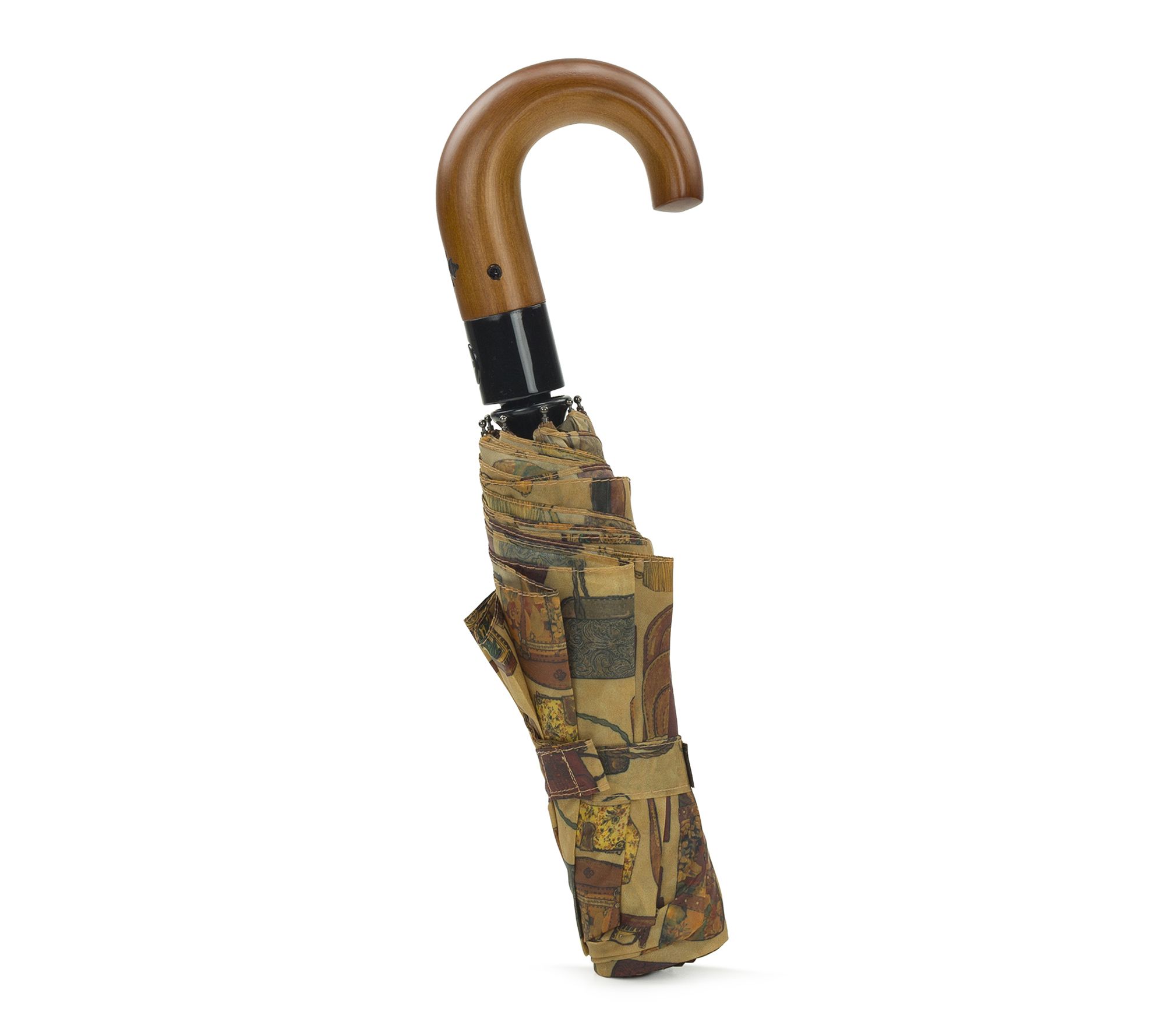 Stay dry in style whenever the forecast turns with this compact umbrella, featuring the vibrant Patricia's Closet print. Its push-button auto open and solid curved wood handle make it easy to use on the go, while the wrap-around strap and protective sleeve keep it neat and ready in your bag. From Patricia Nash.