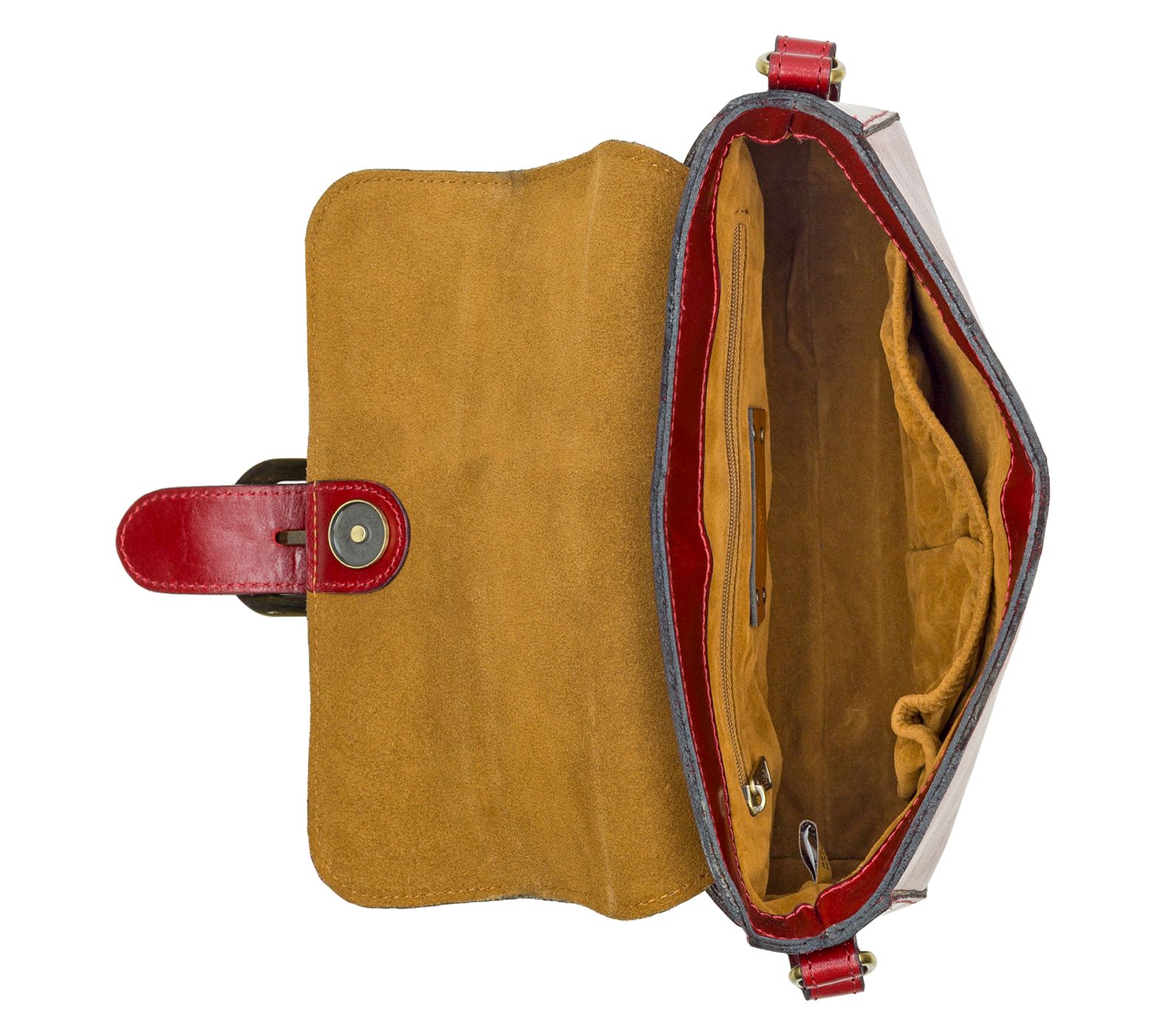 • Flap with magnetic snap closure, rear slip pocket, signature brushed metal hardware