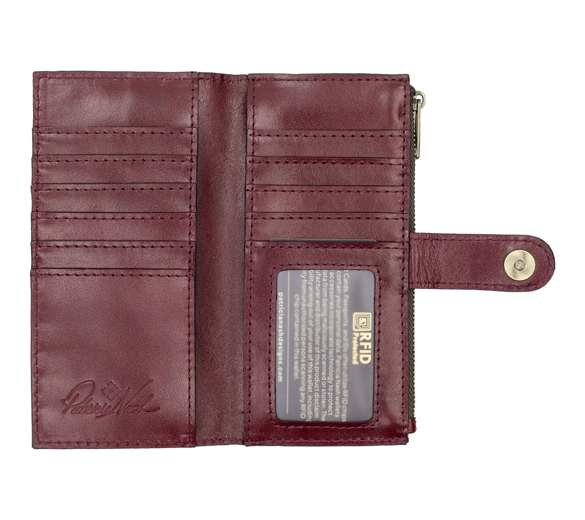 • Interior features 10 credit card slots, 1 ID window, 2 bill pockets, 1 zip coin pocket; leather trim; deep embossed logo; nylon and faux suede lining; 100% polyester