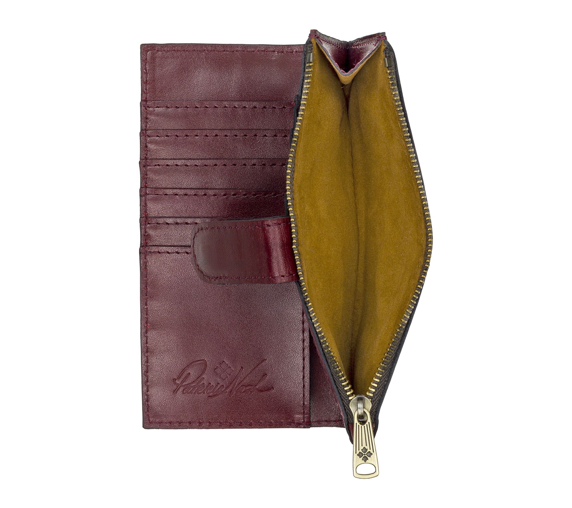 • Snap closure; deep embossed grape leaf floret logo; burned edge finish; signature brushed brass hardware